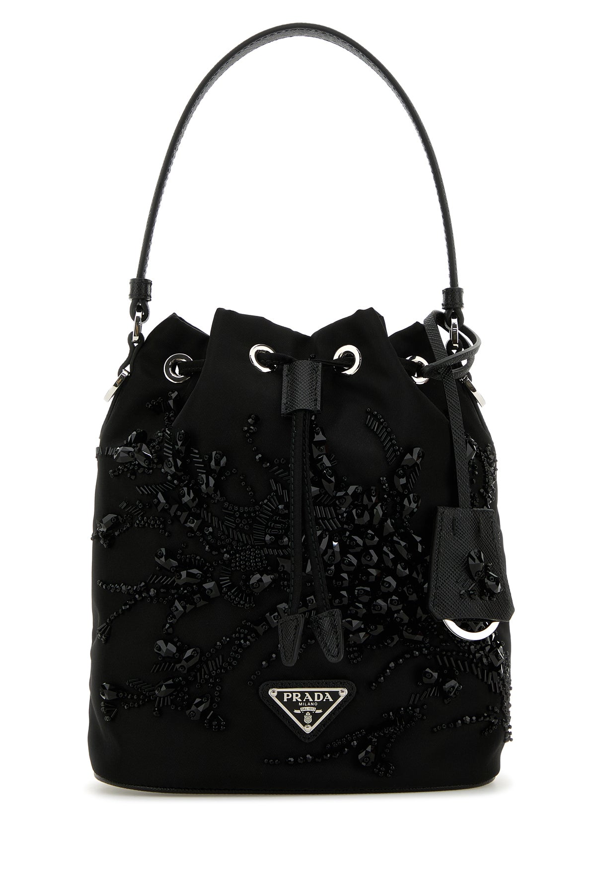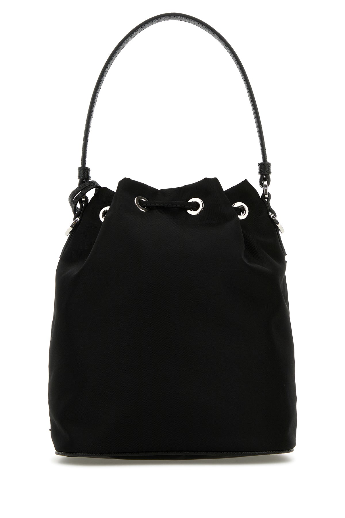 Borsa a secchiello realizzata in nylon arricchita da iconico triangolo metallico logato sulla parte frontale.
