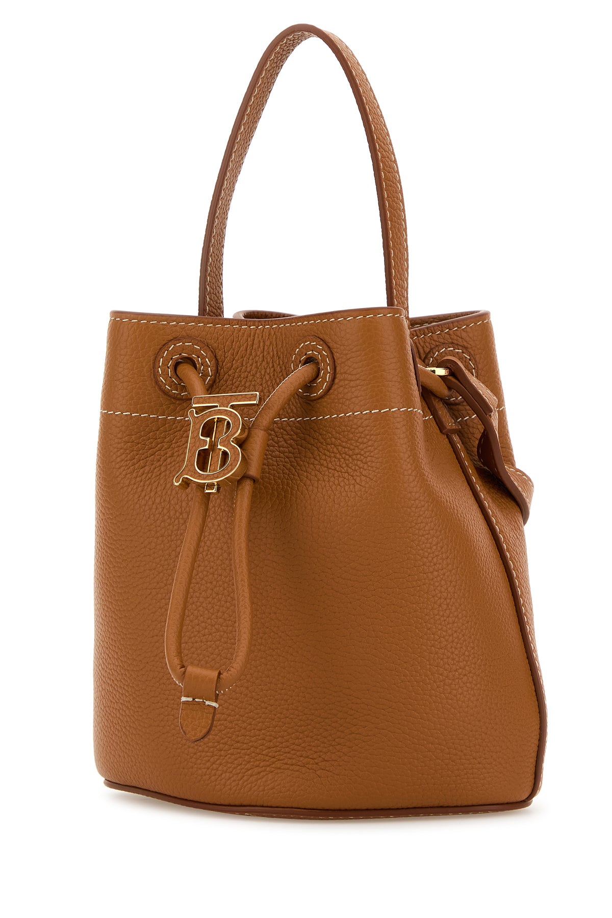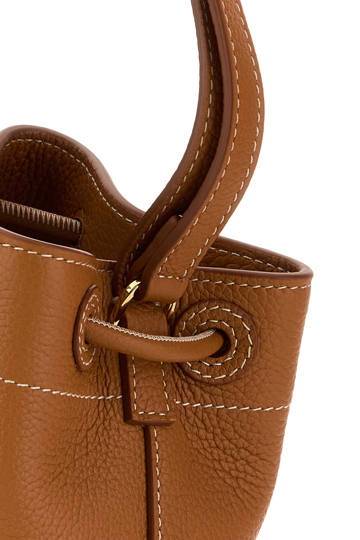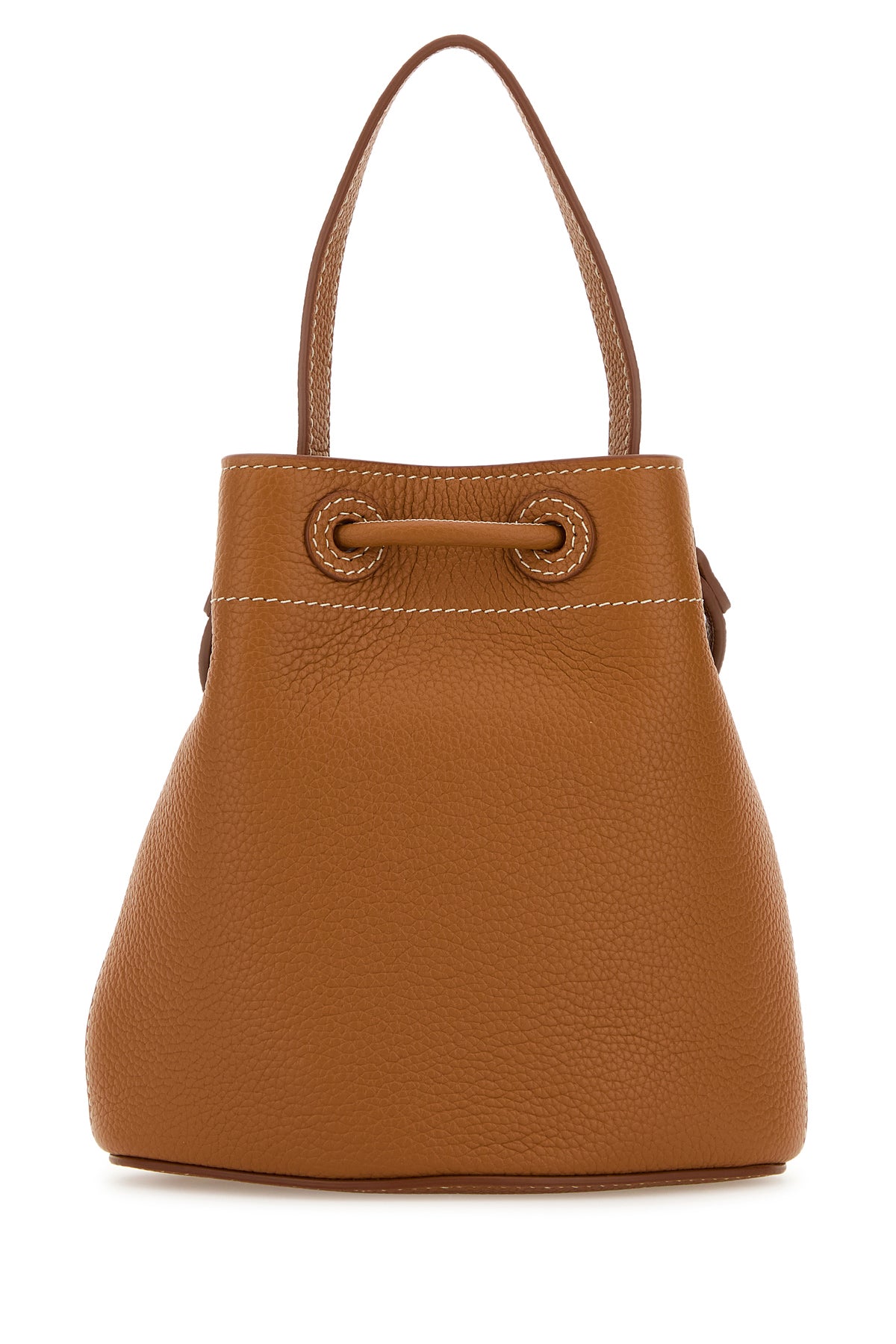 Borsa a secchiello realizzata in pelle di vitello martellata arricchita da dettaglio metallico logato. - Un manico piatto in pelle tonale