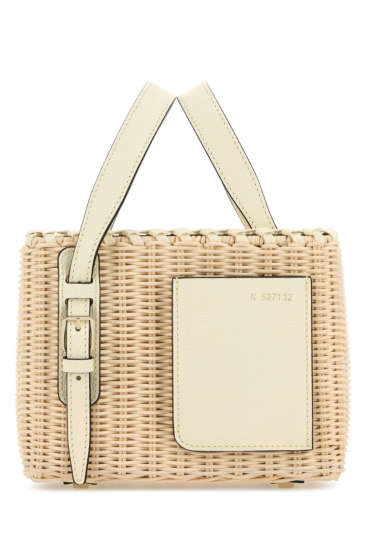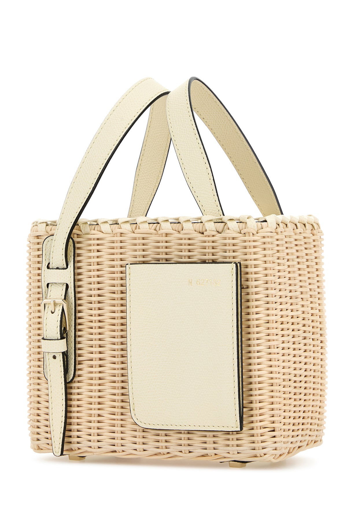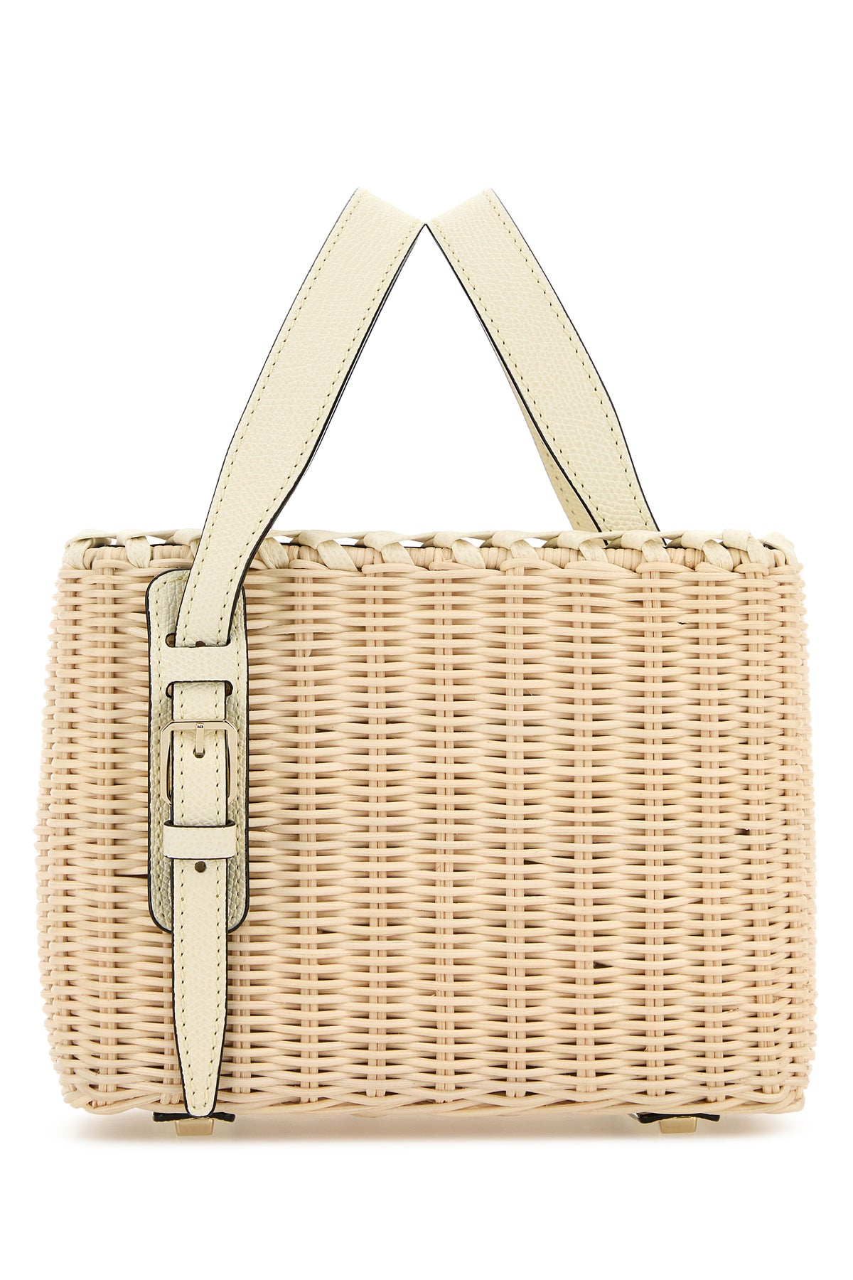 Borsa a secchiello realizzata in vimini arricchita da tasca in pelle applicata sulla parte frontale.