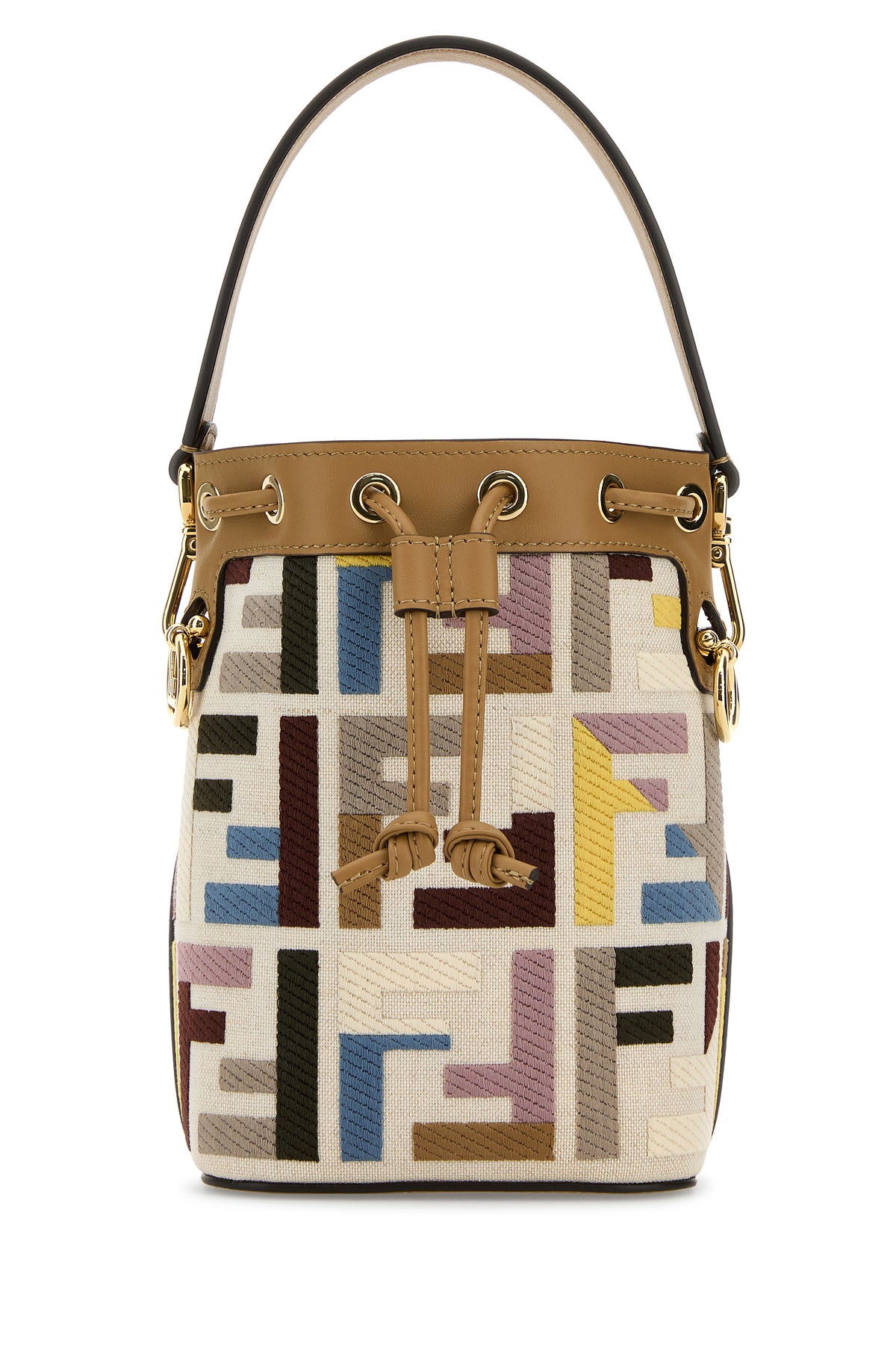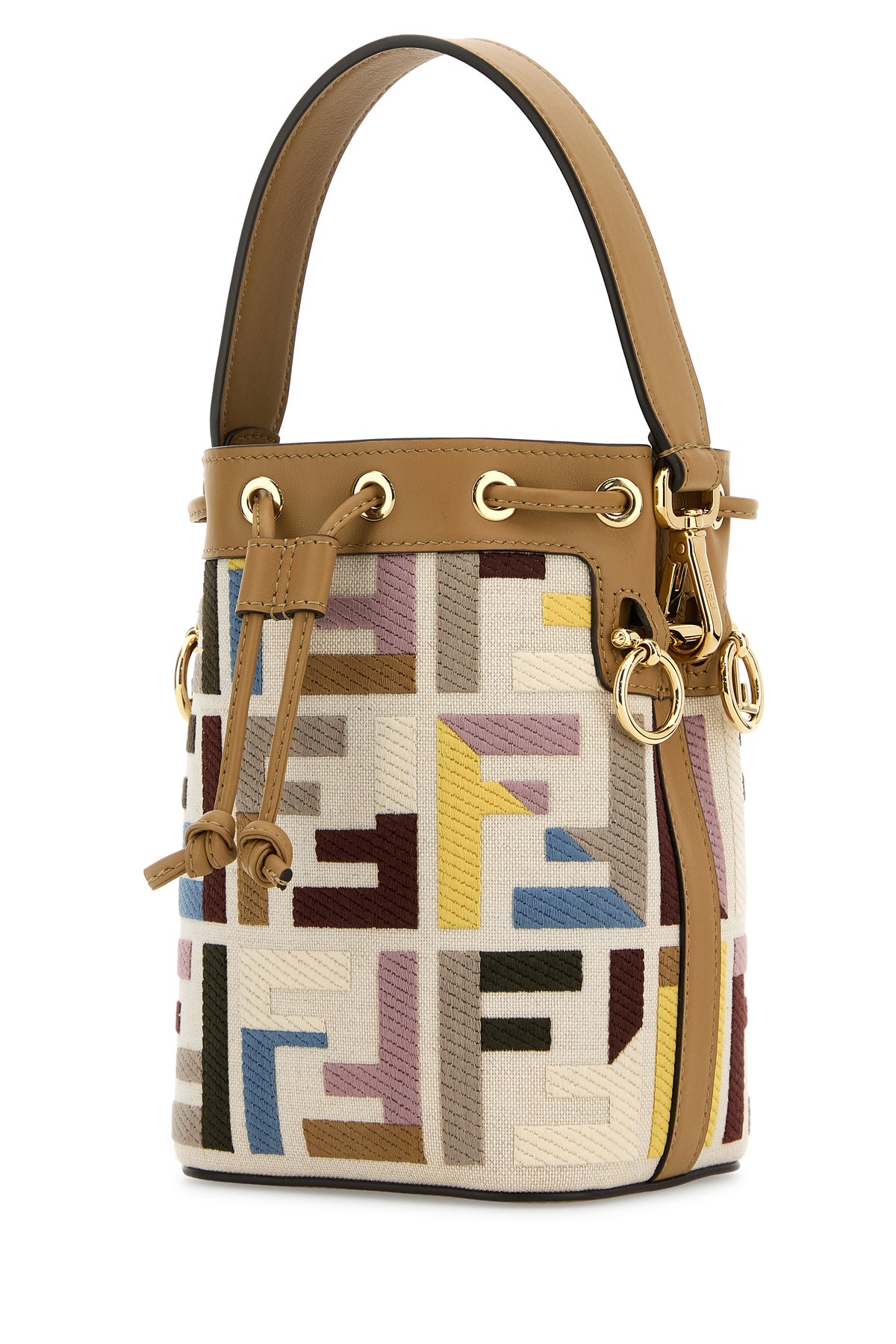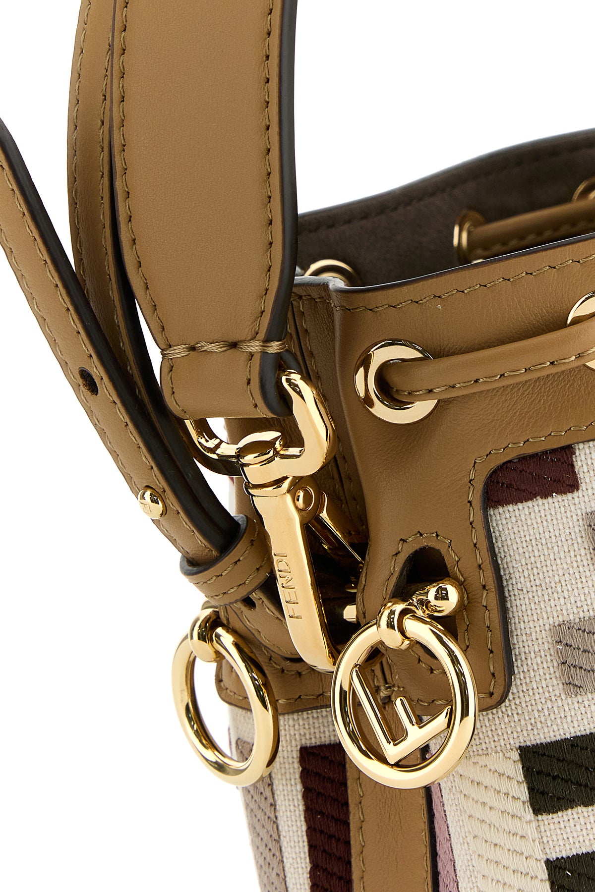 Borsa a secchiello realizzata in tela con profilature in pelle liscia caratterizzata da stampa a motivo FF su tutta la superficie e logo stampato laminato sulla parte frontale arricchita da dettagli metallici logati.
