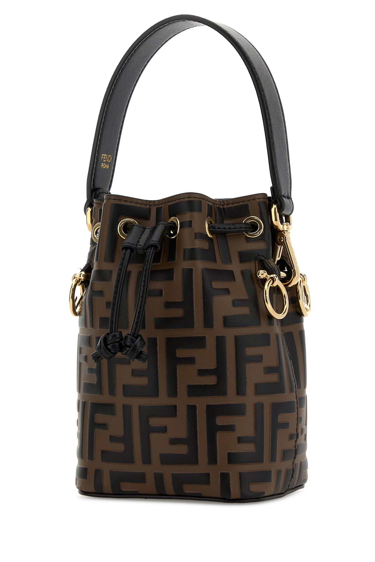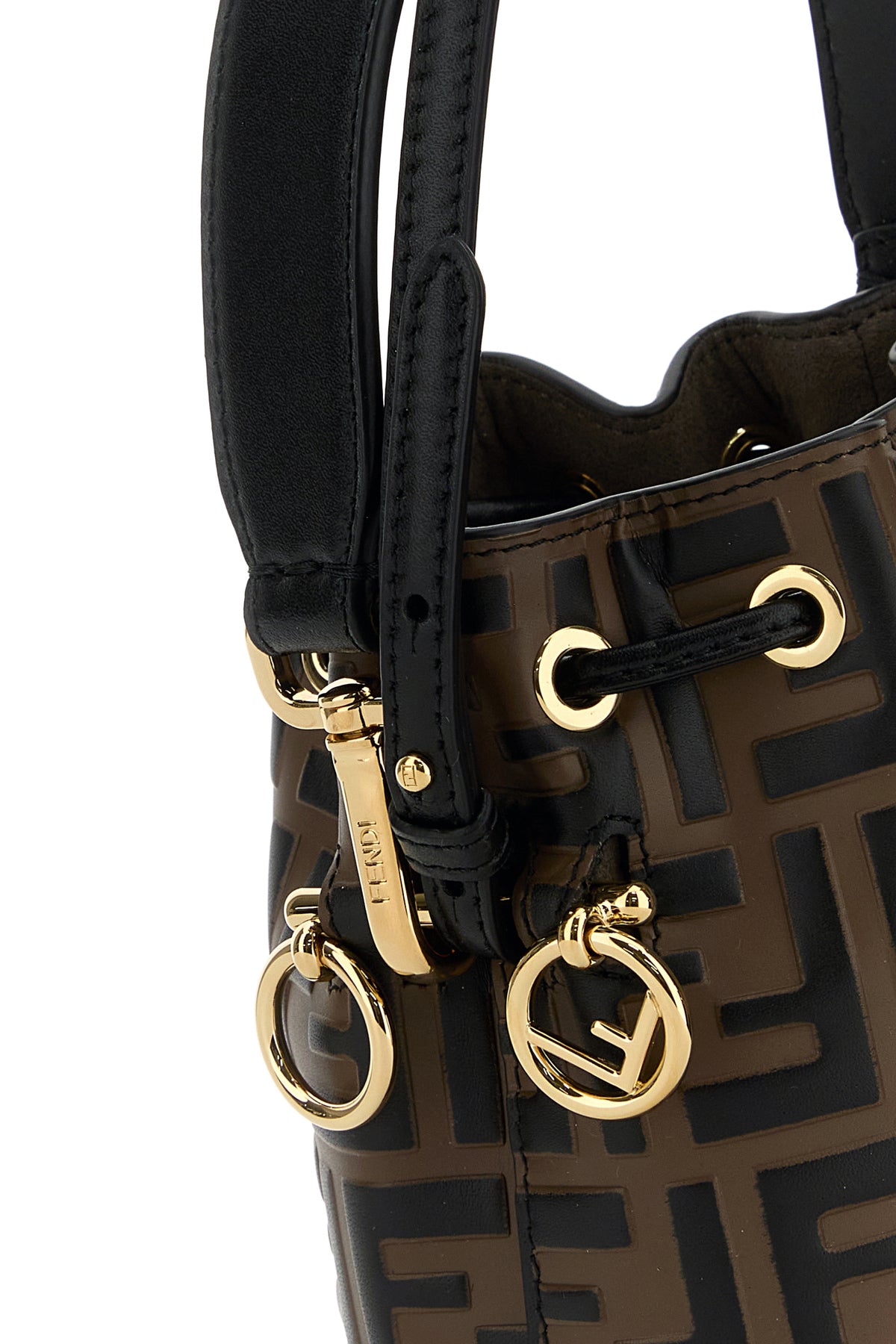 Borsa a secchiello realizzata in pelle di vitello caratterizzata da stampa a motivo FF in rilievo su tutta la superficie arricchita da charm logati in metallo sui lati.