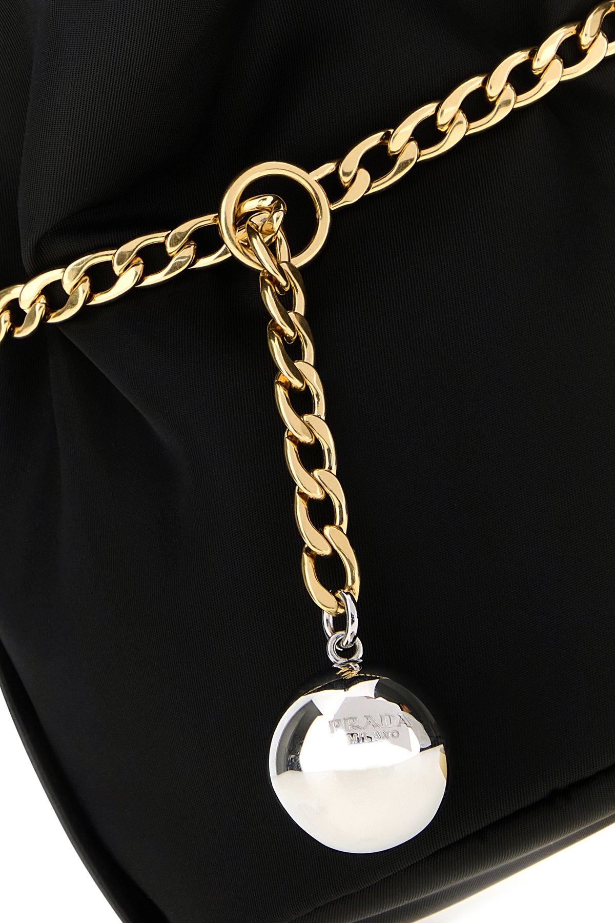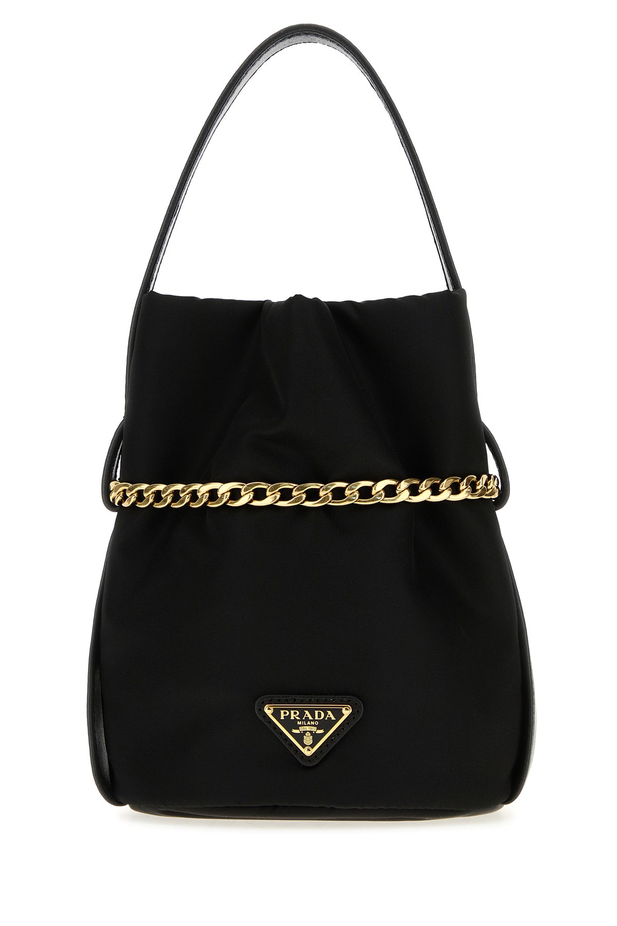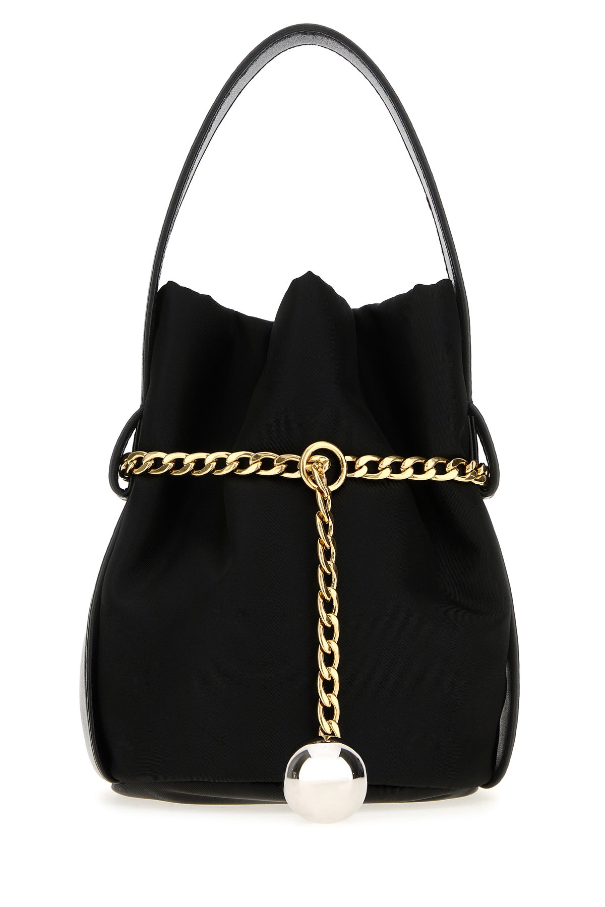 Borsa a secchiello realizzata in Re-Nylon arricchita da dettaglio metallico.