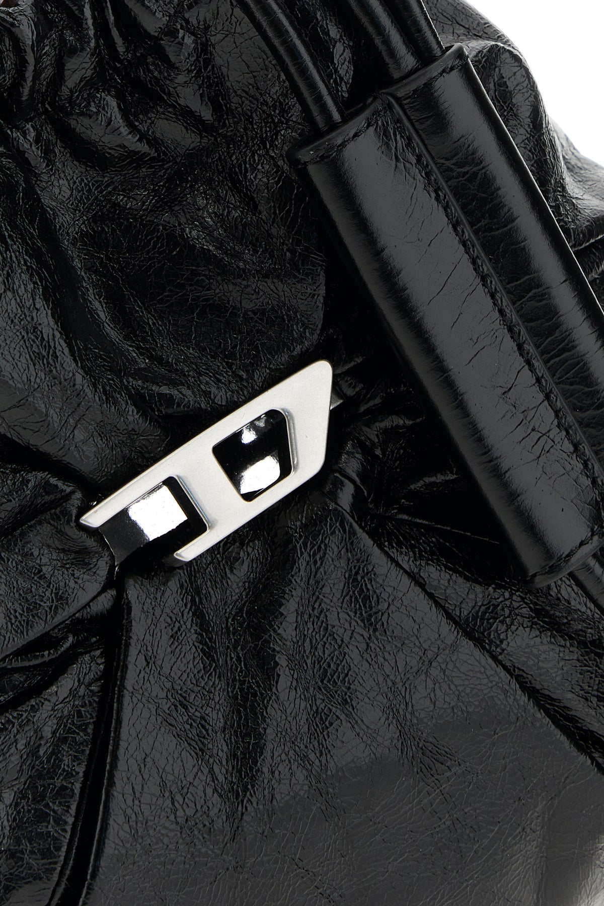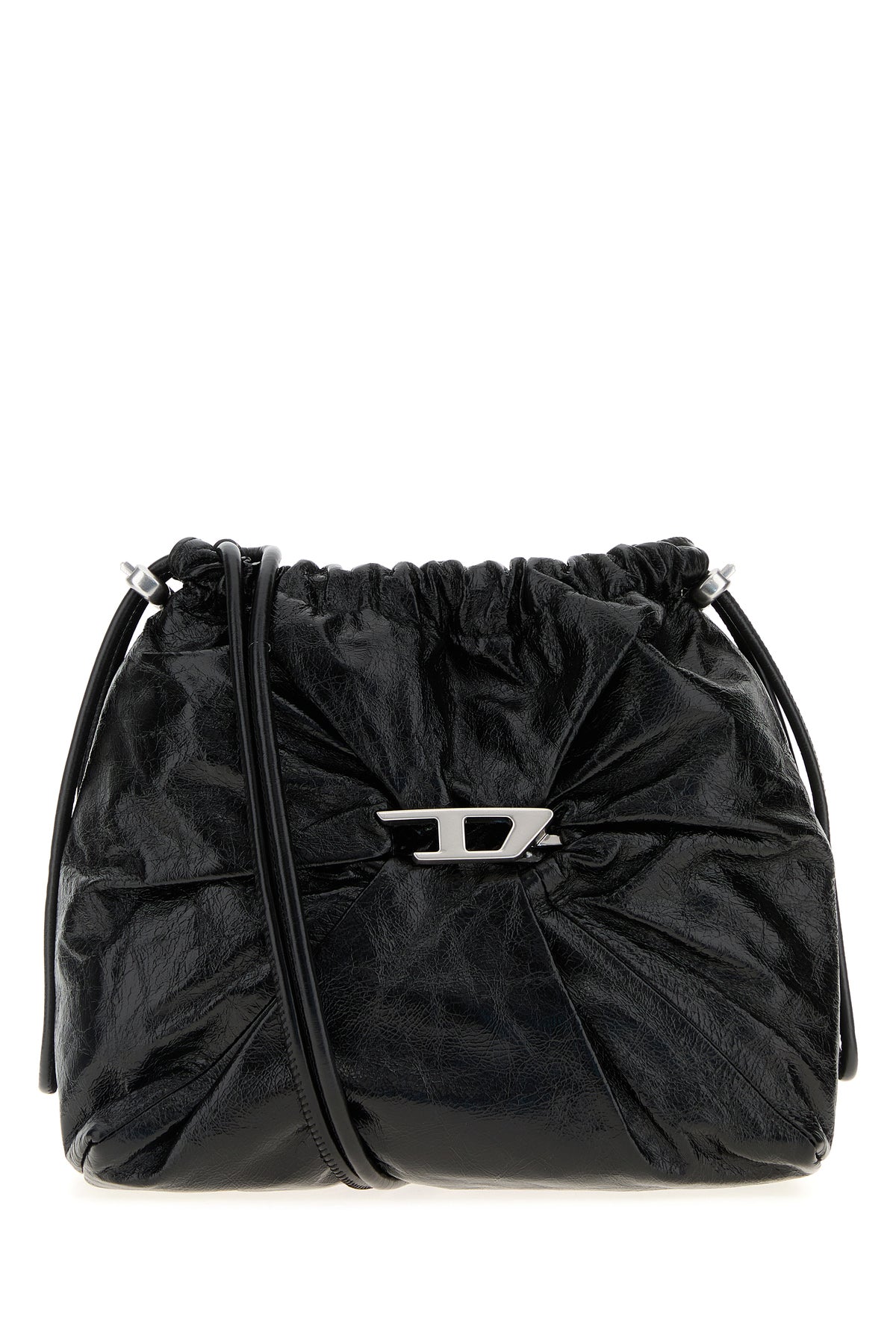 Borsa a secchiello realizzata in pelle martellata arricchita da dettaglio metallico D sulla parte frontale.