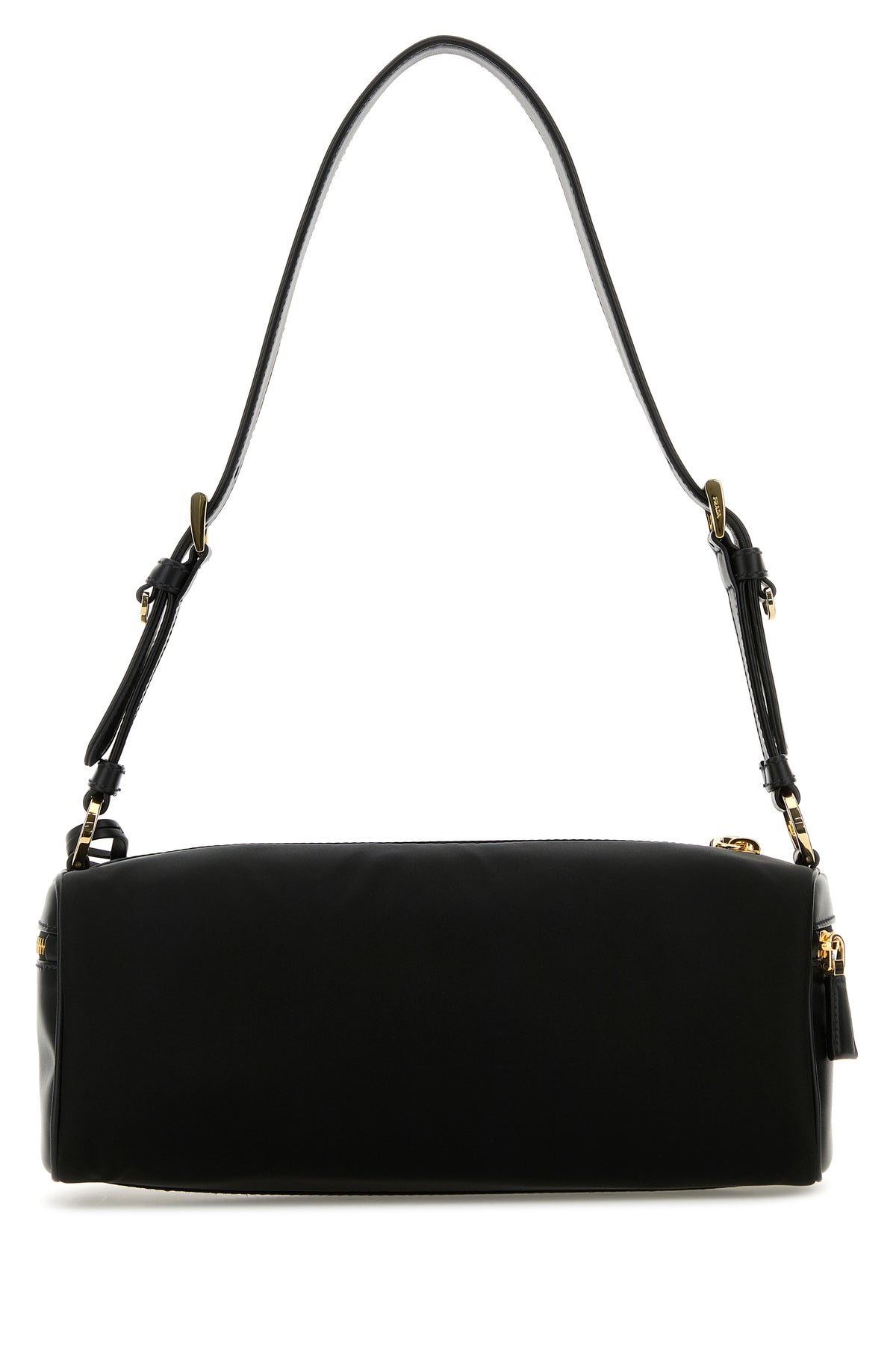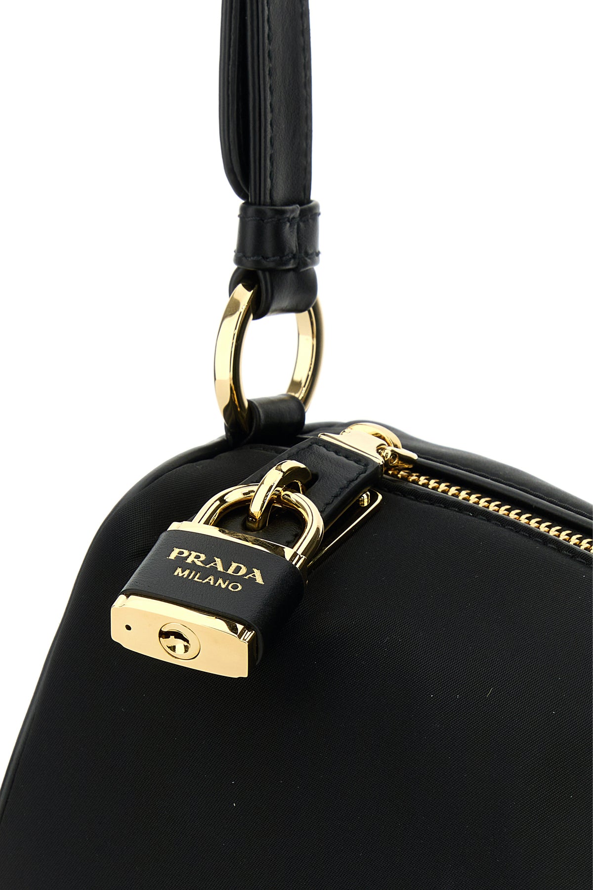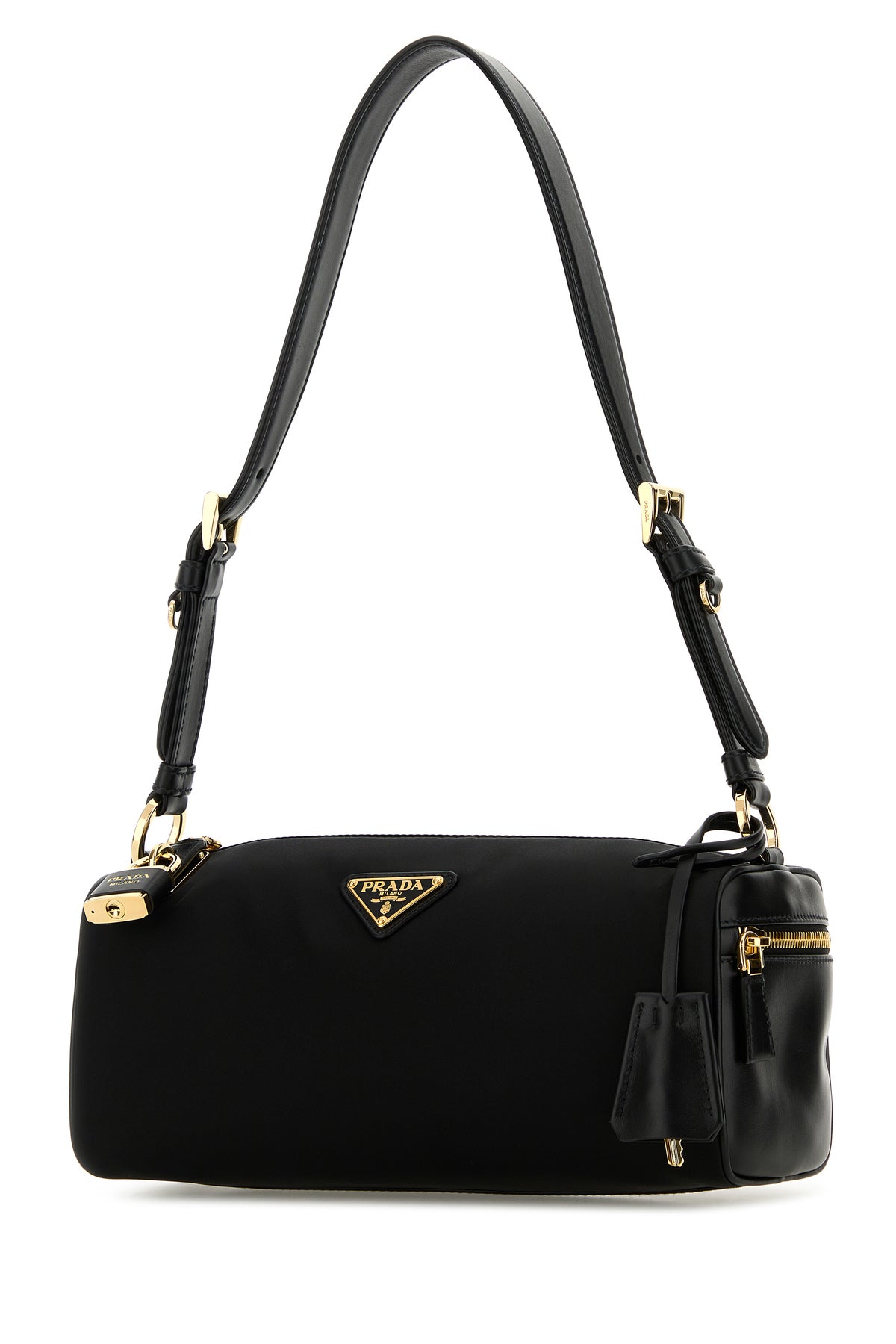 Borsa a spalla realizzata in nylon con inserti in pelle liscia tonale sui lati arricchita da iconico triangolo logato in metallo e lucchetto logato in metallo e pelle sulla parte frontale e accessorio amovibile in pelle tonale.