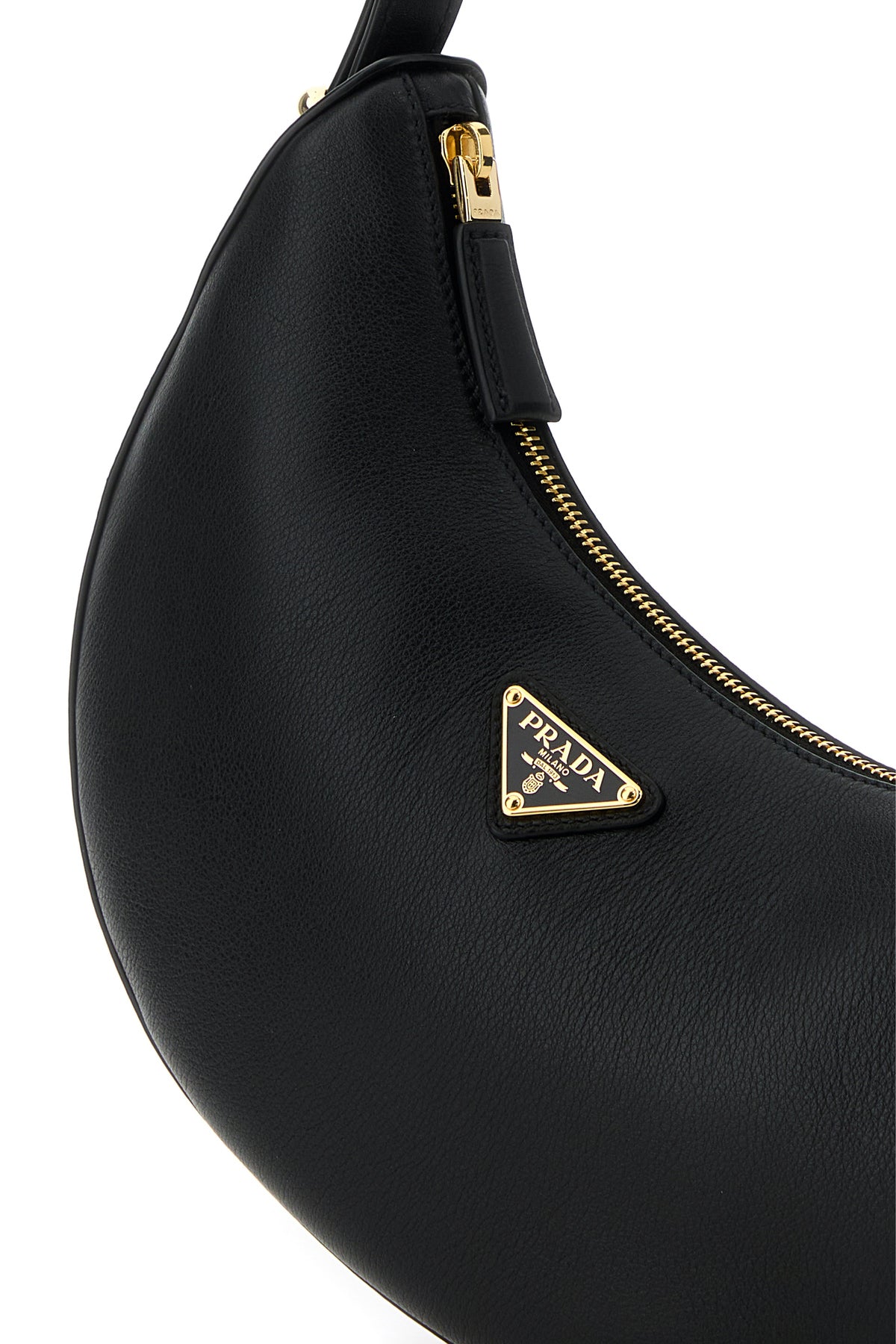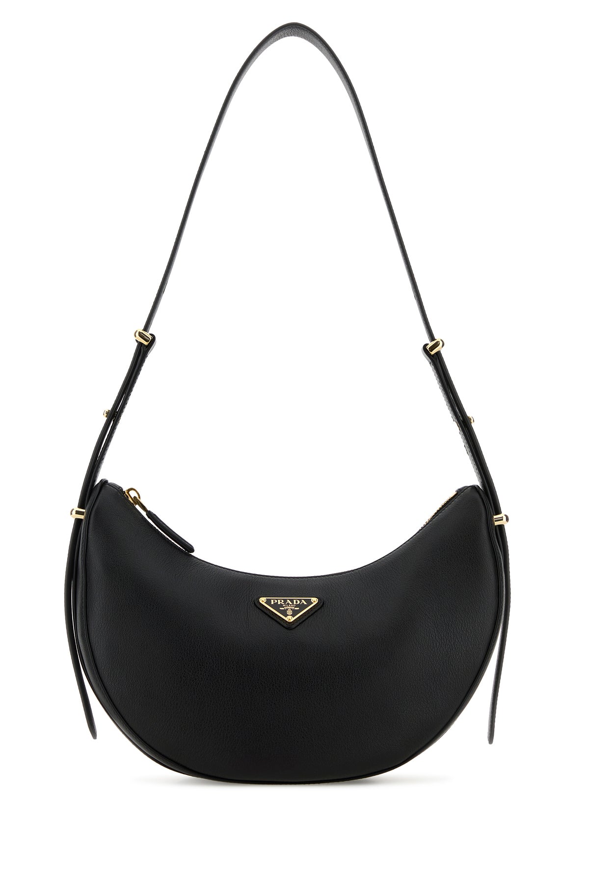 Borsa a spalla realizzata in pelle martellata arricchita da iconico triangolo metallico logato sulla parte frontale.