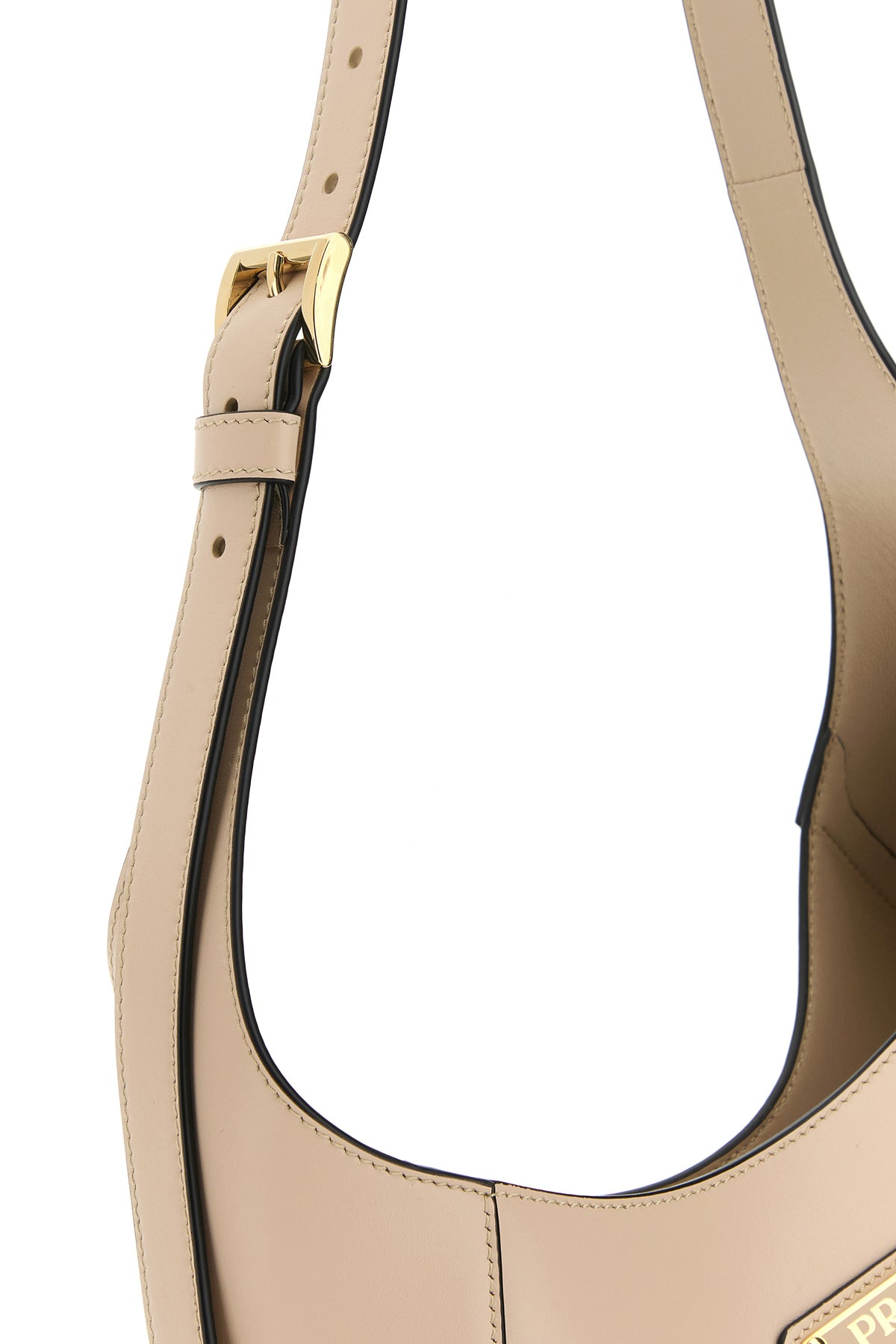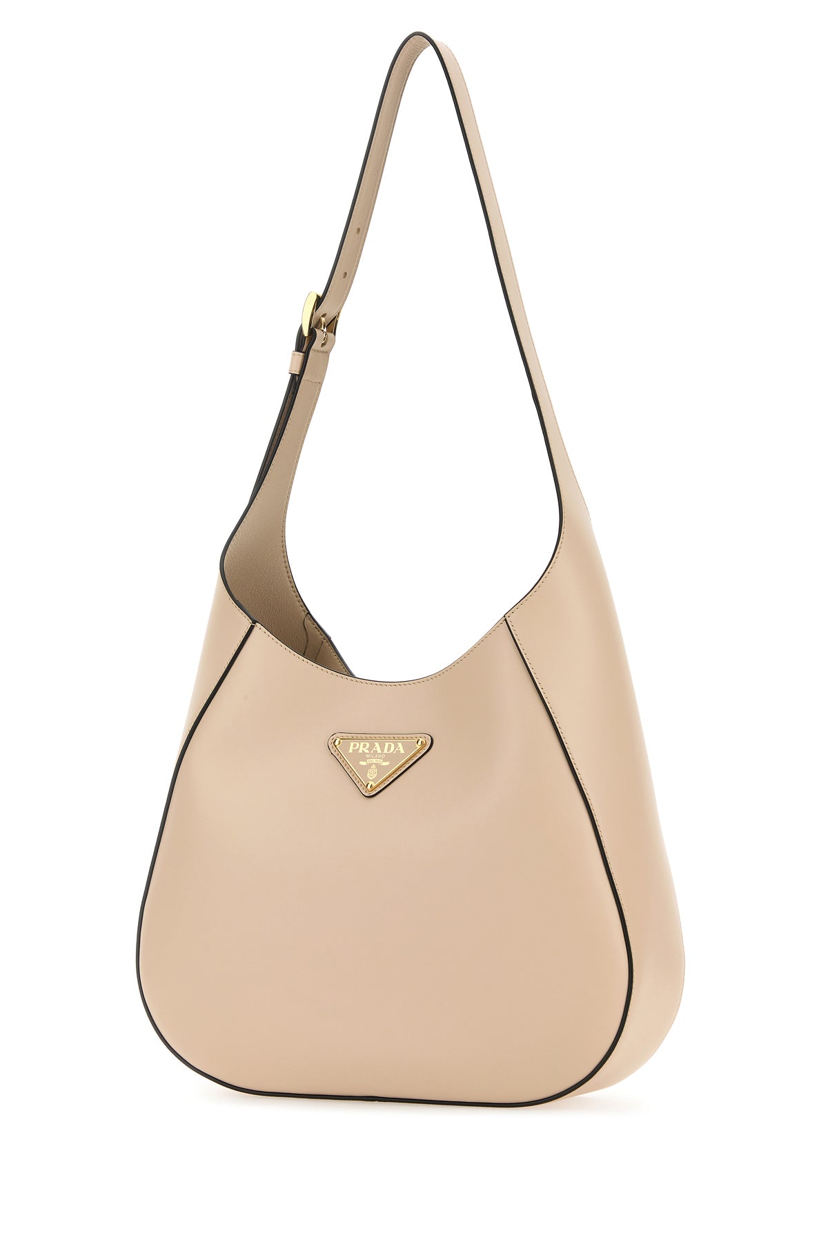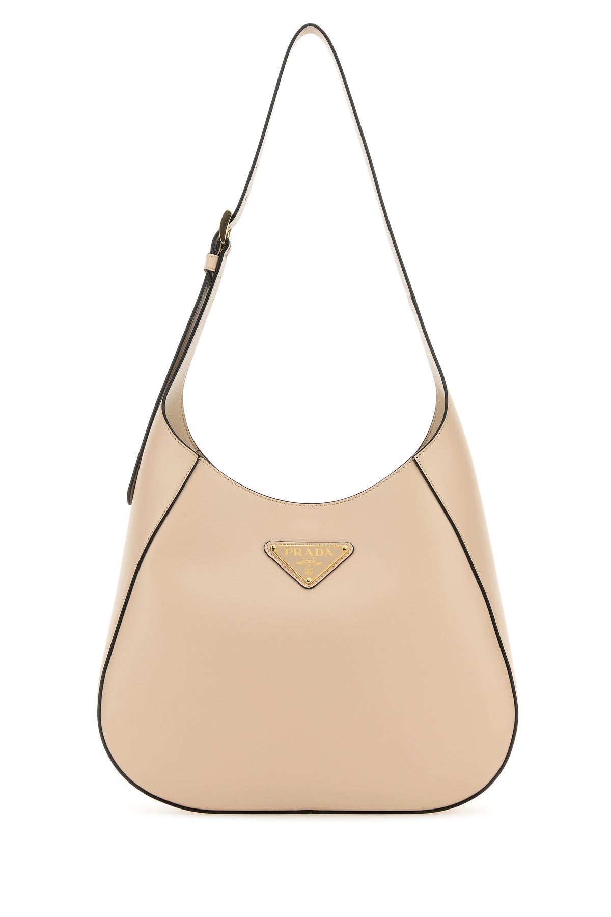 Borsa a spalla realizzata in pelle di vitello liscia arricchita da iconico triangolo logato sulla parte frontale.