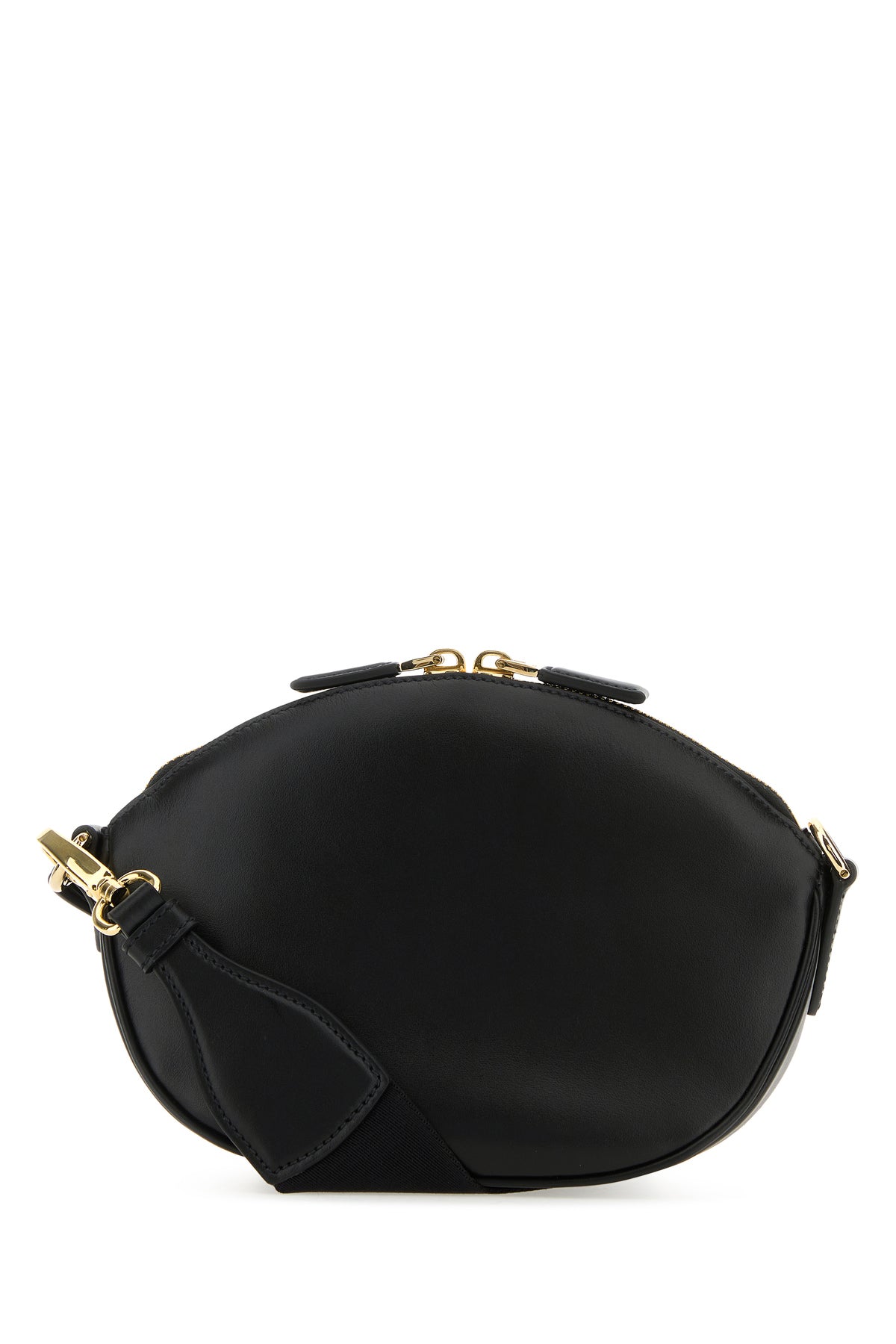 Borsa a tracolla realizzata in pelle liscia arricchita da iconico triangolo logato sulla parte frontale e portachiavi amovibile in pelle tonale e metallo.