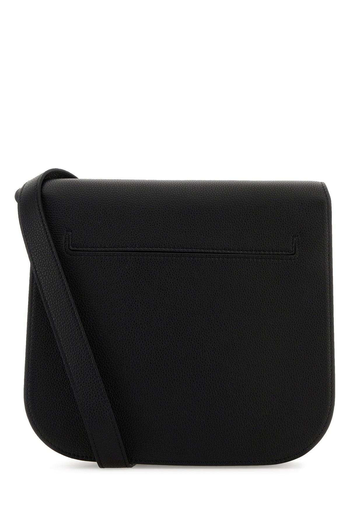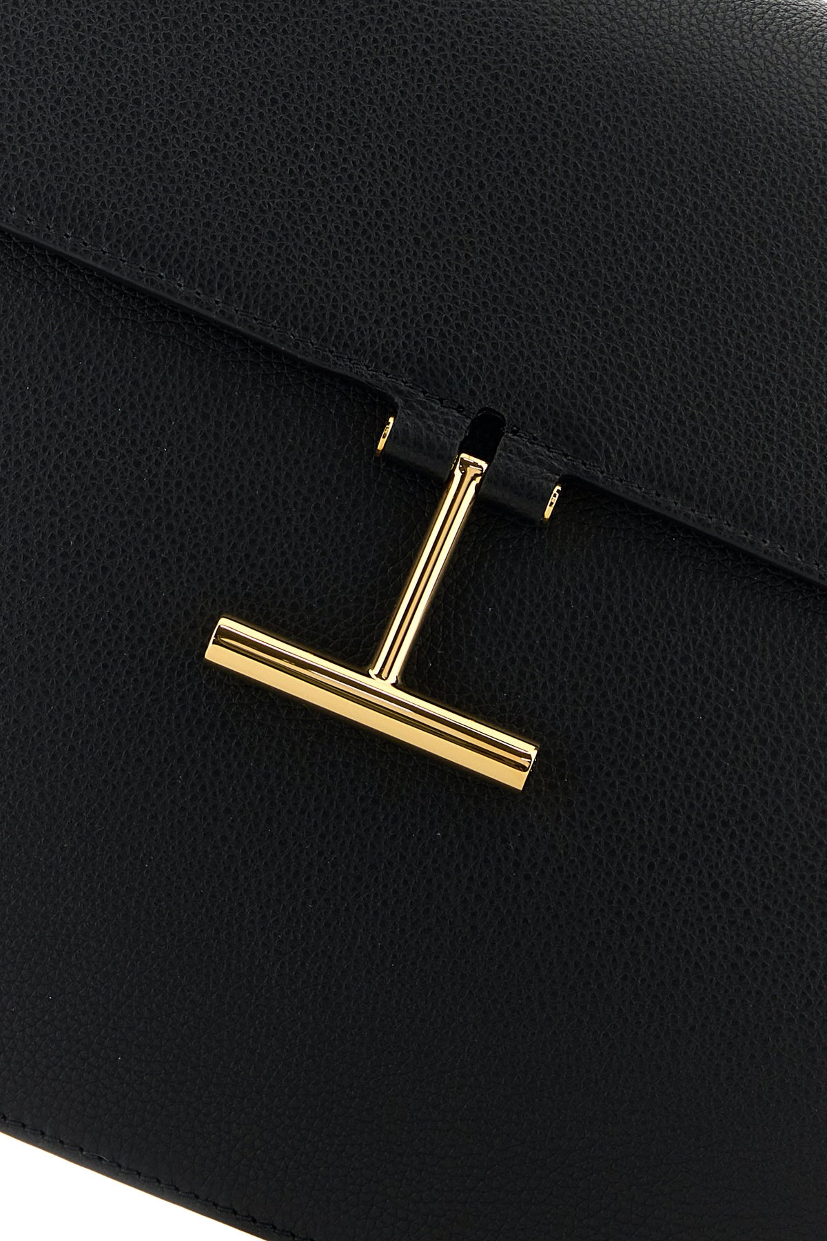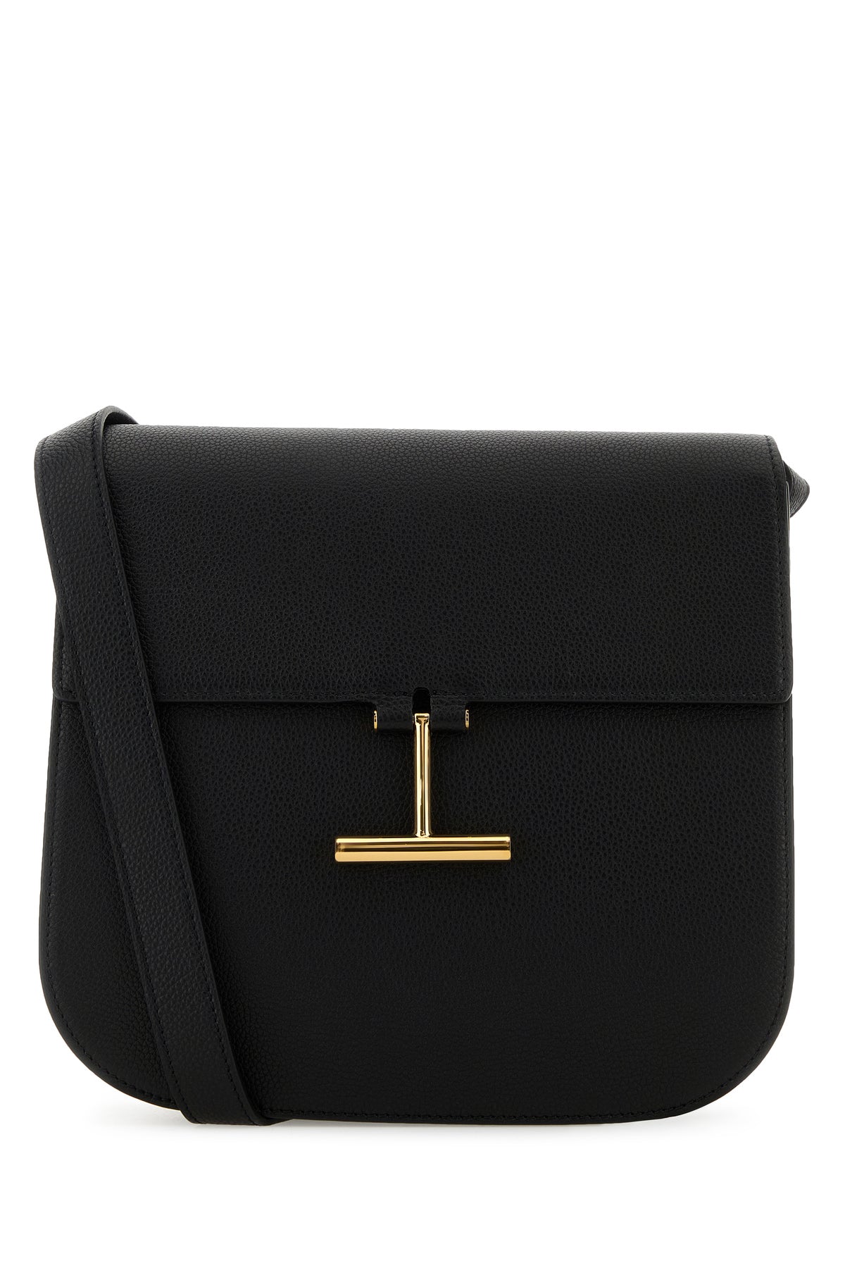 Borsa a tracolla realizzata in pelle zigrinata arricchita da dettaglio metallico T sulla parte frontale.