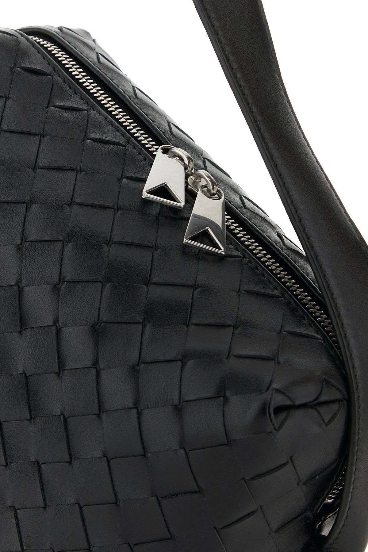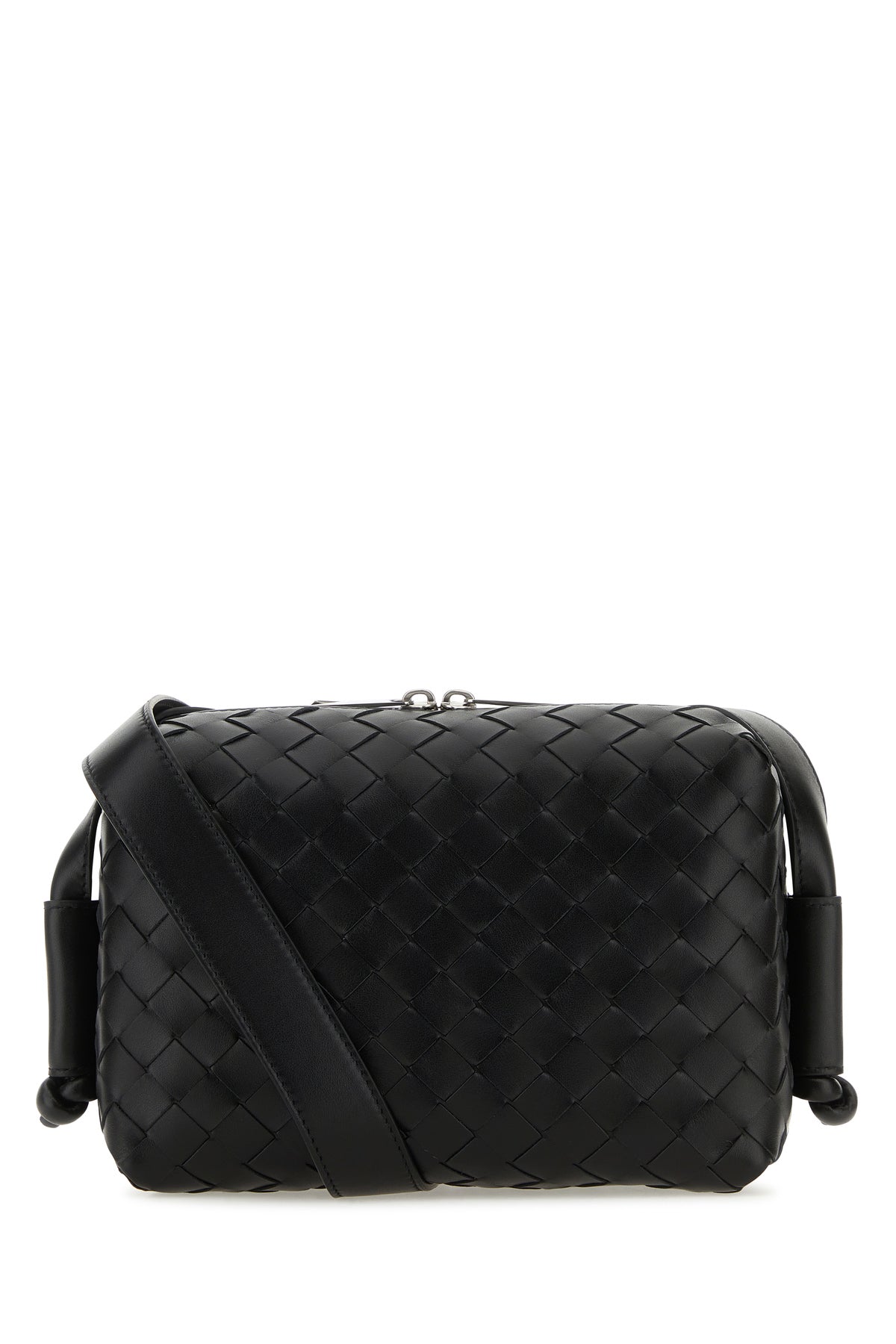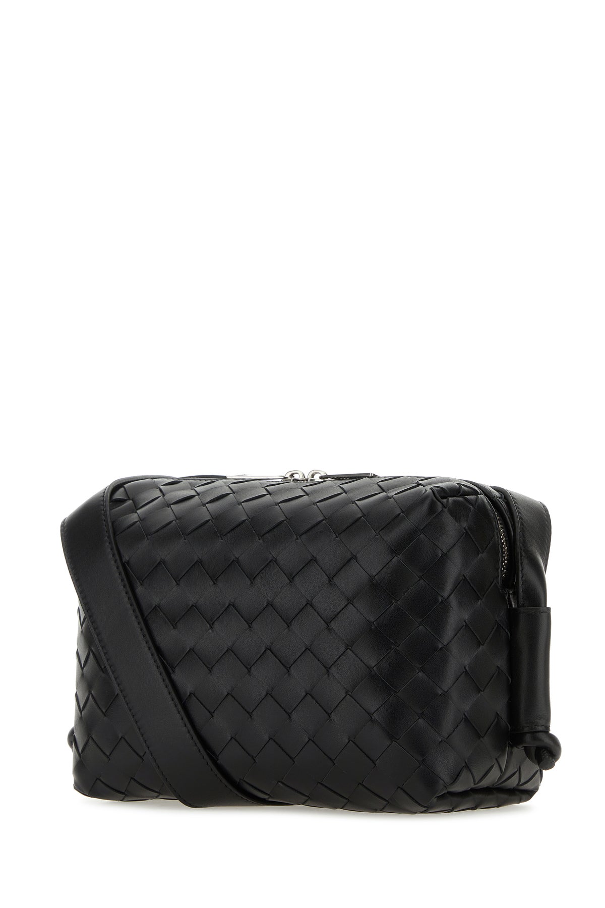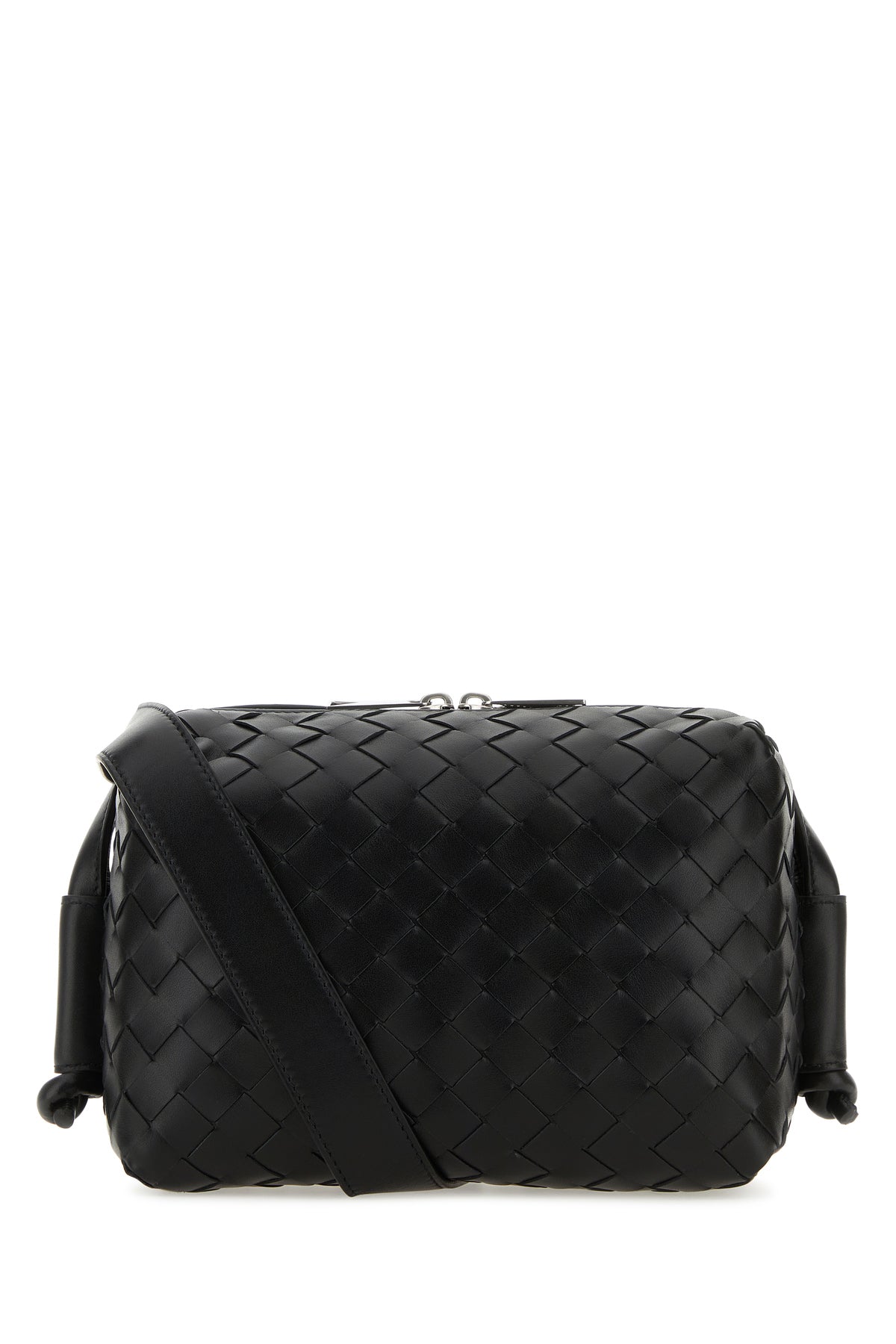 Borsa a tracolla realizzata in pelle liscia cauterizzata da iconico motivo Intrecciato su tutta la superficie.