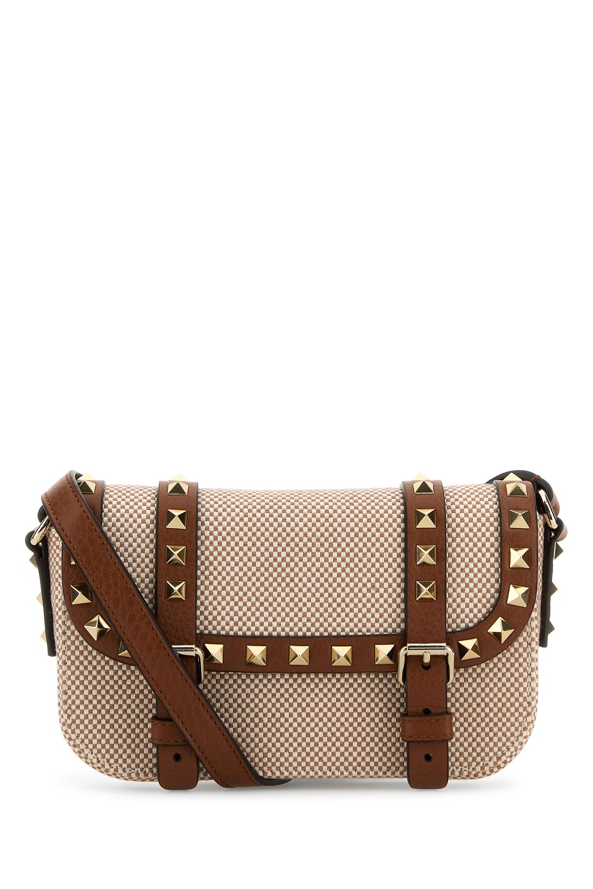 Borsa a tracolla realizzata in tela arricchita da borchie metalliche.