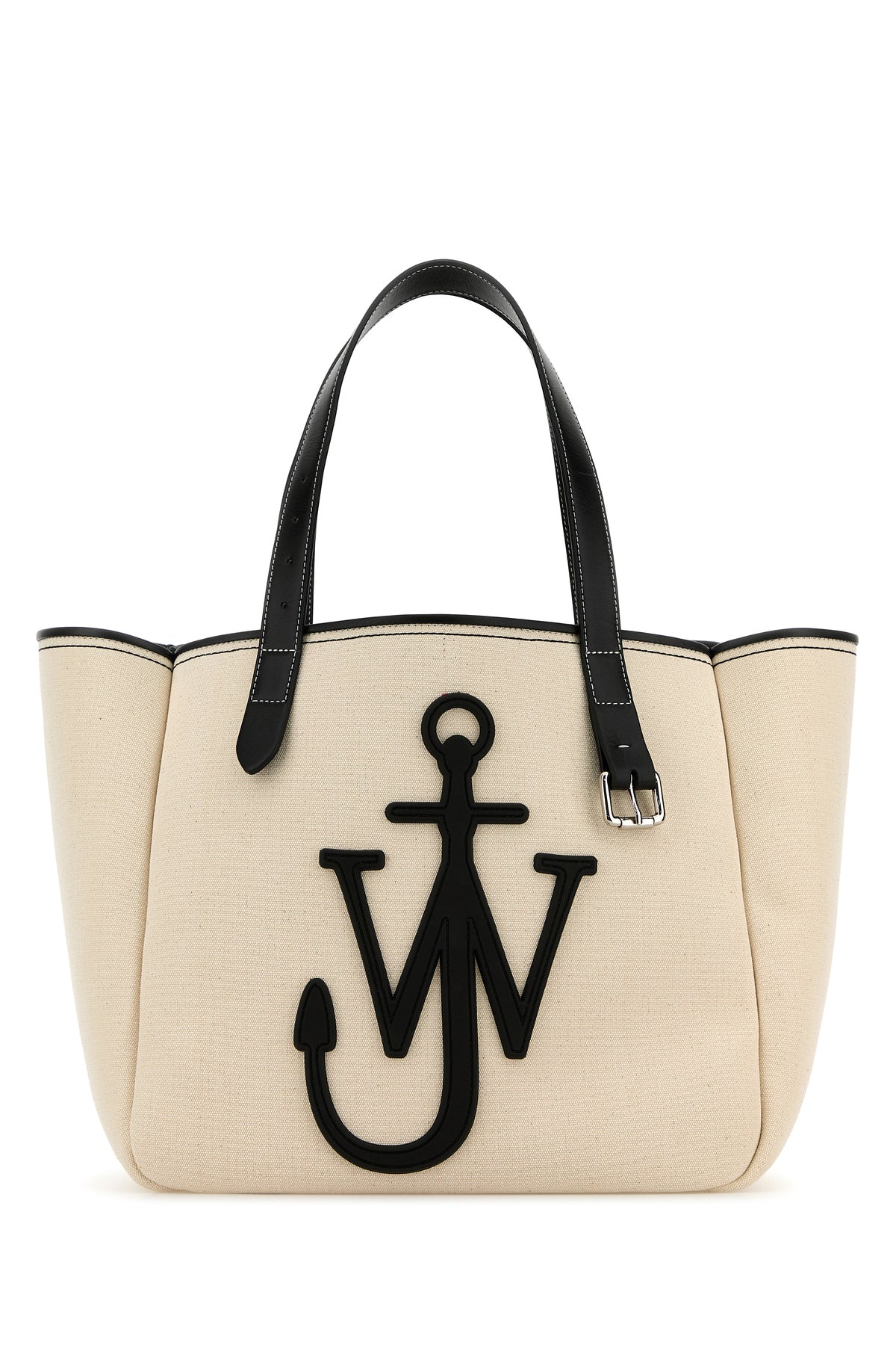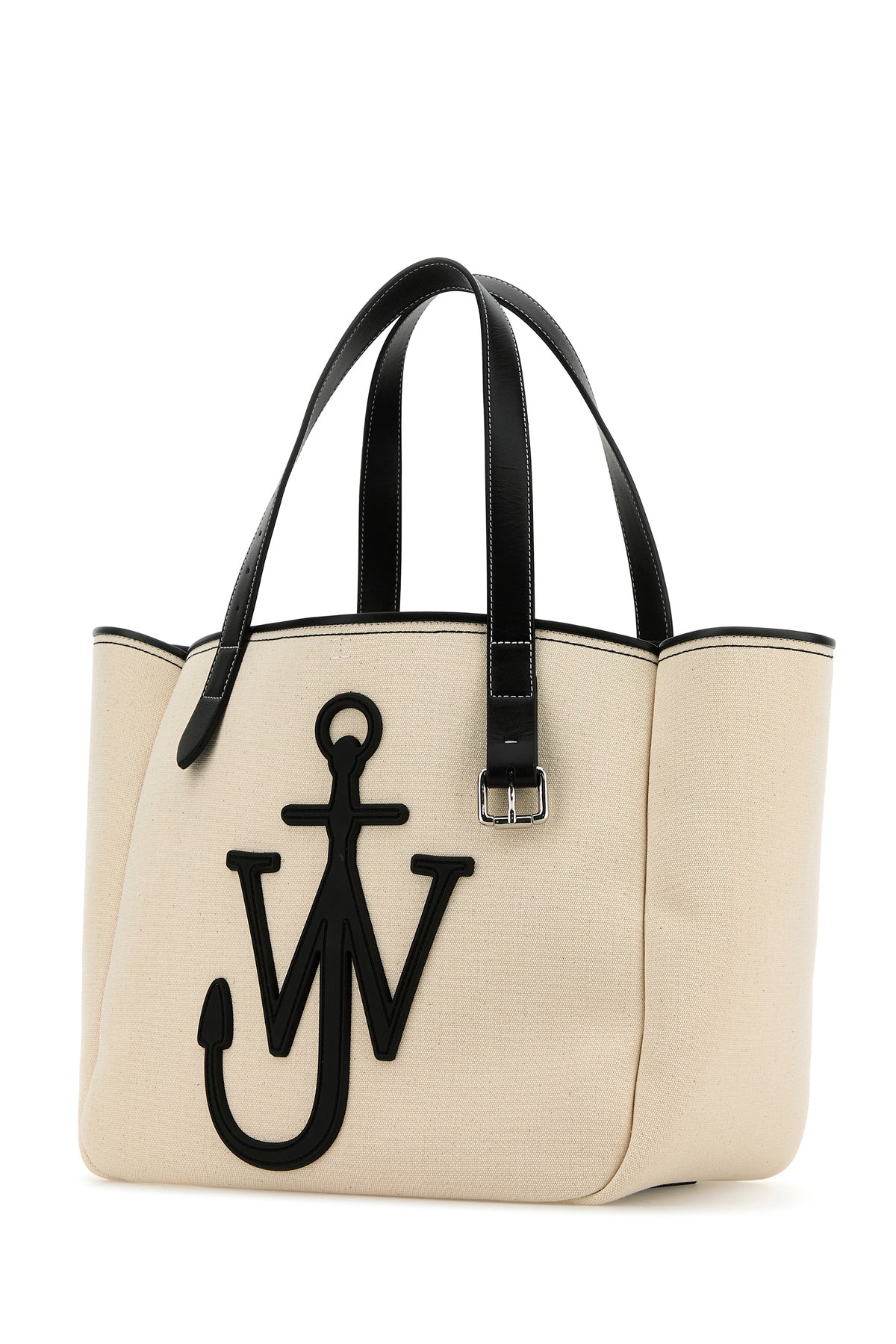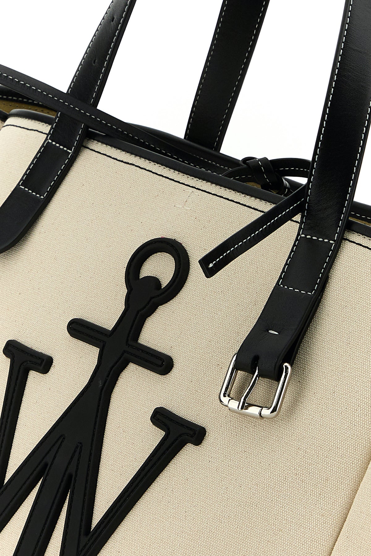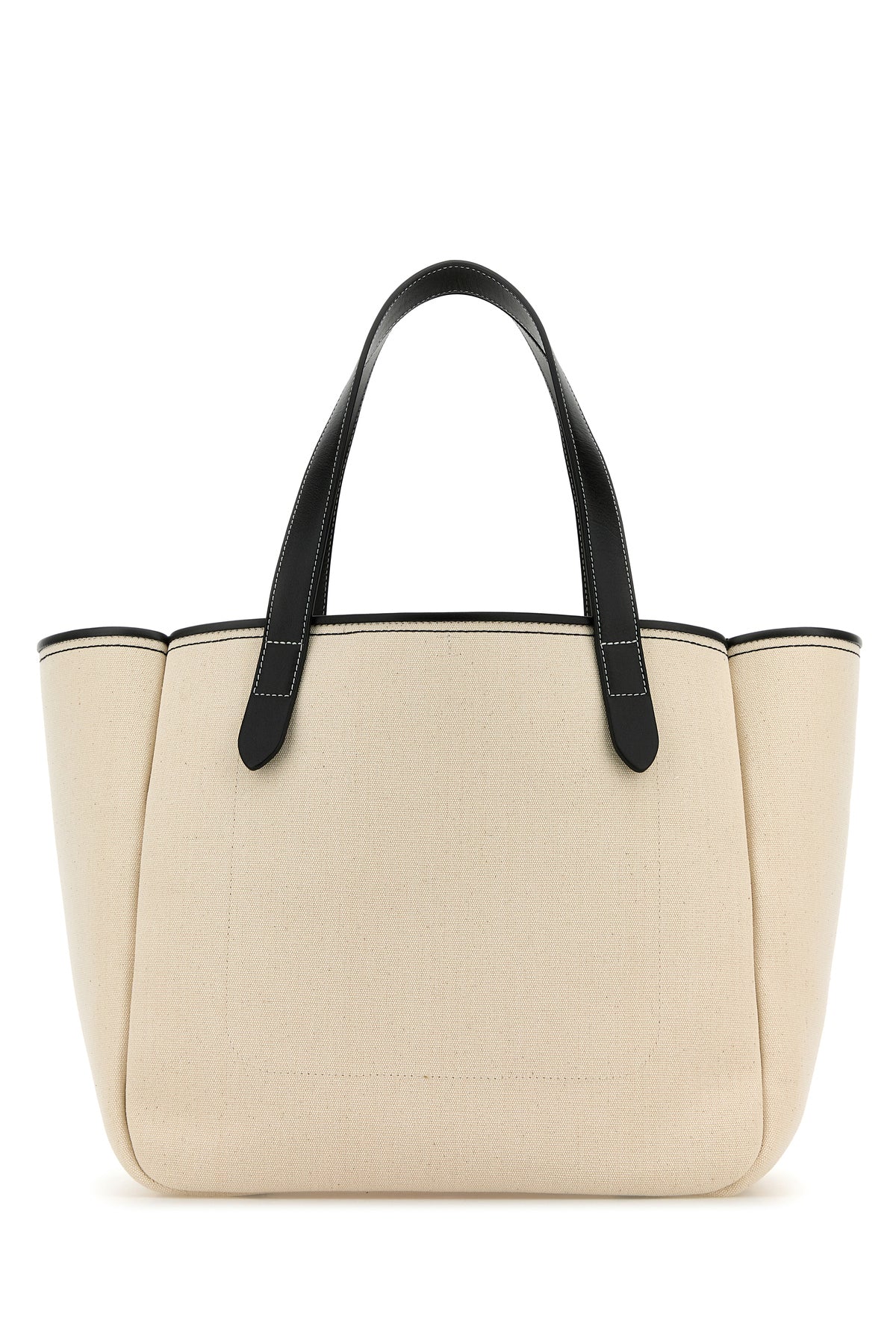 Borsa shopping realizzata in tela arricchita da applicazione logata in pelle a contrasto sulla parte frontale.