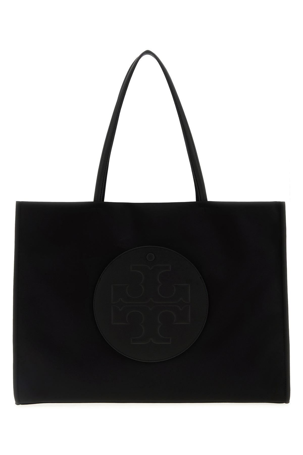 Borsa shopping realizzata in nylon riciclato arricchita da applicazione logata tonale sulla parte frontale.
