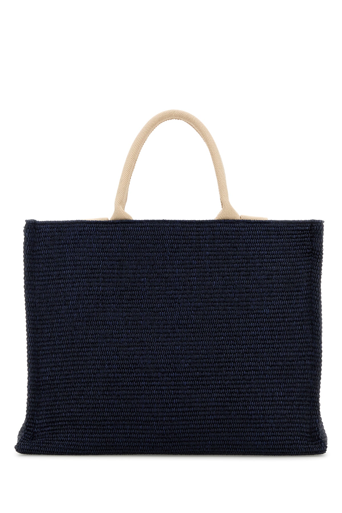 Borsa shopping realizzata in rafia caratterizzata da logo ricamato a contrasto sulla parte frontale.