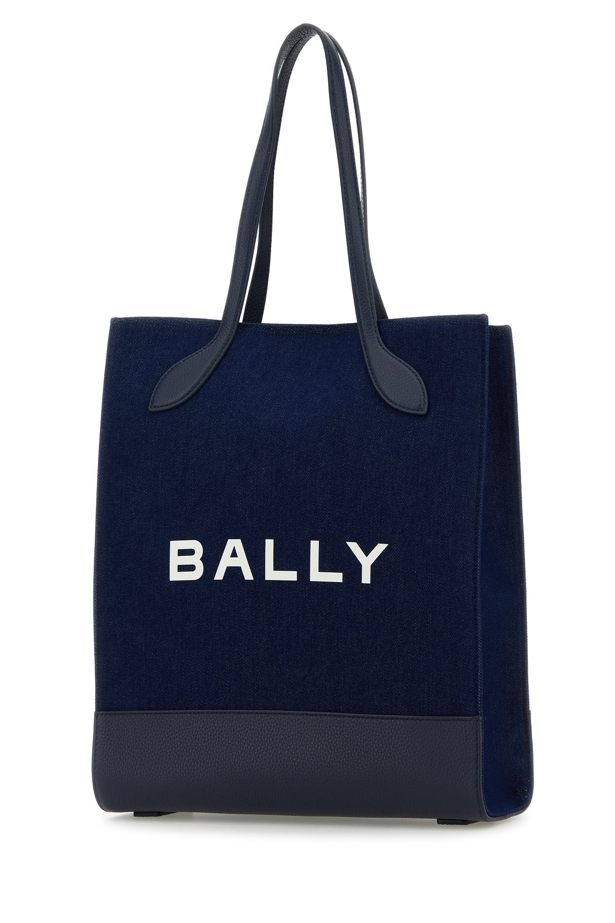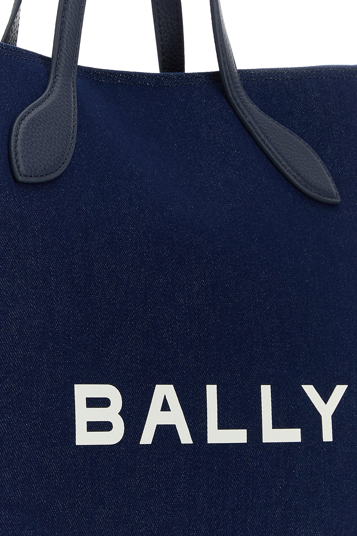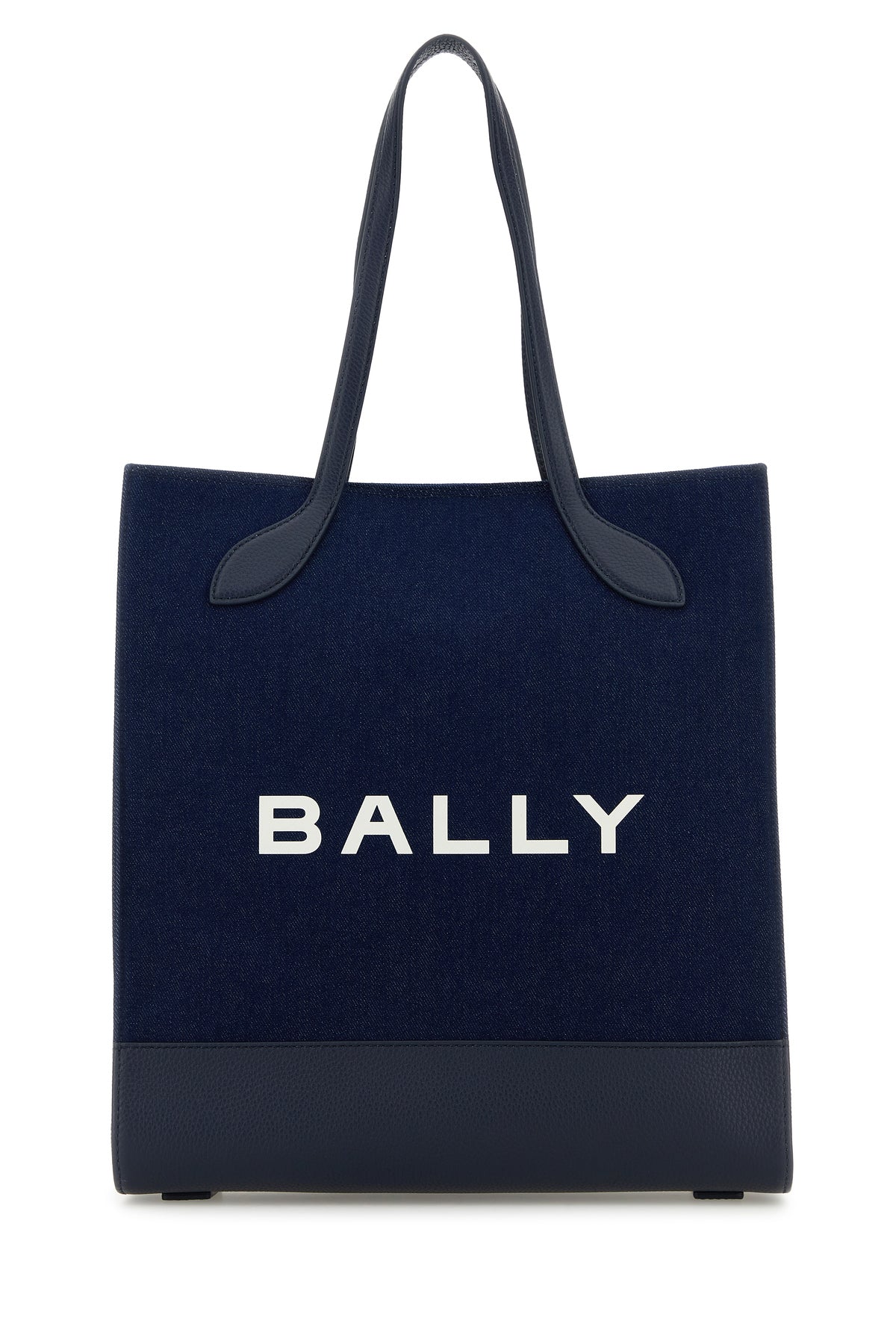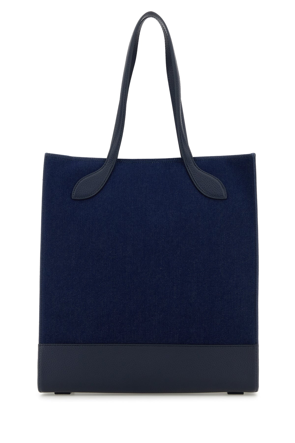 Borsa shopping realizzata in denim con inserto in pelle sul fondo caratterizzato da logo stampato a contrasto sulla parte frontale.