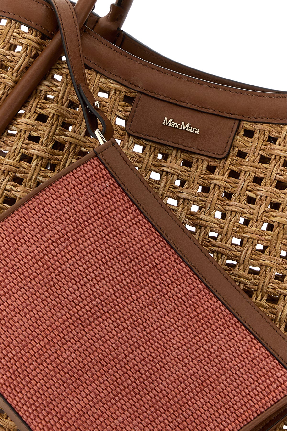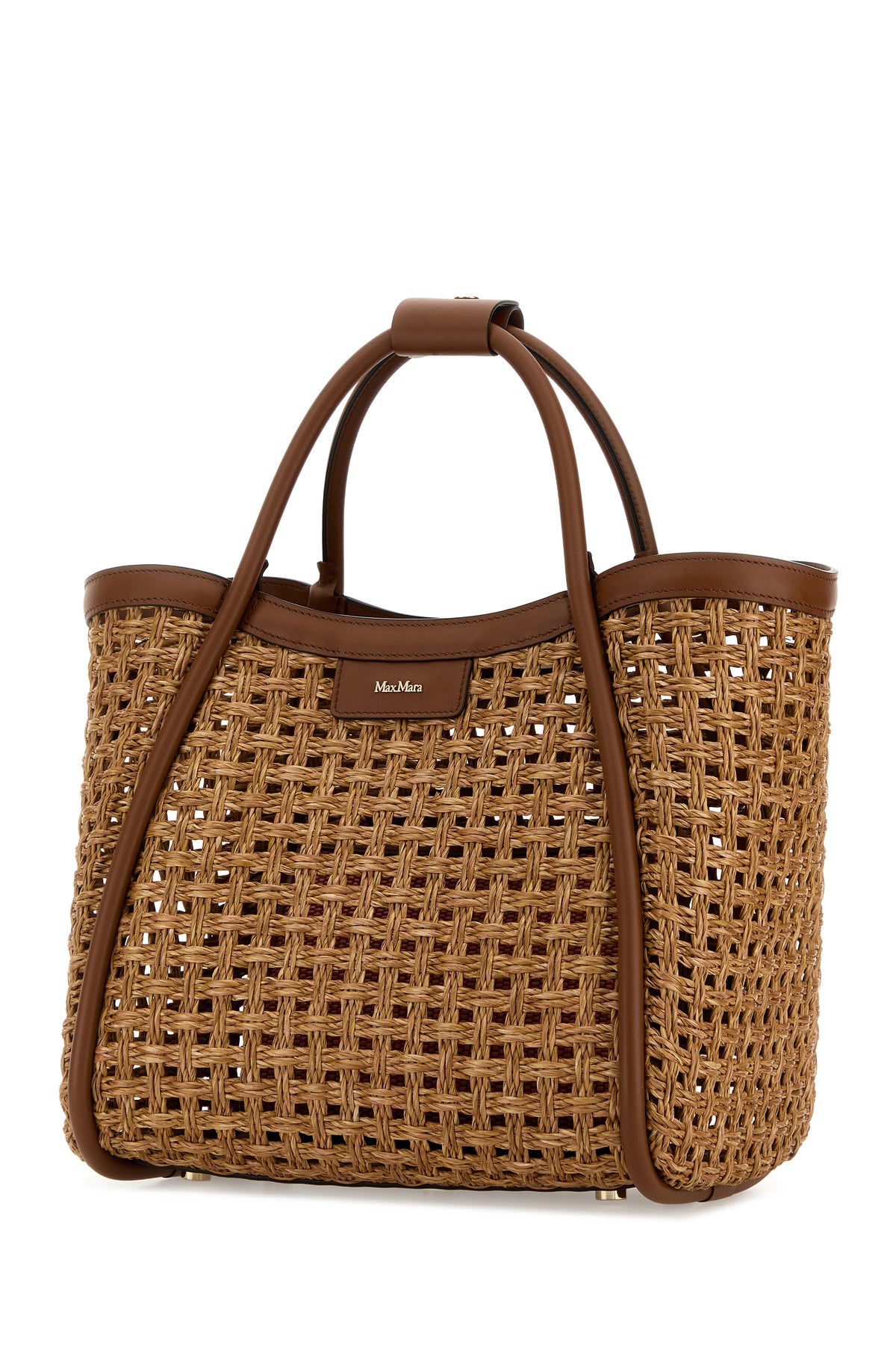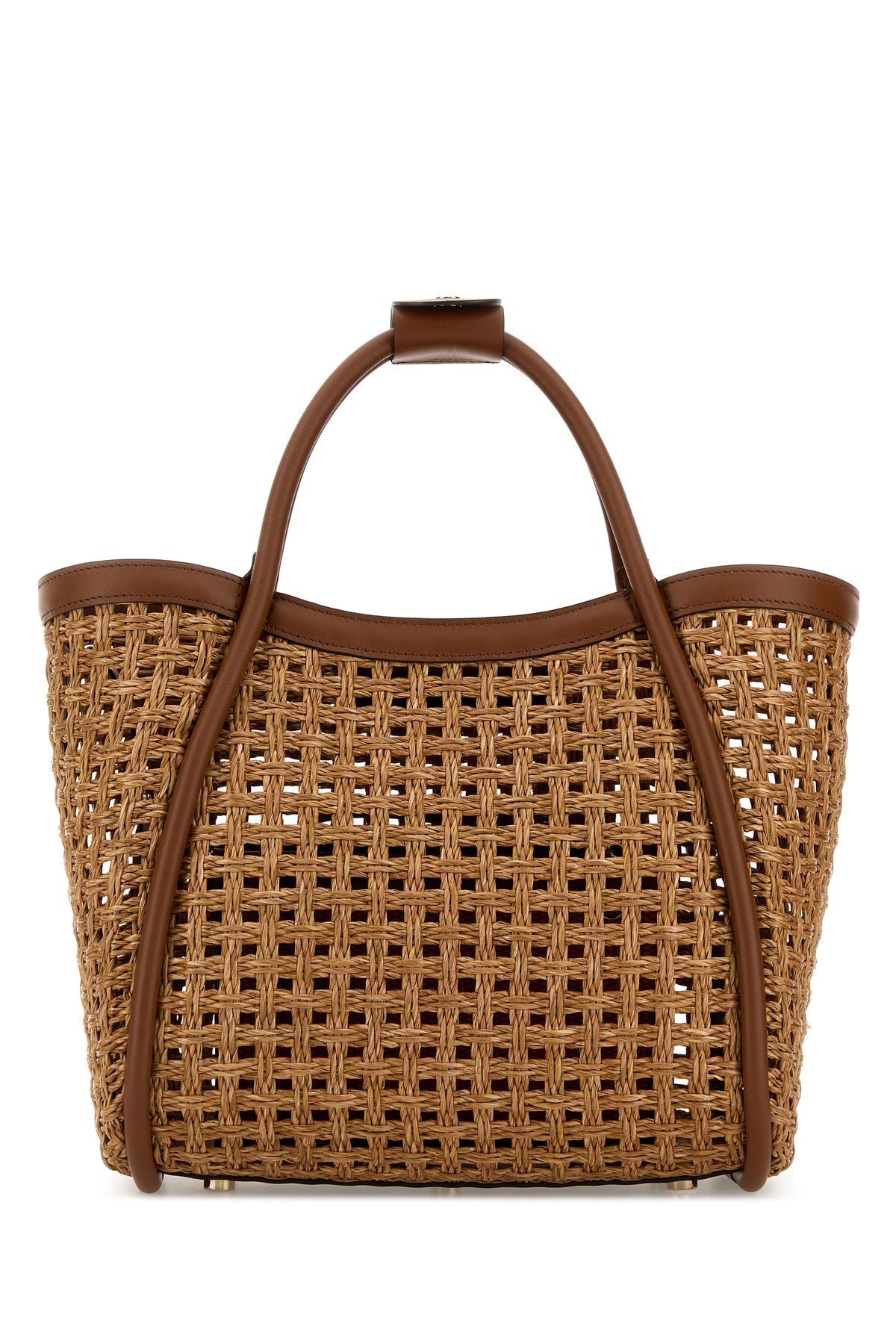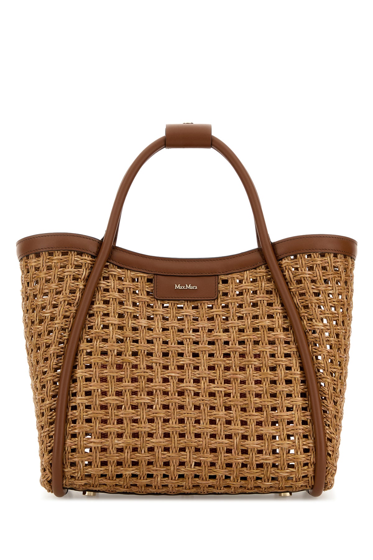Borsa shopping realizzata in rafia con inserti in pelle sulle profilature arricchita da dettaglio metallico logato sulla parte frontale.