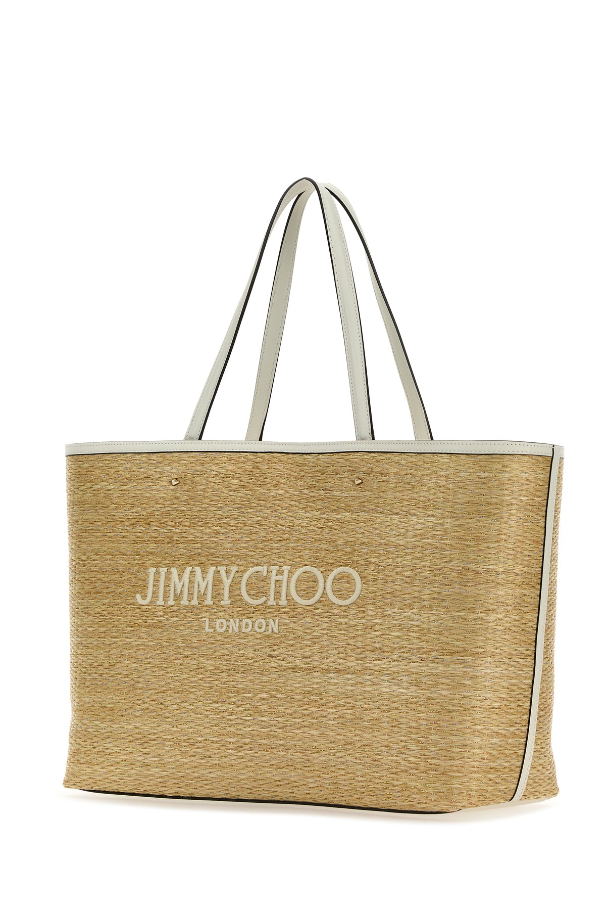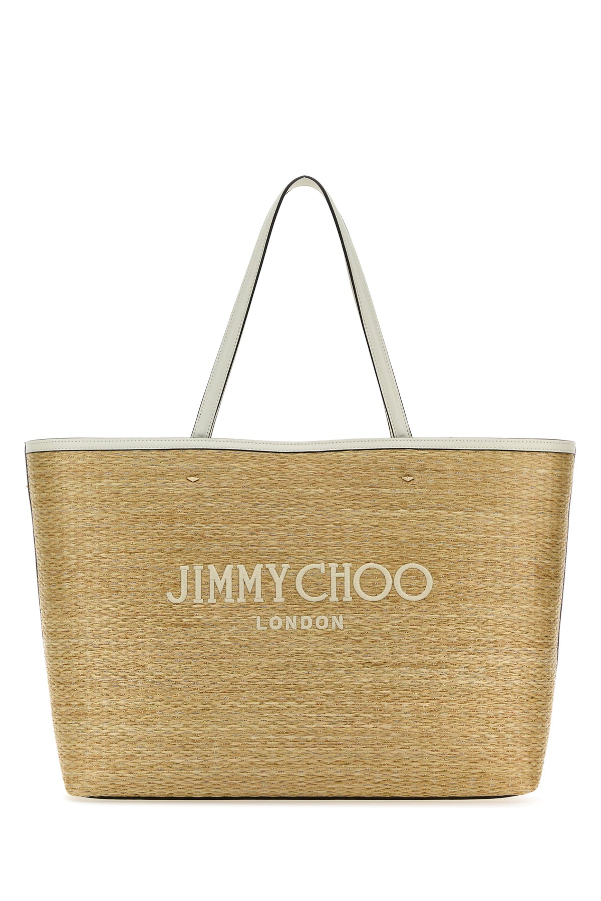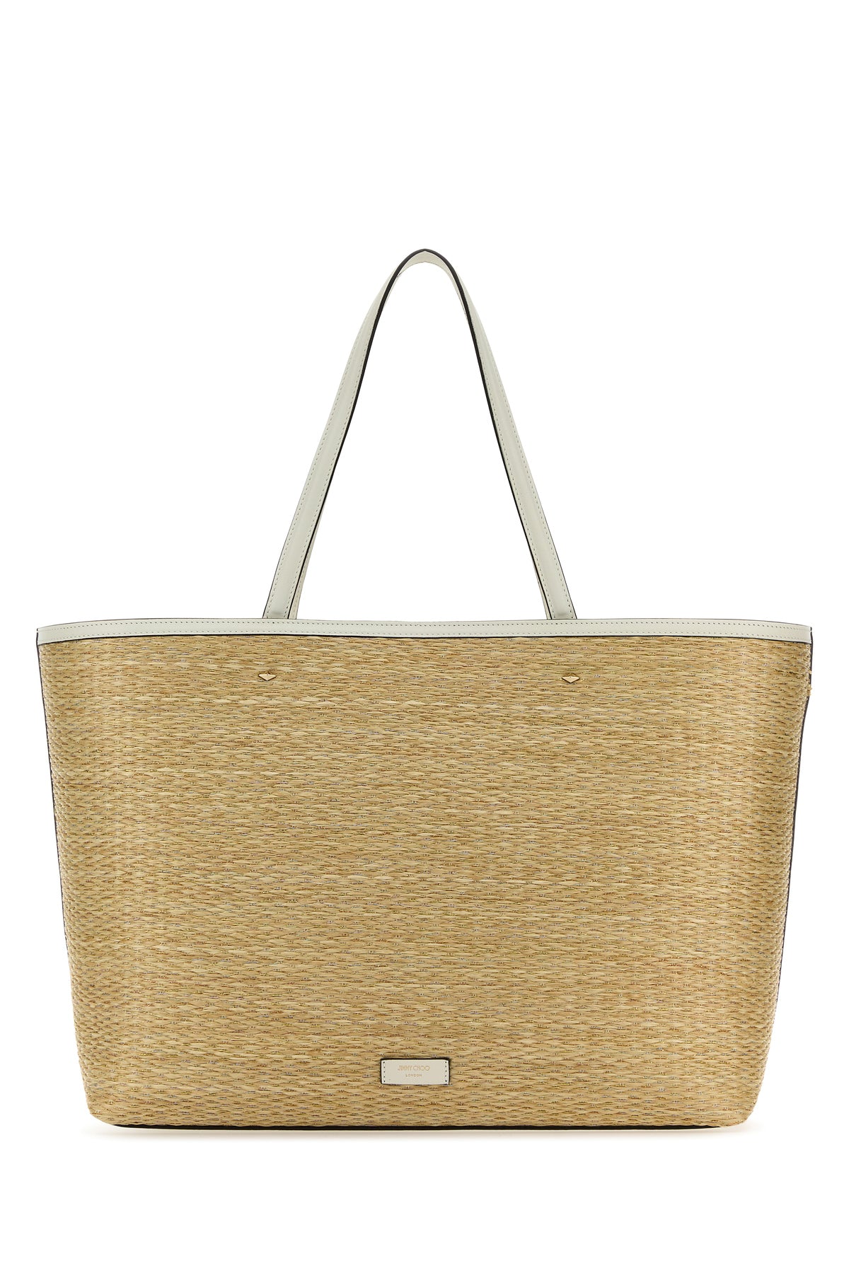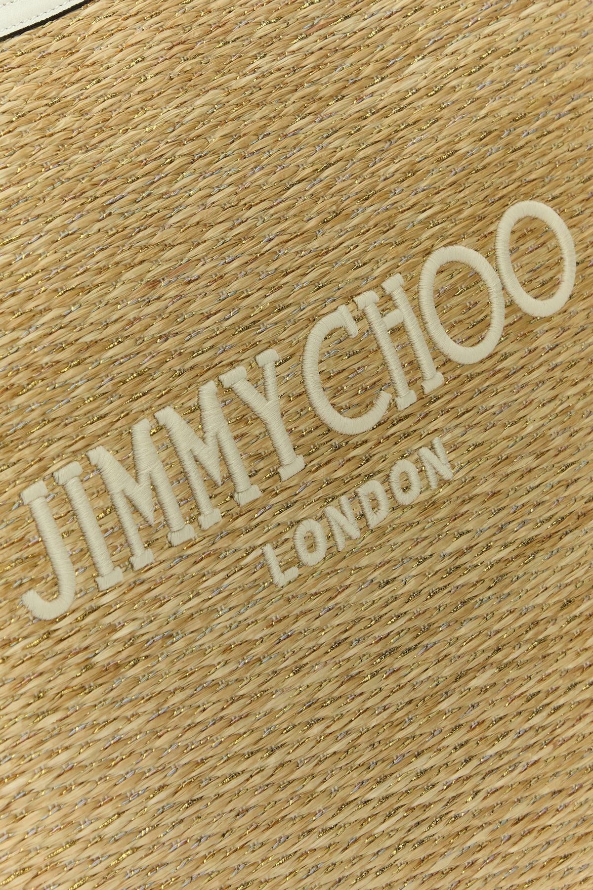 Borsa shopping realizzata in rafia intrecciata con fili di lurex caratterizzata da logo ricamato a contrasto sulla parte frontale.
