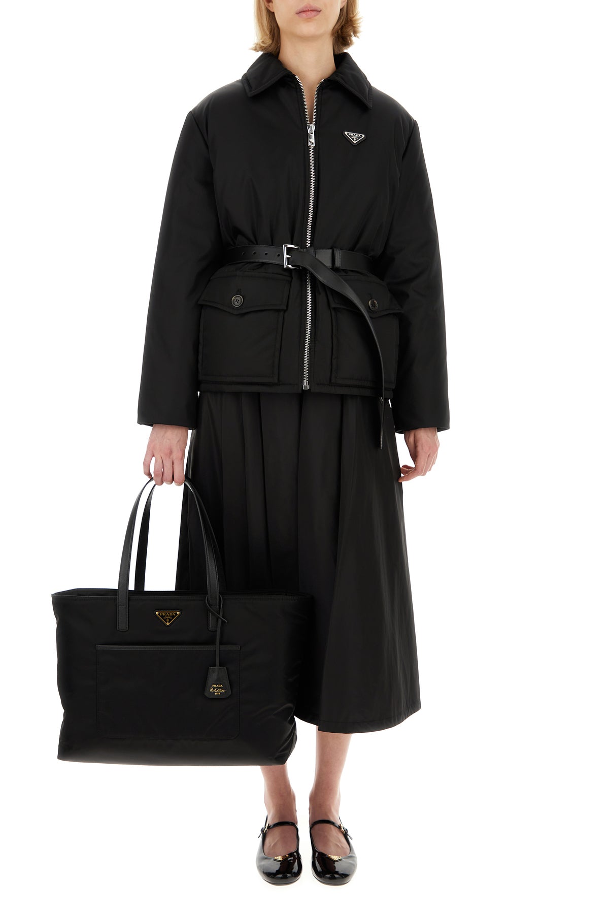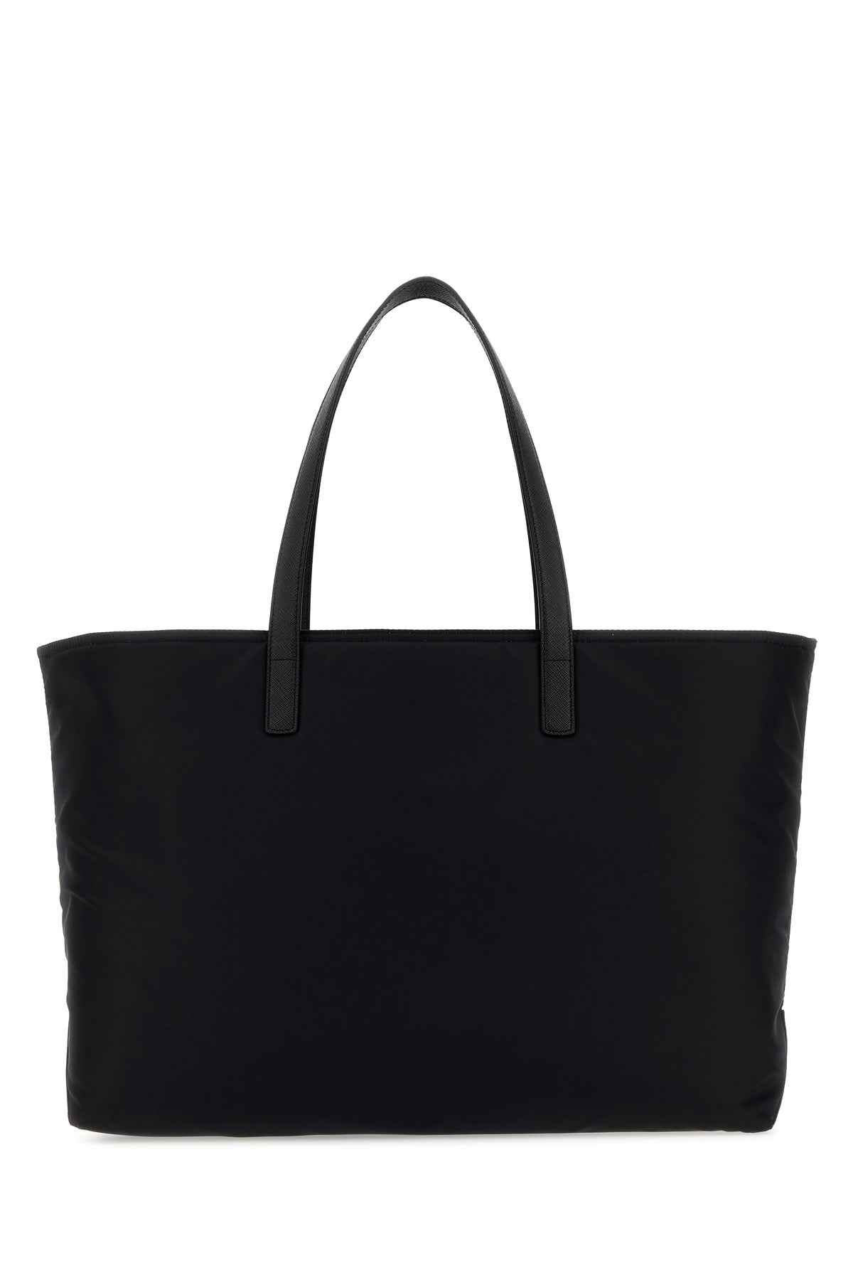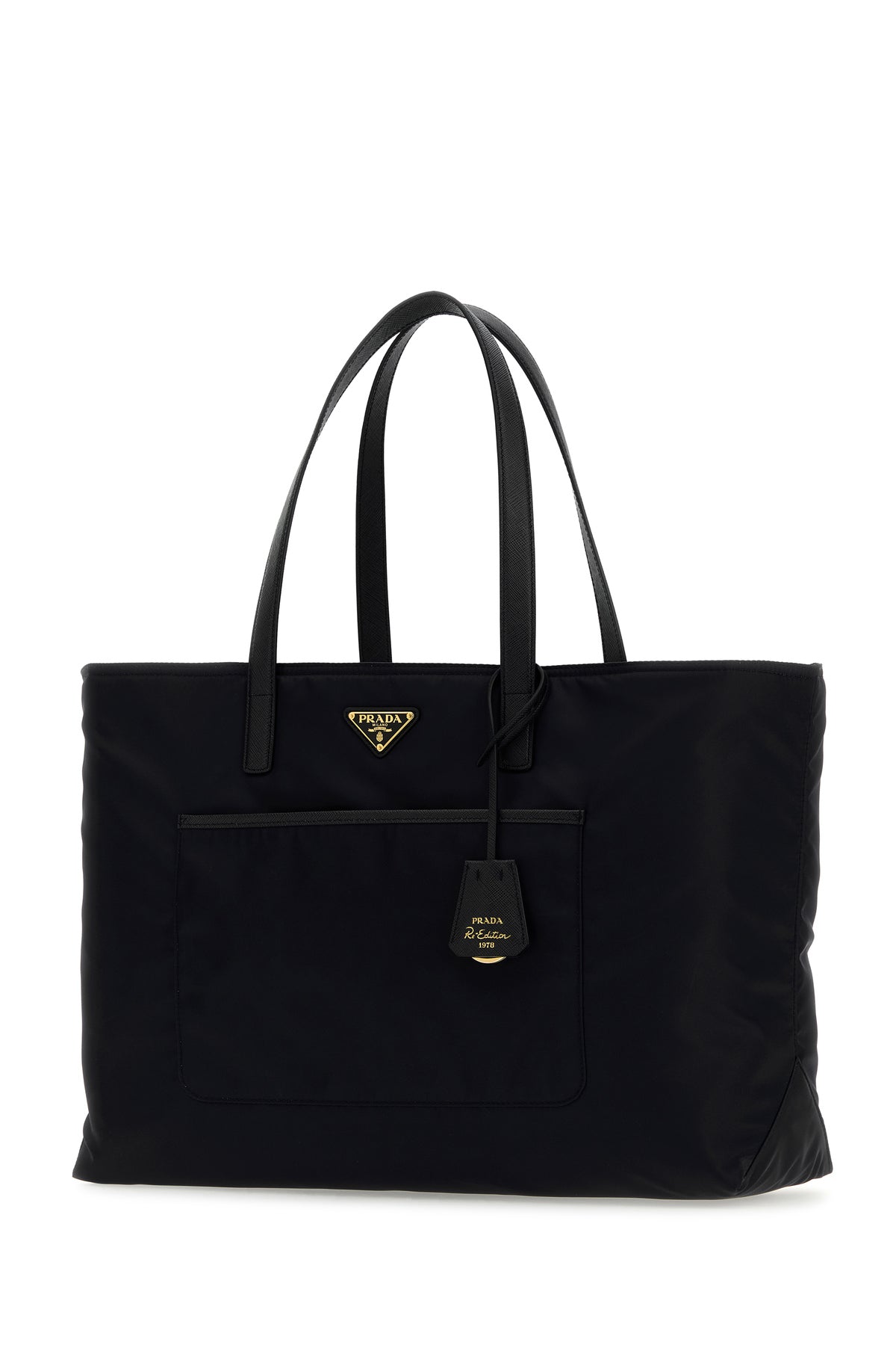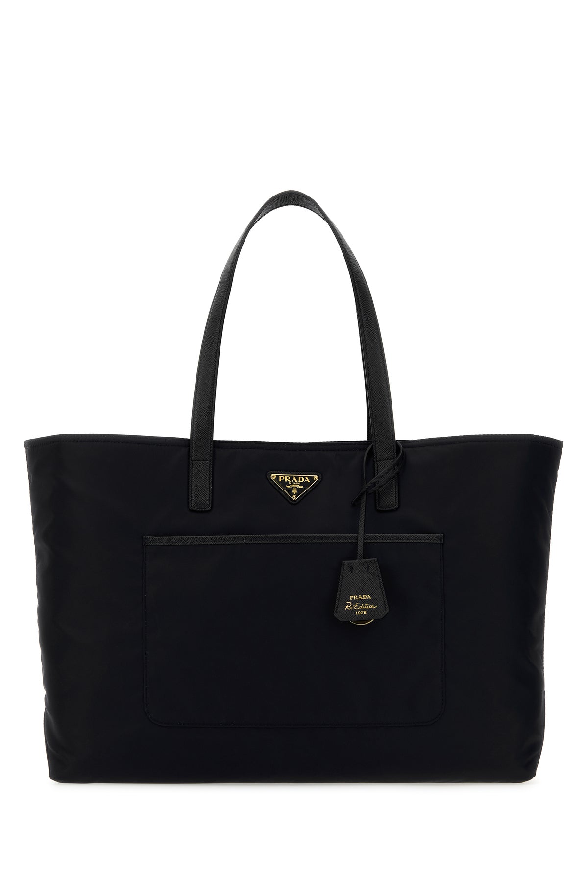 Borsa shopping realizzata in Re-Nylon arricchita da iconico triangolo logato sulla parte frontale e accessorio amovibile in pelle.