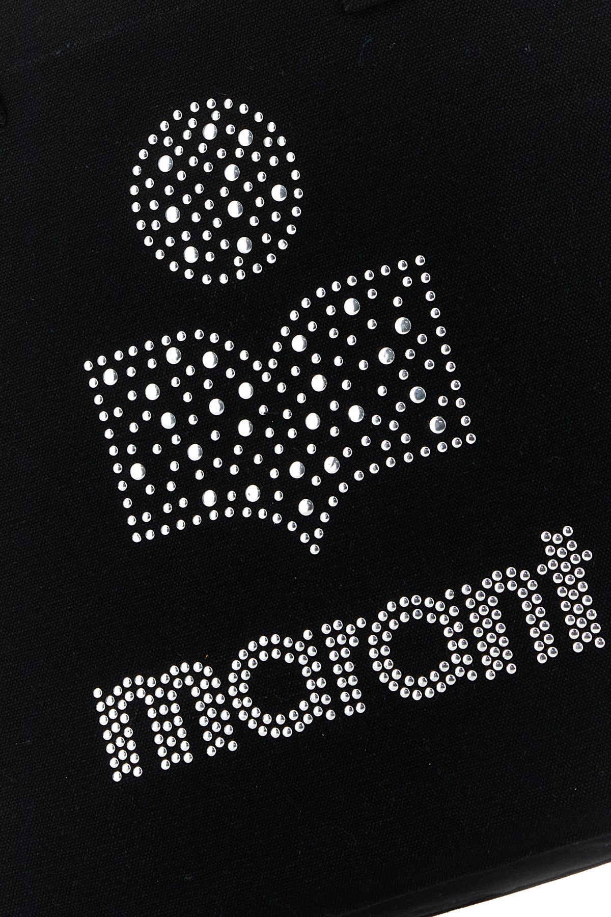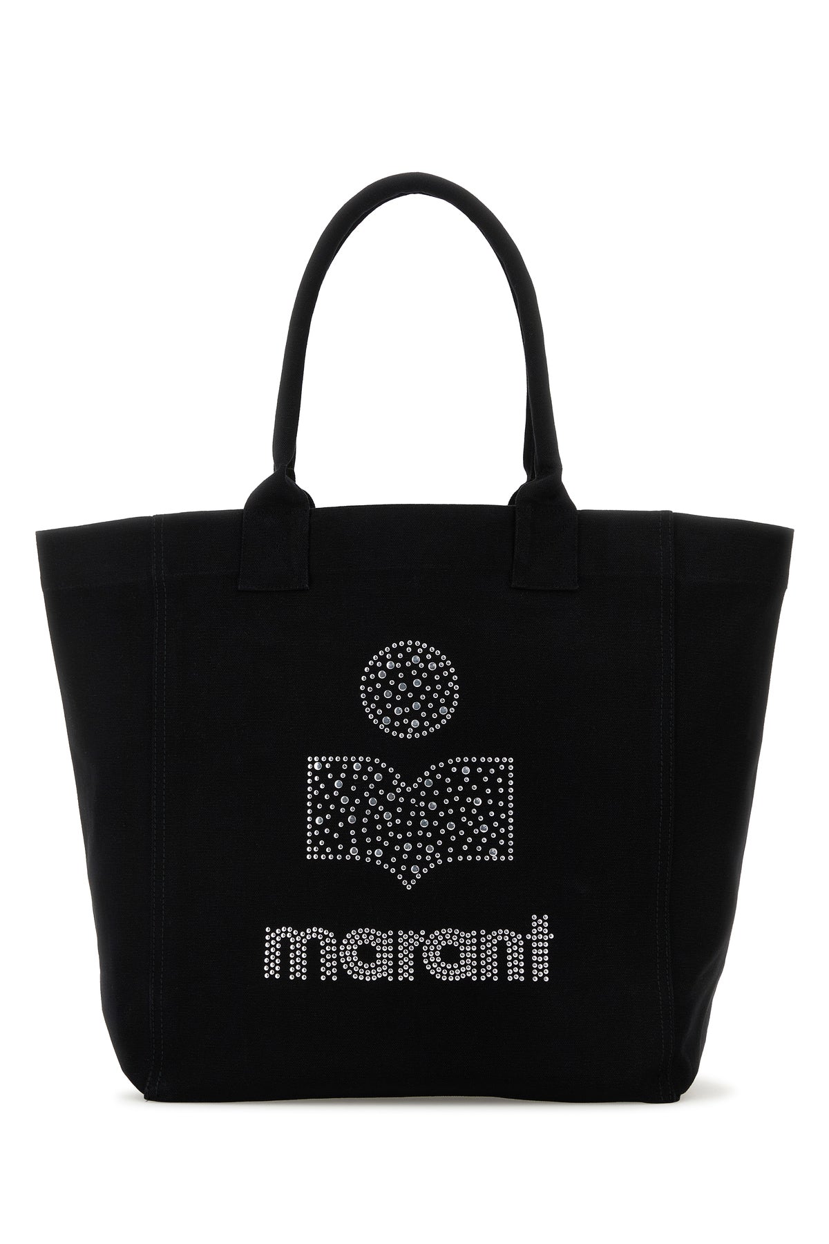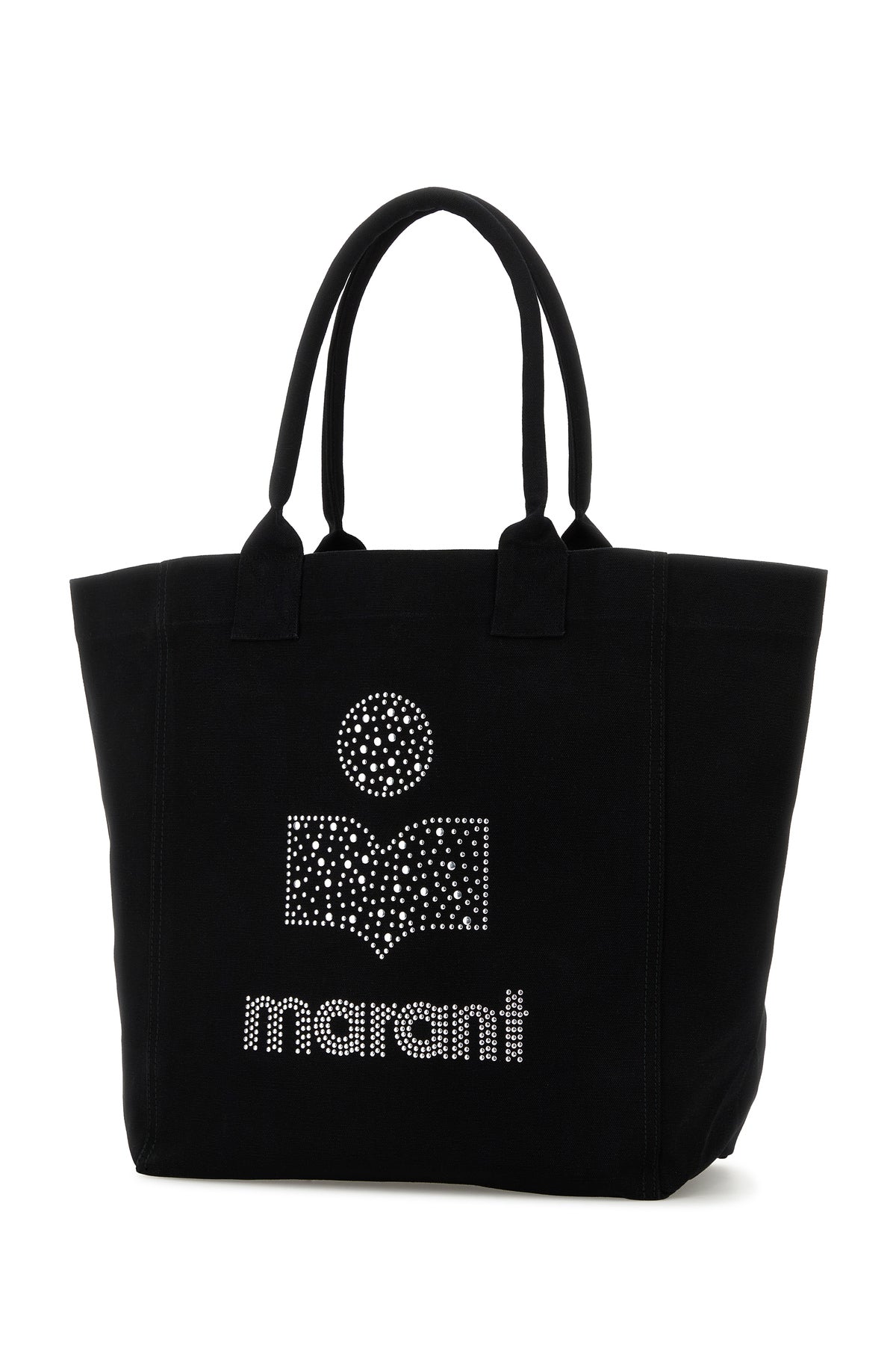 Borsa shopping realizzata in tela di puro cotone arricchita da logo in borchie metalliche sulla parte frontale.
