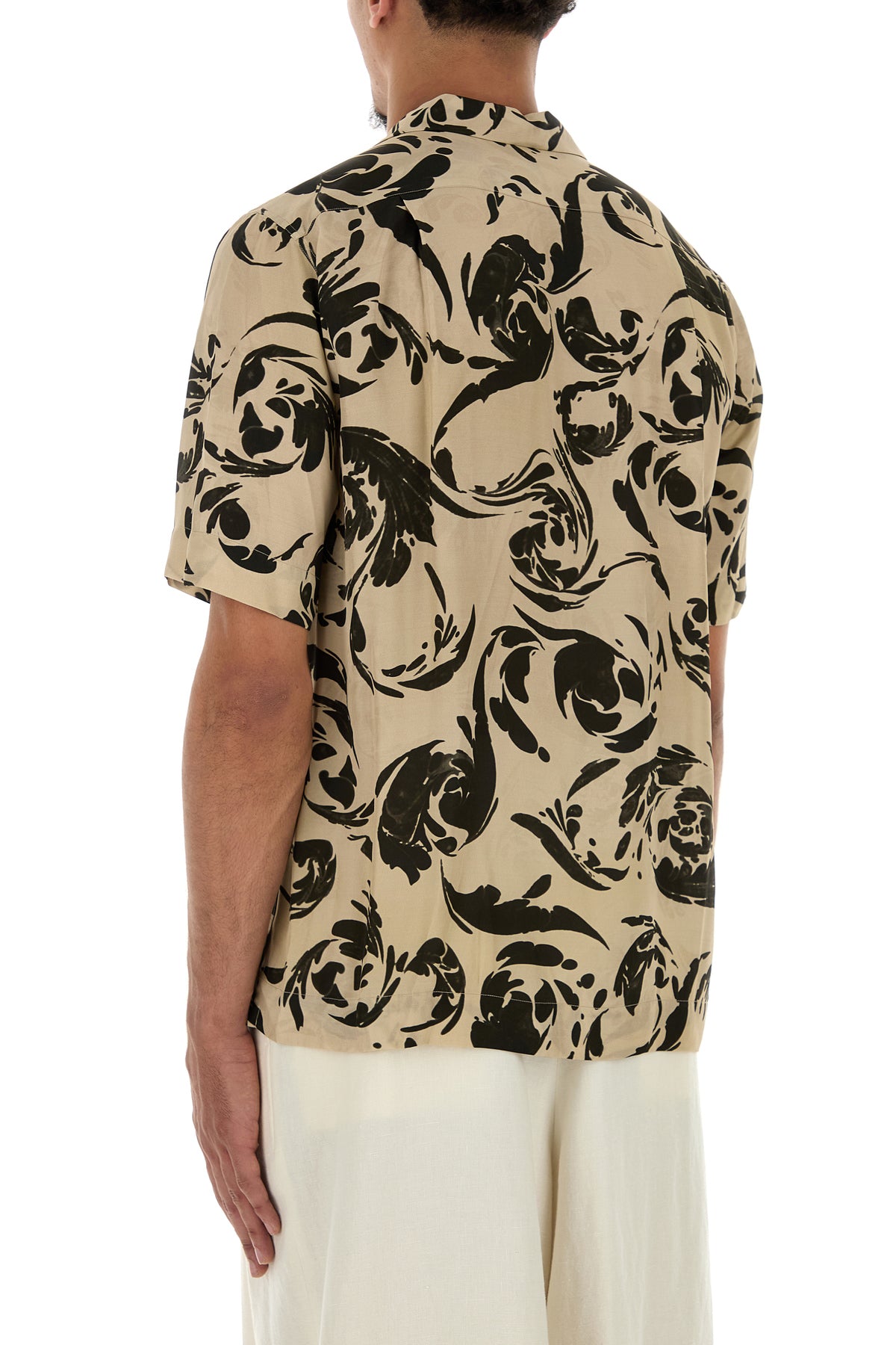 Camicia a maniche corte realizzata in viscosa caratterizzata da particolare stampa su tutta la superficie arricchita da particolare decorazione sul petto.