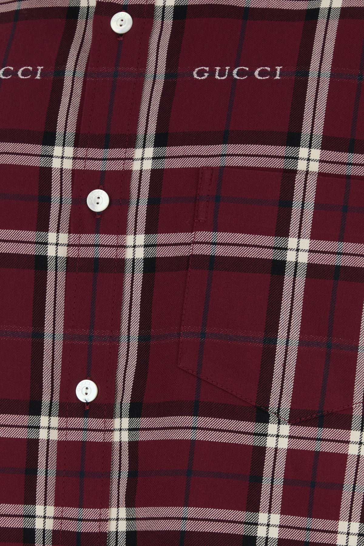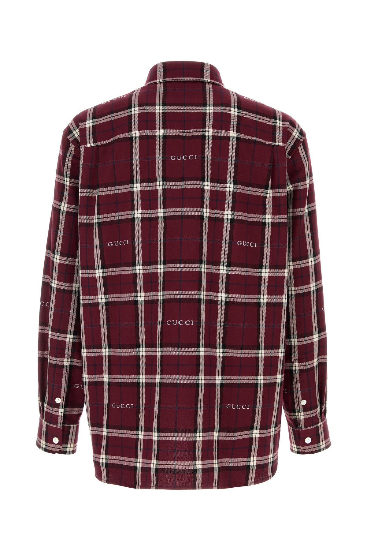 Camicia realizzata in puro cotone caratterizzata da ricamo a motivo tartan su tutta la superficie e ricamo Gucci sul petto.
