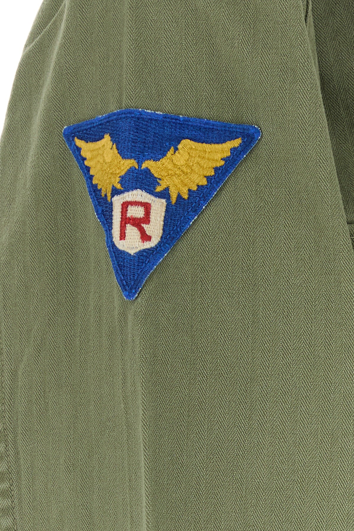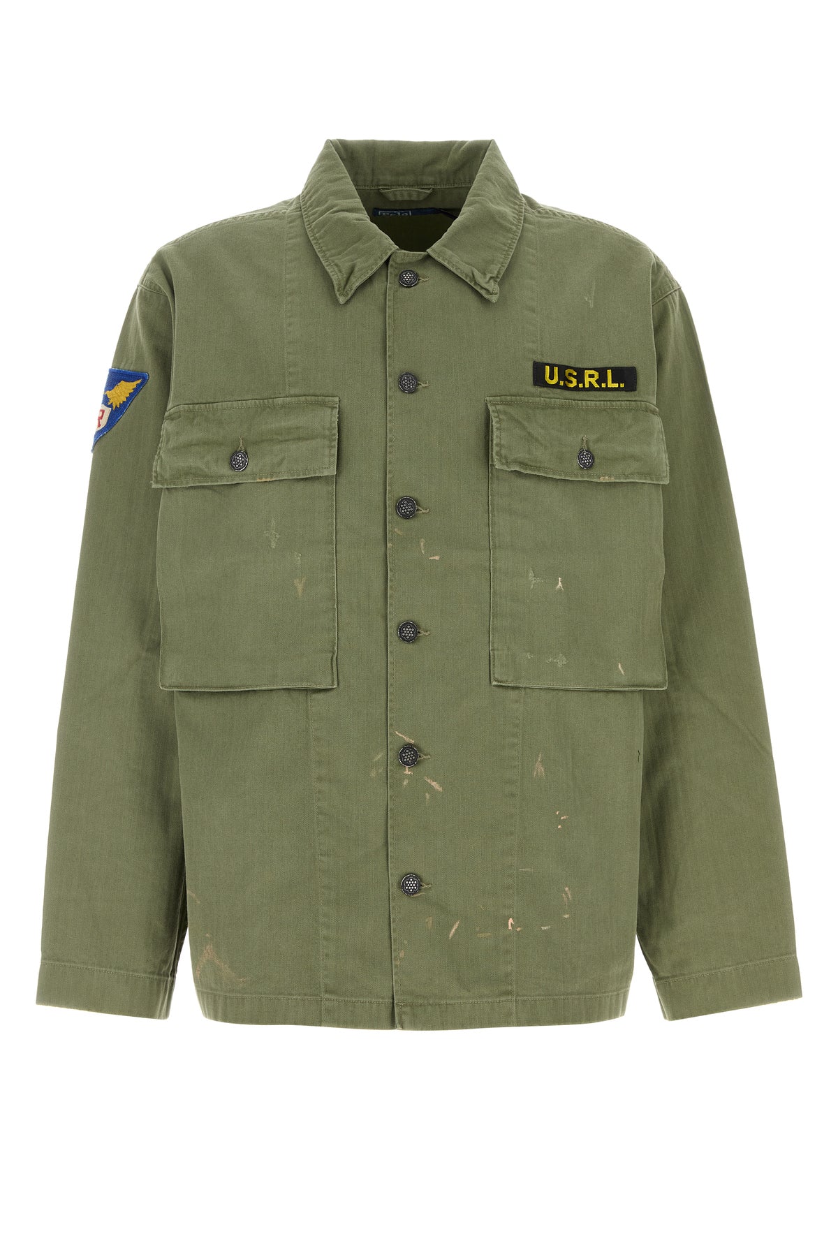 Camicia realizzata in puro cotone con sporcature intenzionali arricchita da particolari applicazioni sul petto e sulla manica.