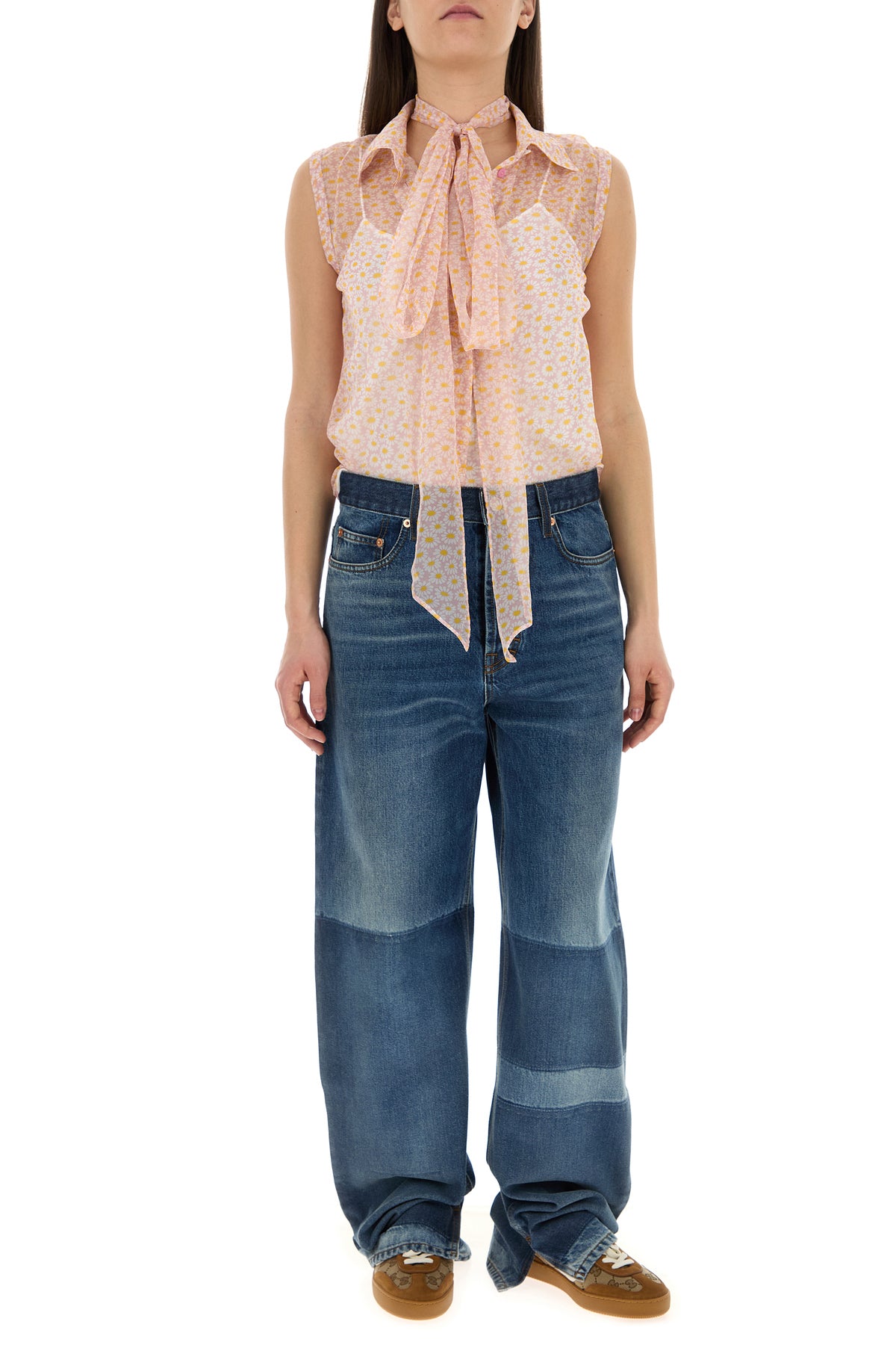 Camicia smanicata realizzata in crepe caratterizzata da stampa floreale su tutta la superficie.