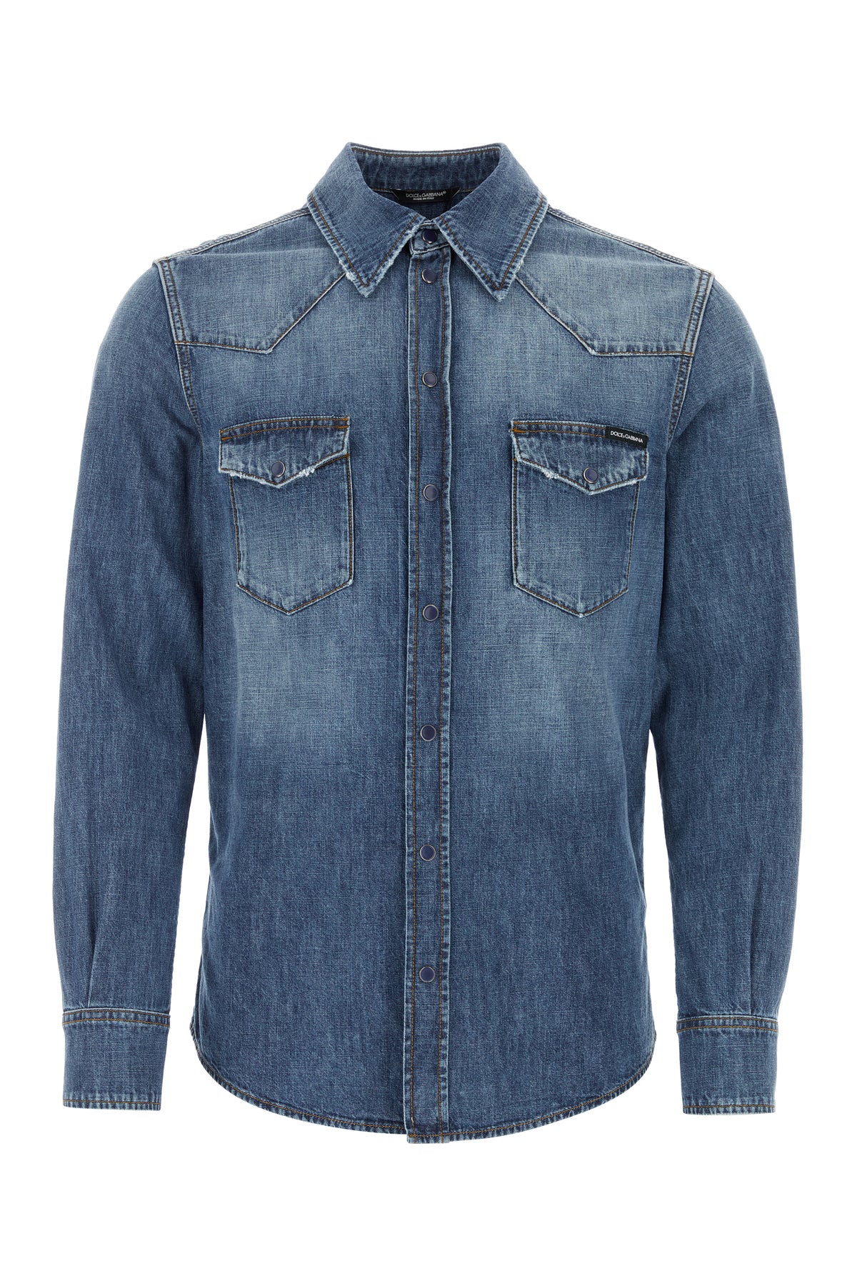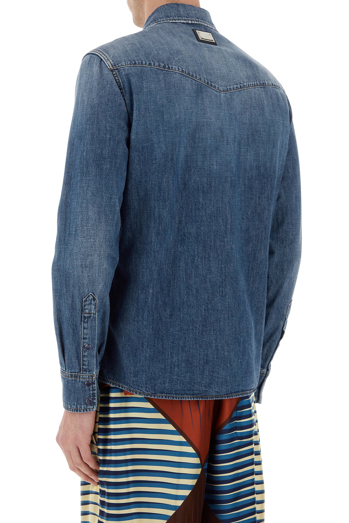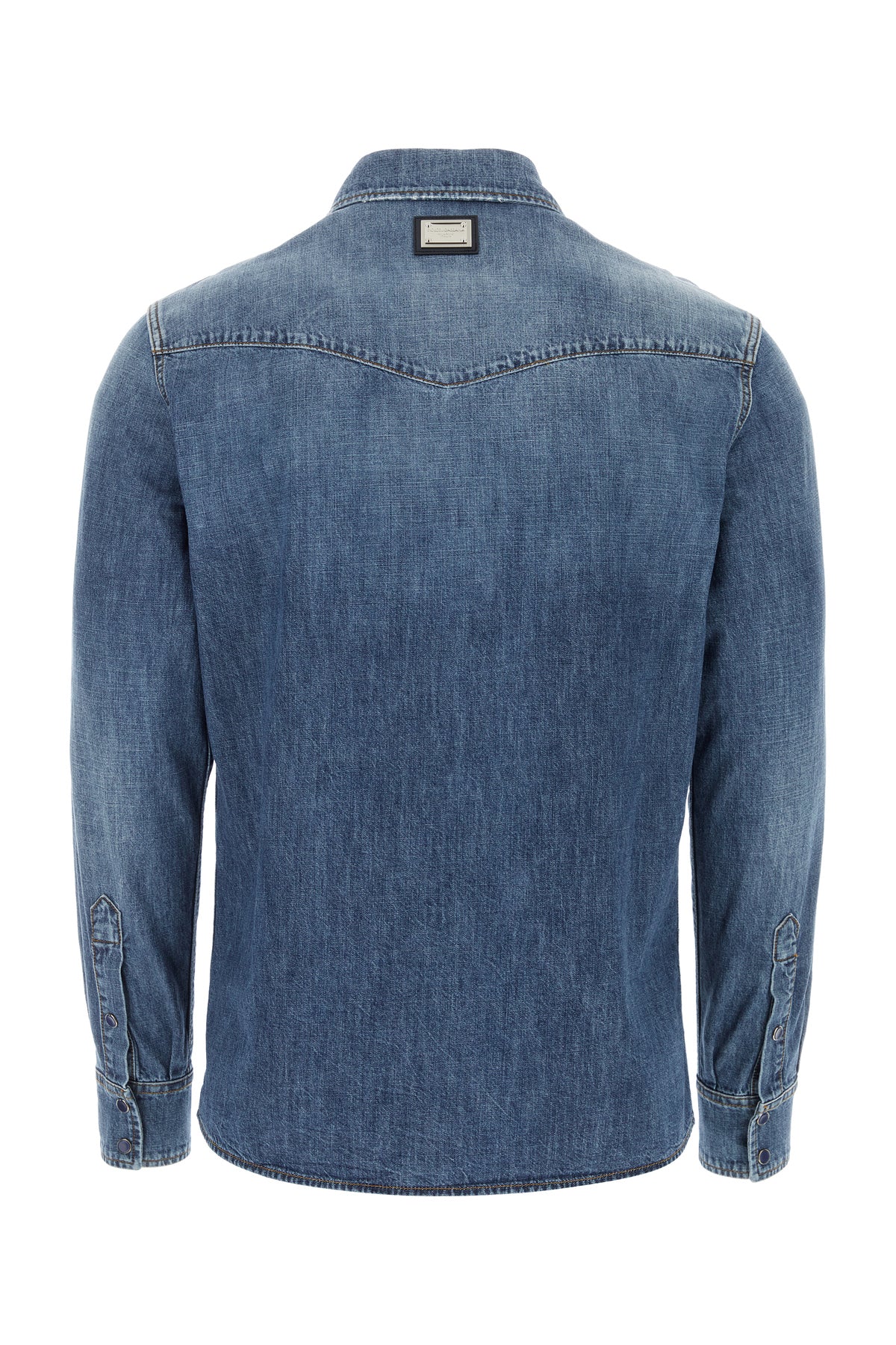 Camicia realizzata in denim di puro cotone slavato arricchita da etichetta logata a contrasto sul petto e targhetta metallica logata sul retro.