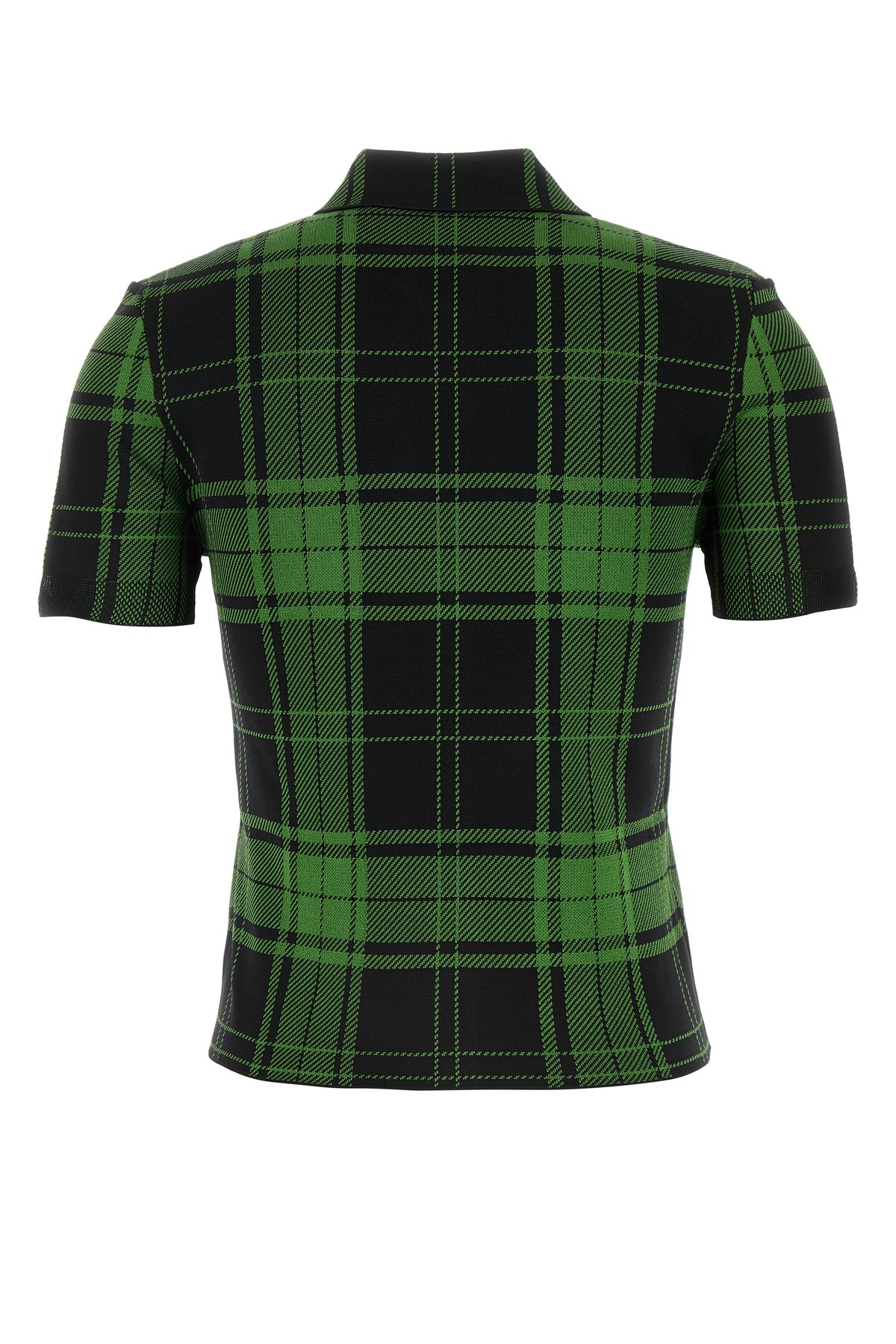 Camicia a maniche corte realizzata in misto seta stretch caratterizzata da ricamo a motivo tartan su tutta la superficie.