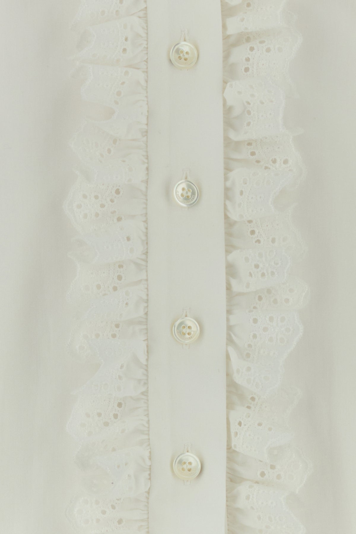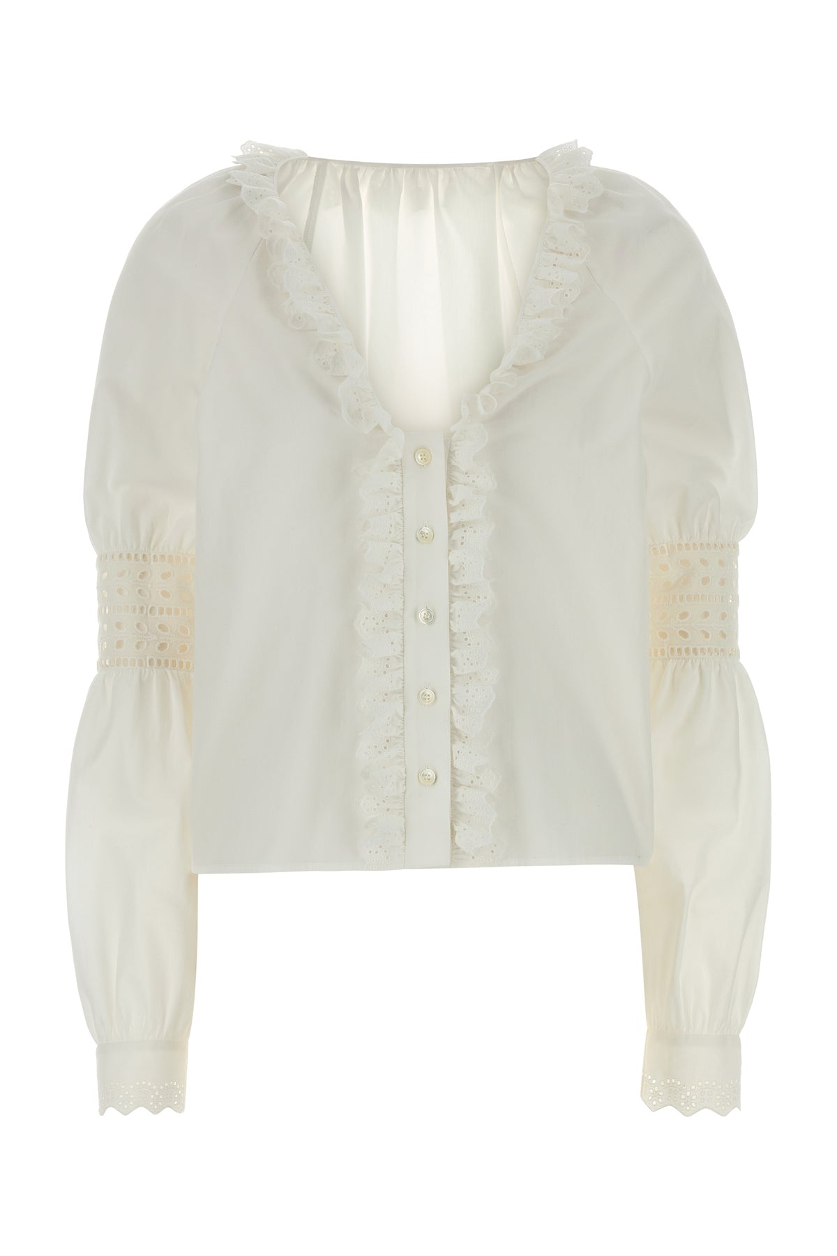 Camicia realizzata in popeline di puro cotone con inserti in pizzo sangallo sulle maniche arricchita da ruches sulla scollatura a V e sulla chiusura mediante bottoni - Maniche alla raglan
