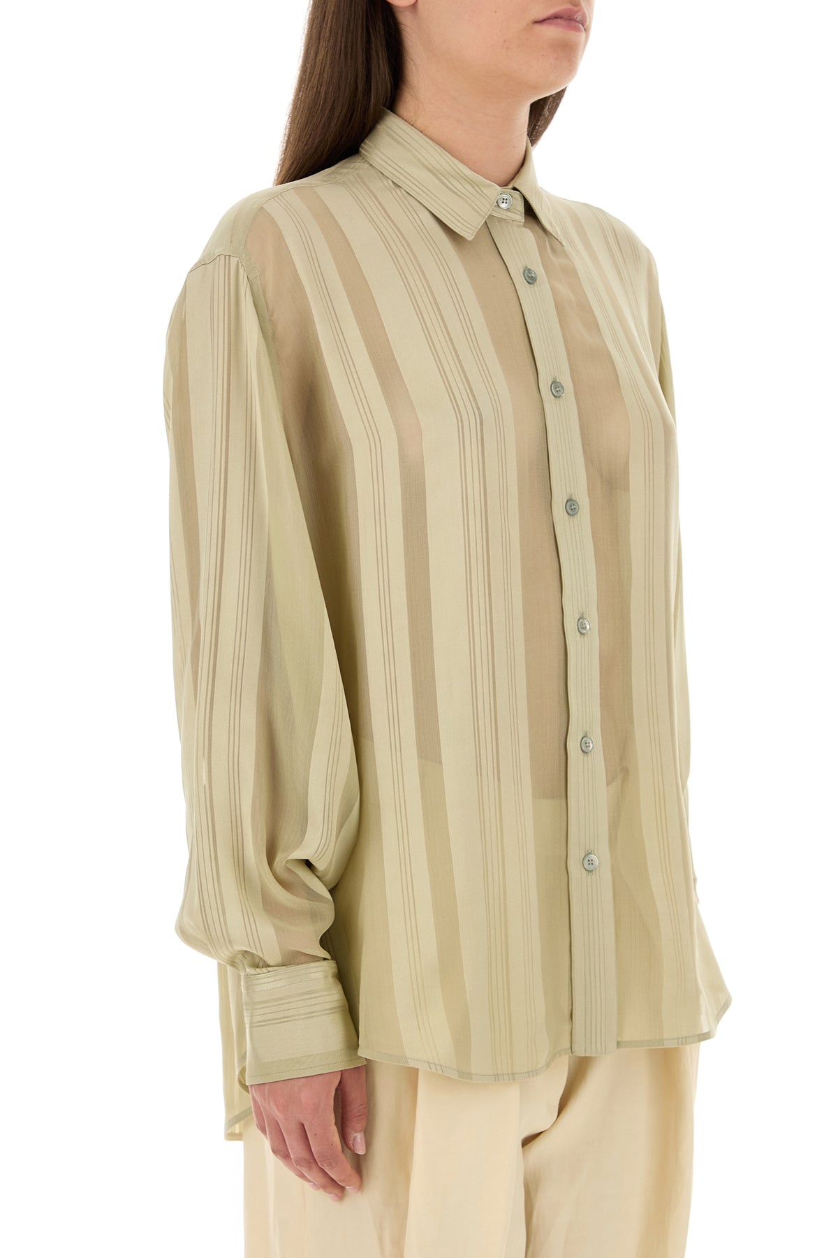 Camicia realizzata in pura seta caratterizzata da ricamo a righe su tutta la superficie.