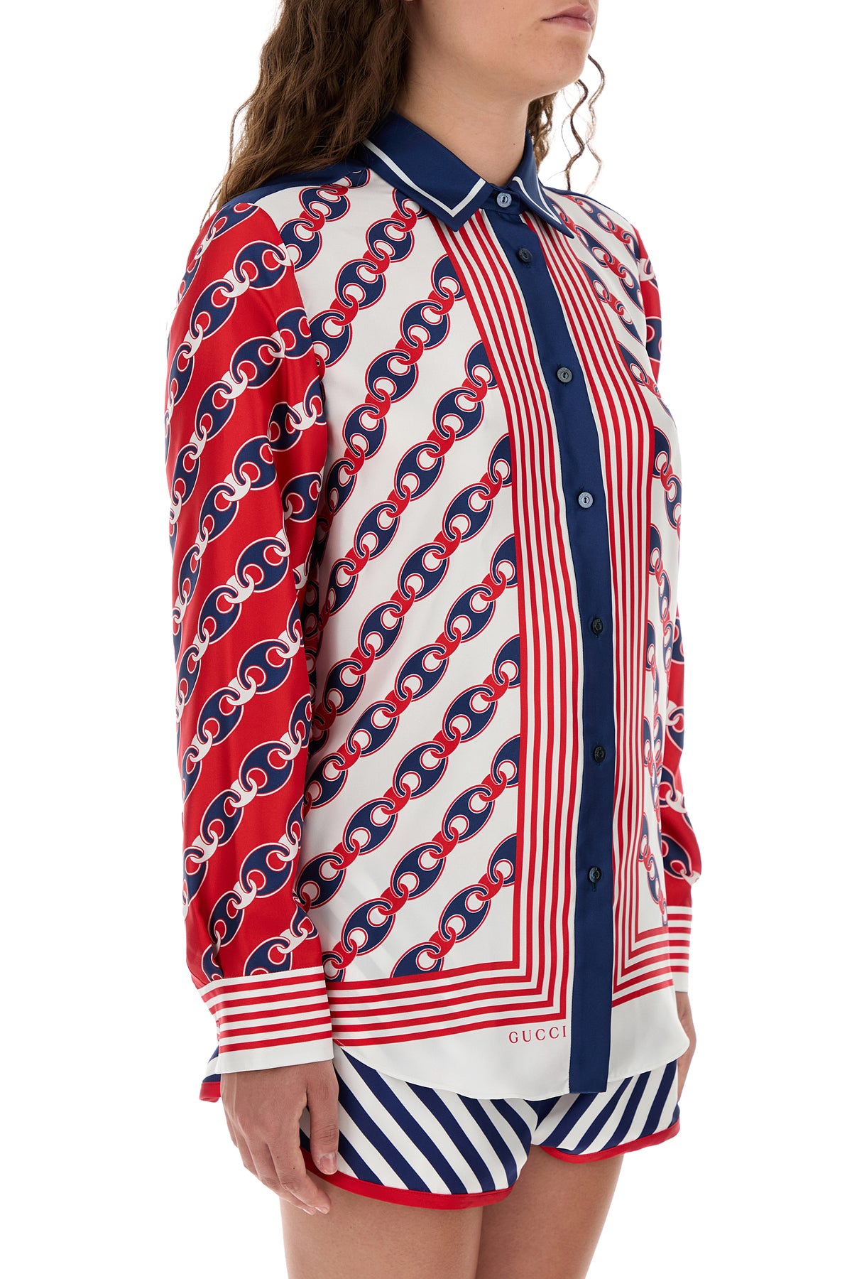Camicia realizzata in pura seta caratterizzata da stampa Gucci Marina Chain su tutta la superficie.