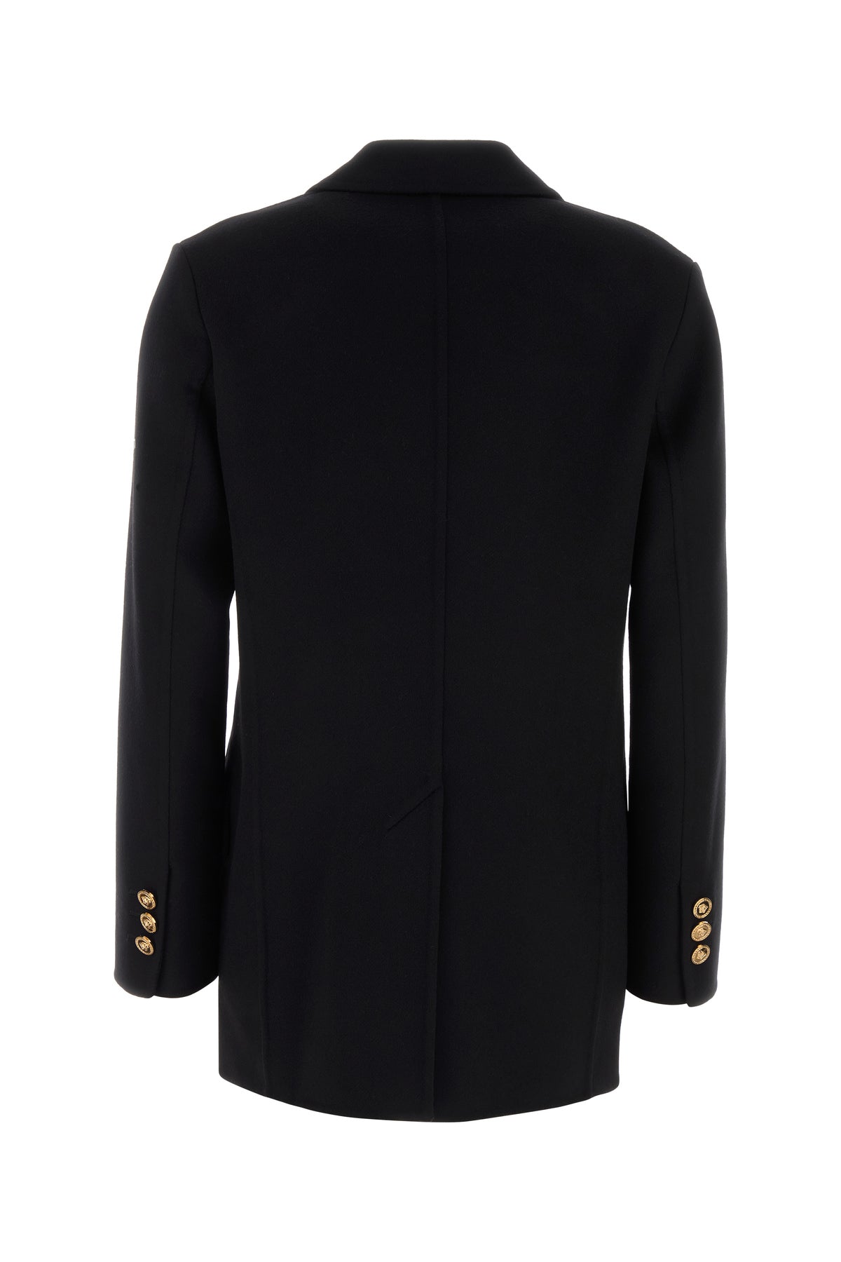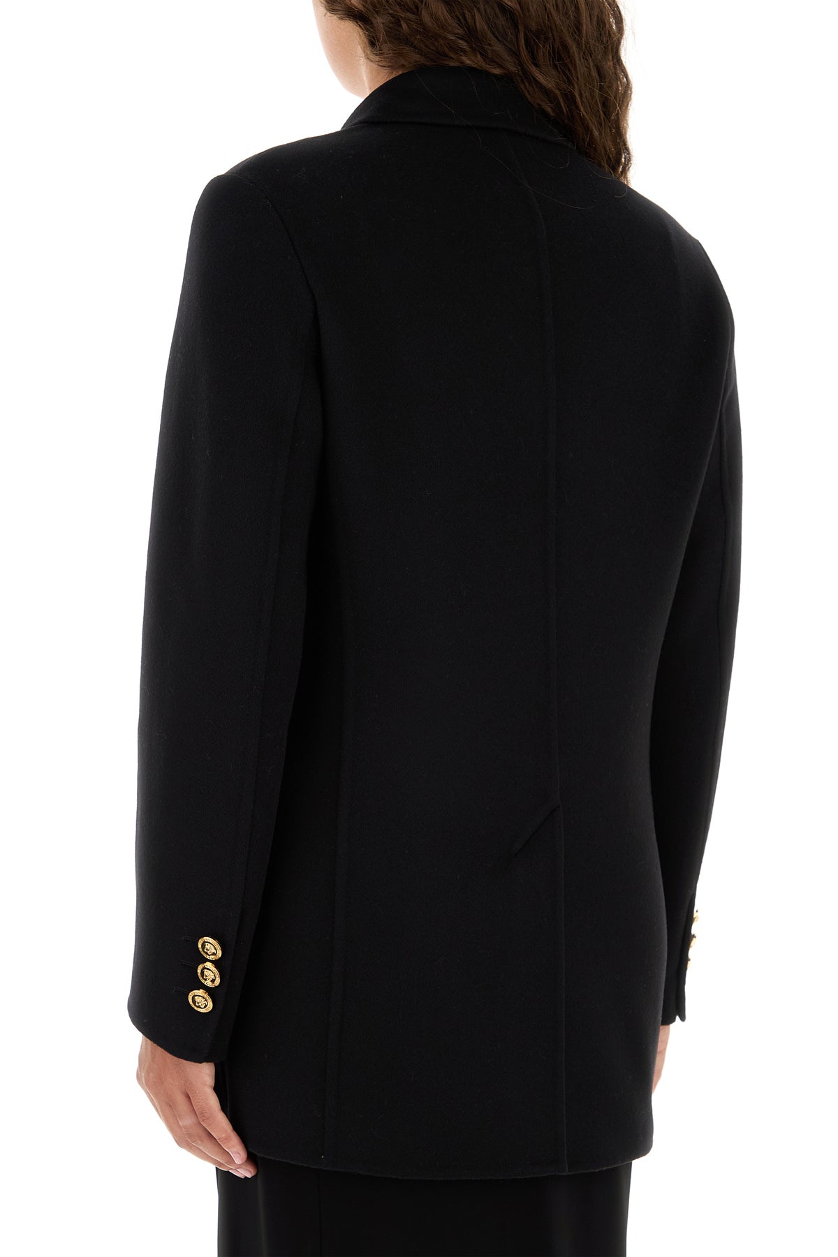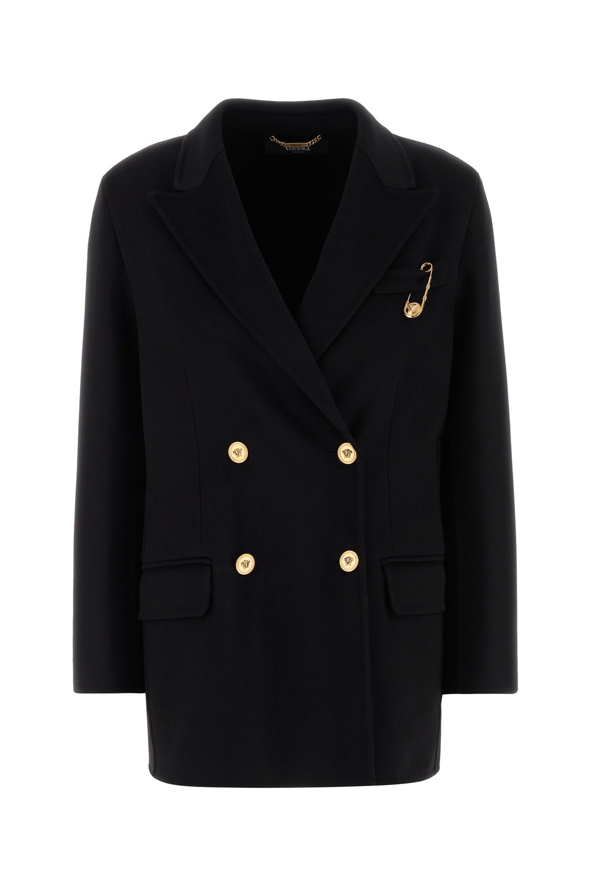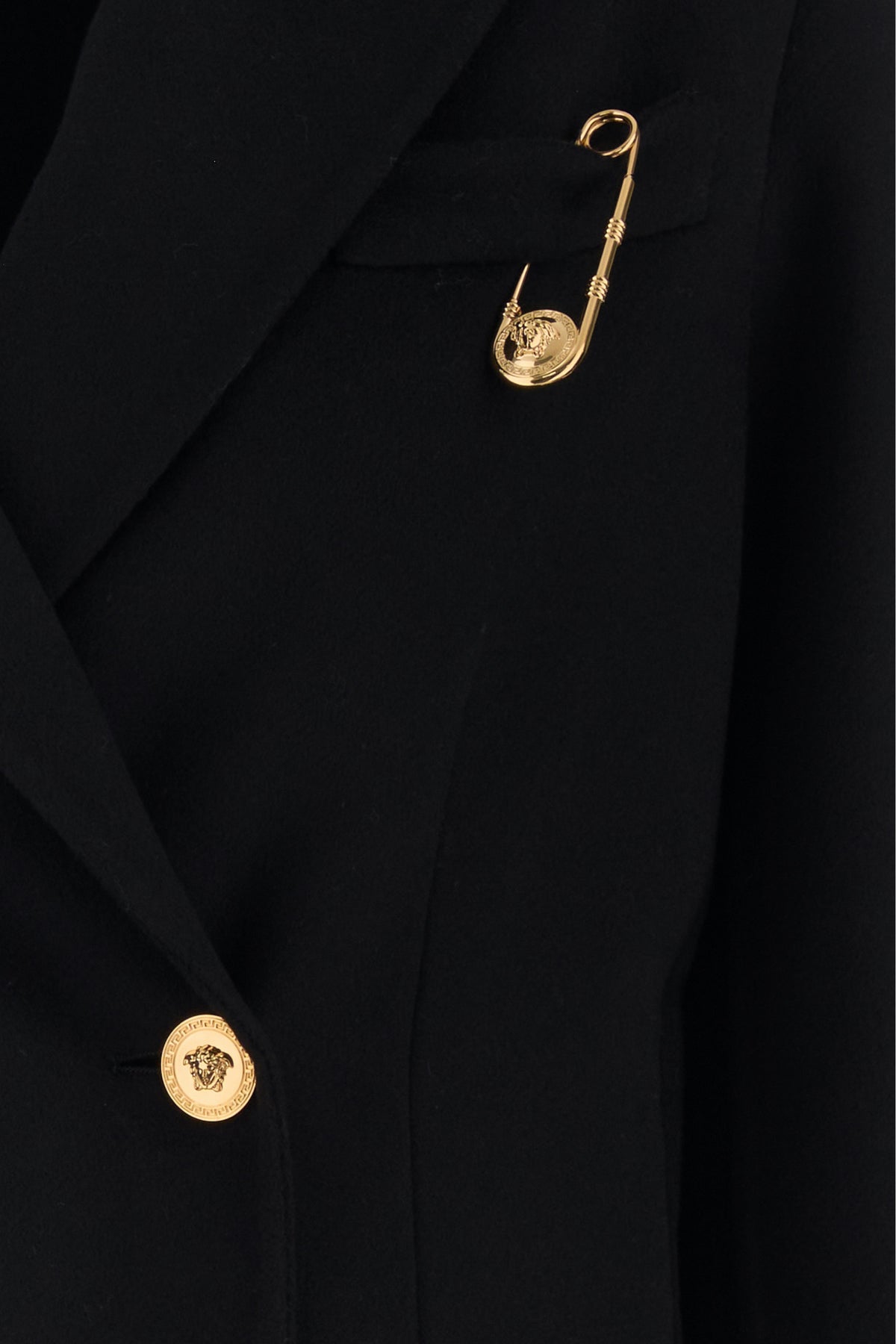 Cappotto dal taglio corto realizzato in cashmere e lana vergine arricchito da dettaglio Safety Pin in metallo sul petto e bottoni iconica Testa di Medusa.