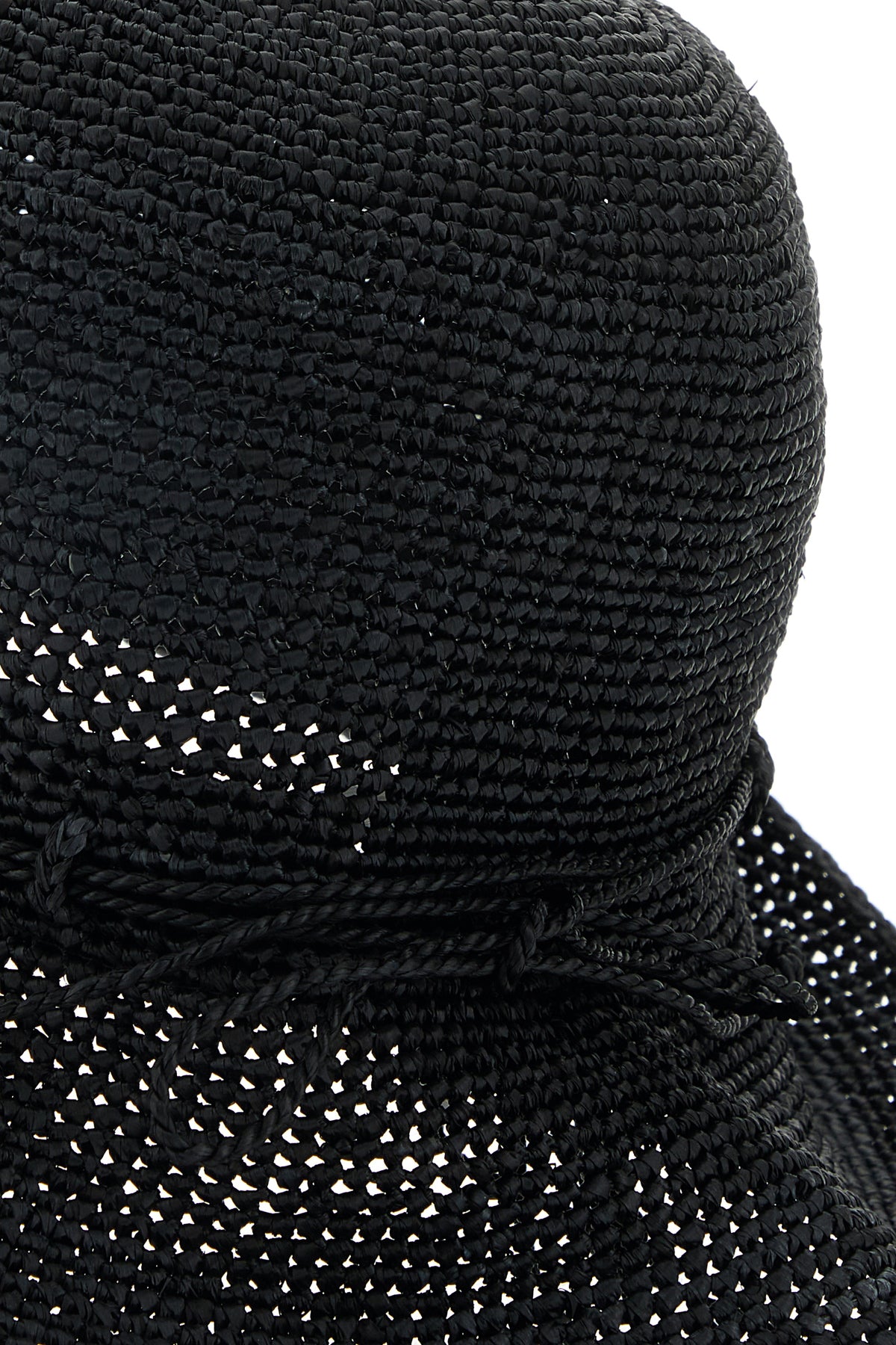Cappello realizzato in rafia arricchito da nastro da annodare in rafia tonale e dettaglio logato in metallo sul lato.