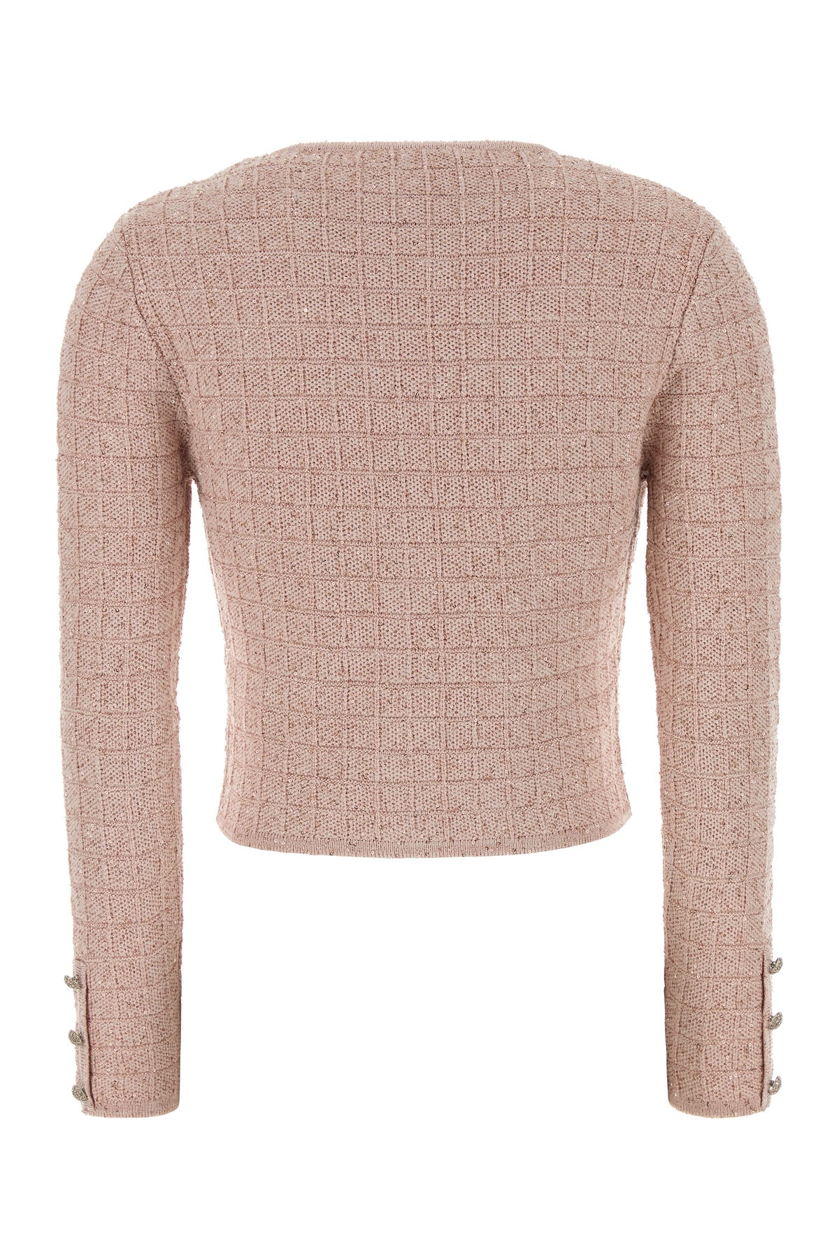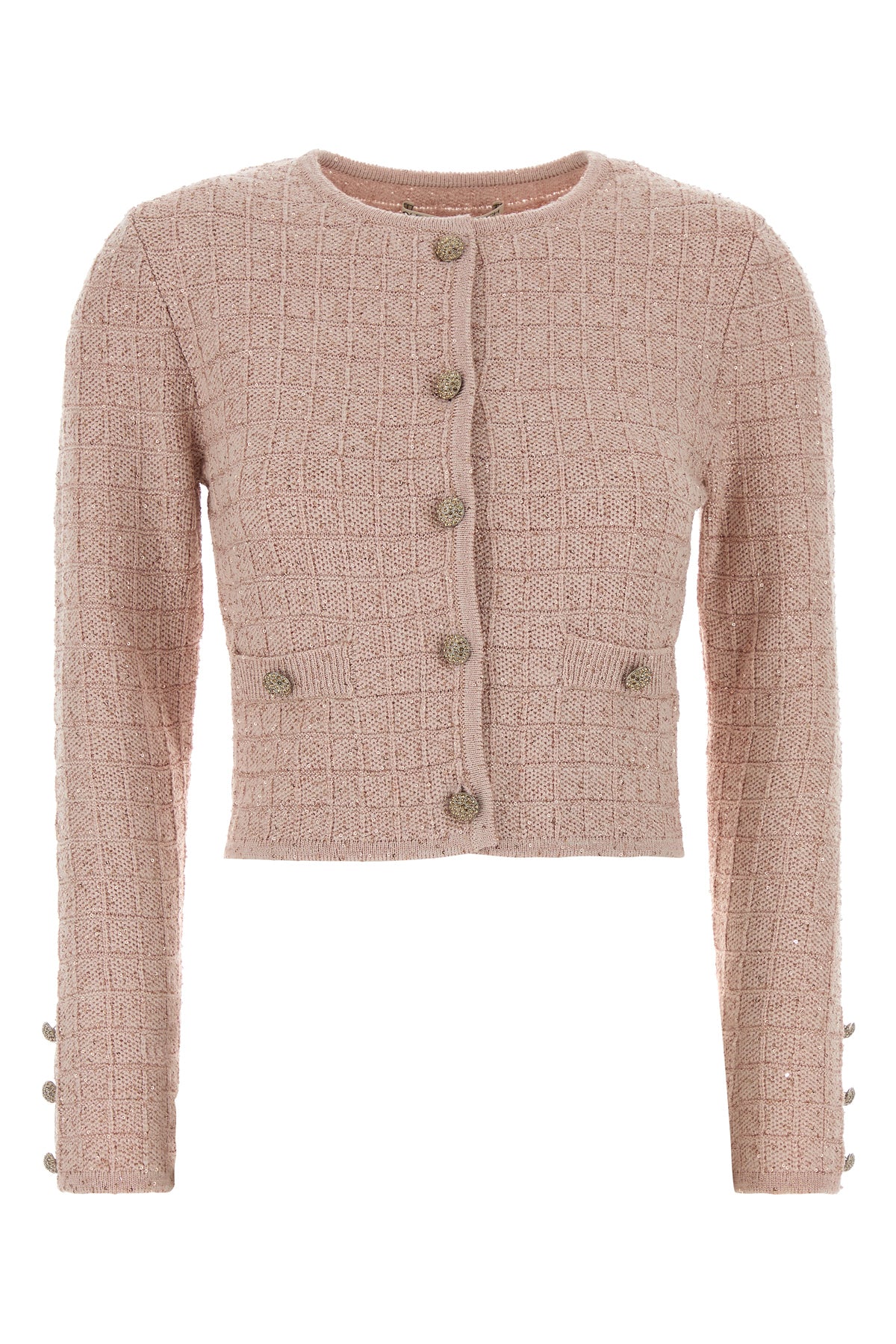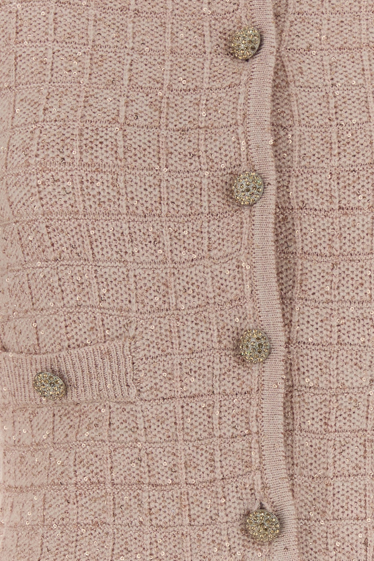 Cardigan realizzato in bouclè arricchito da paillettes su tutta la superficie.