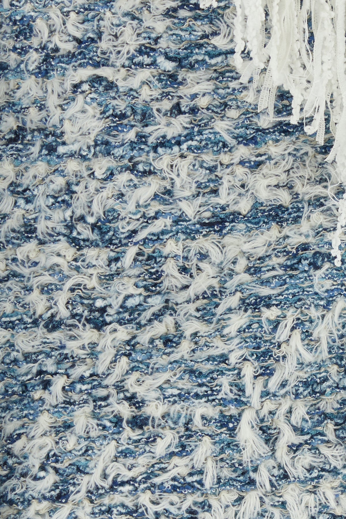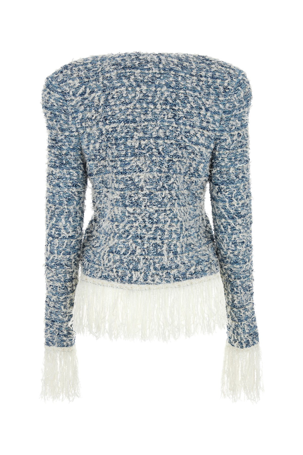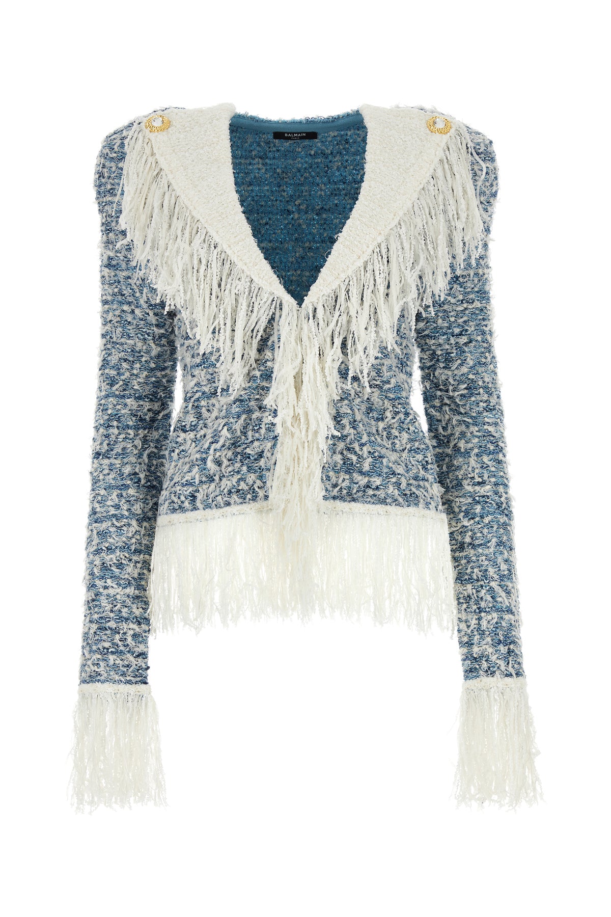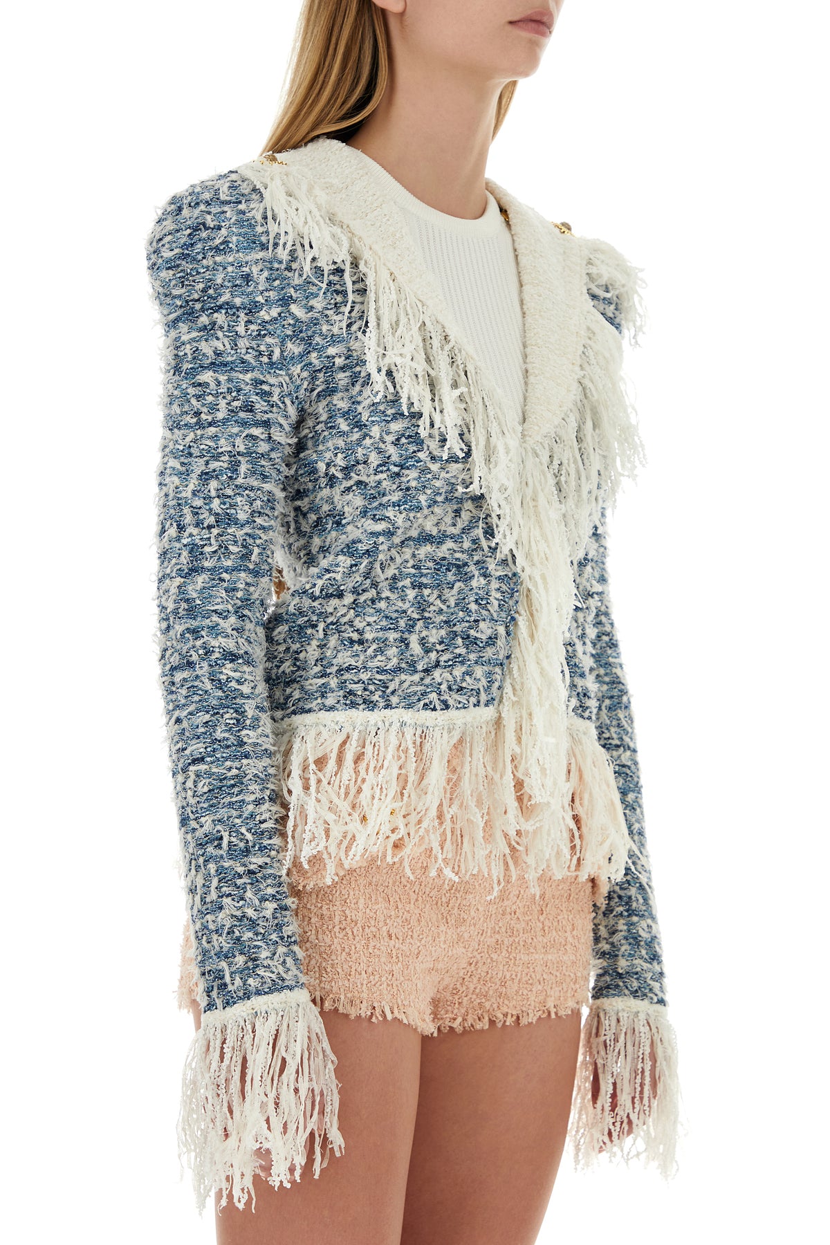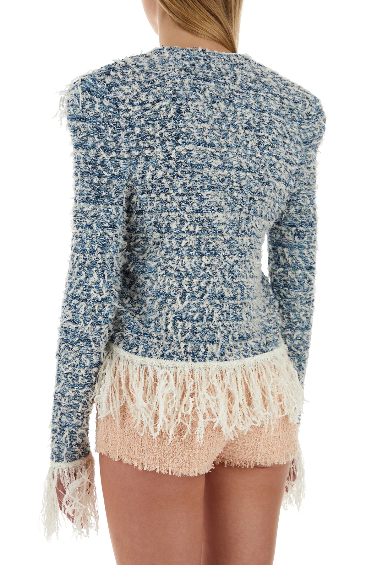 Cardigan realizzato in tweed arricchito da bottoni gioiello decorativi sulla parte frontale e frange sulla parte frontale, sui polsini e sul fondo.