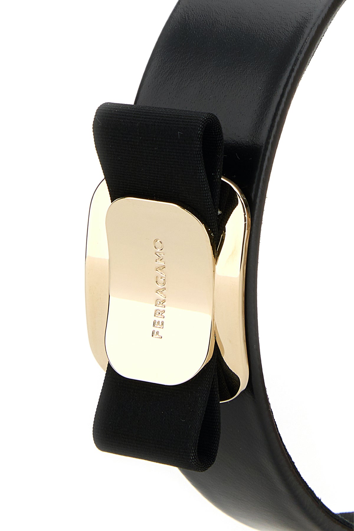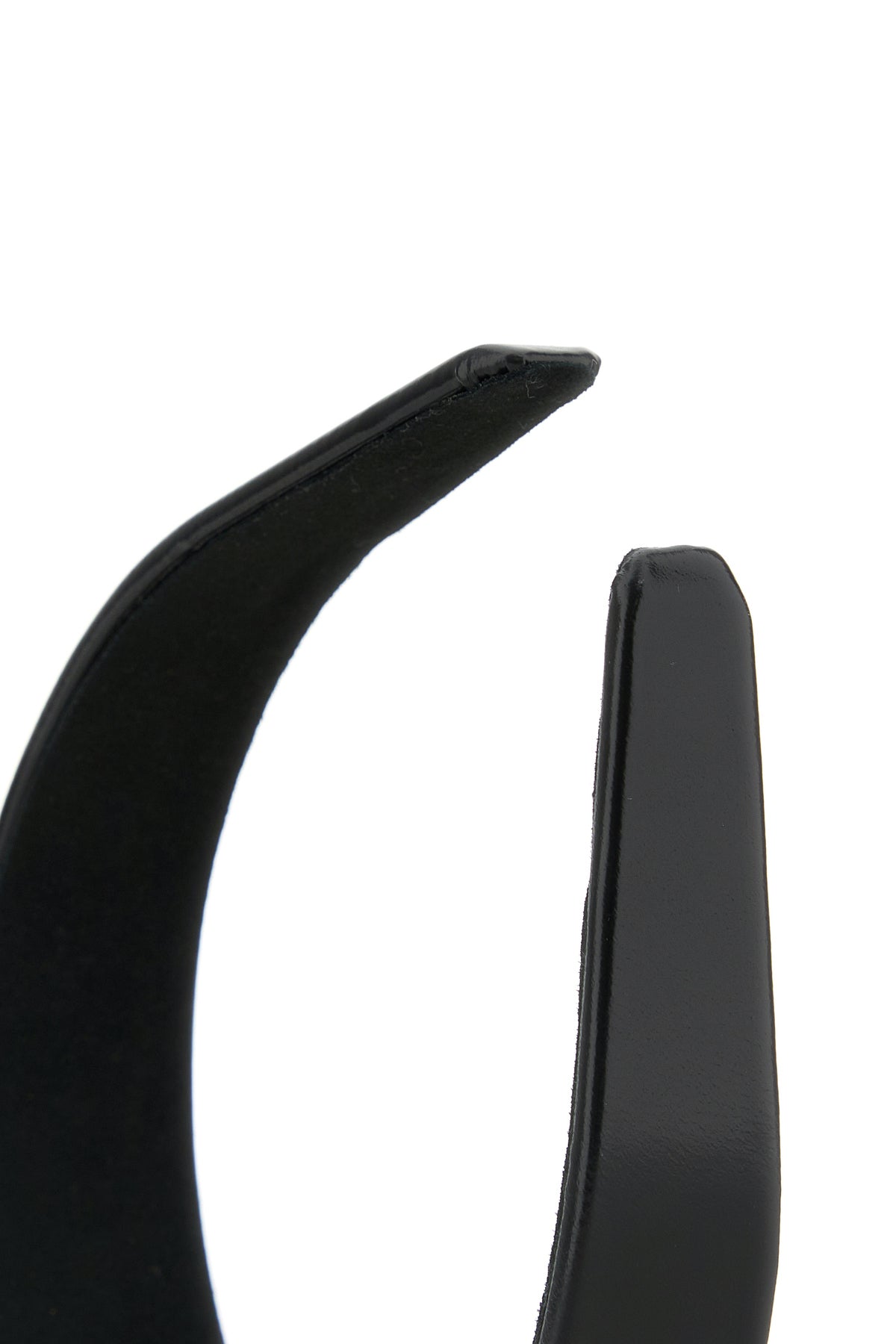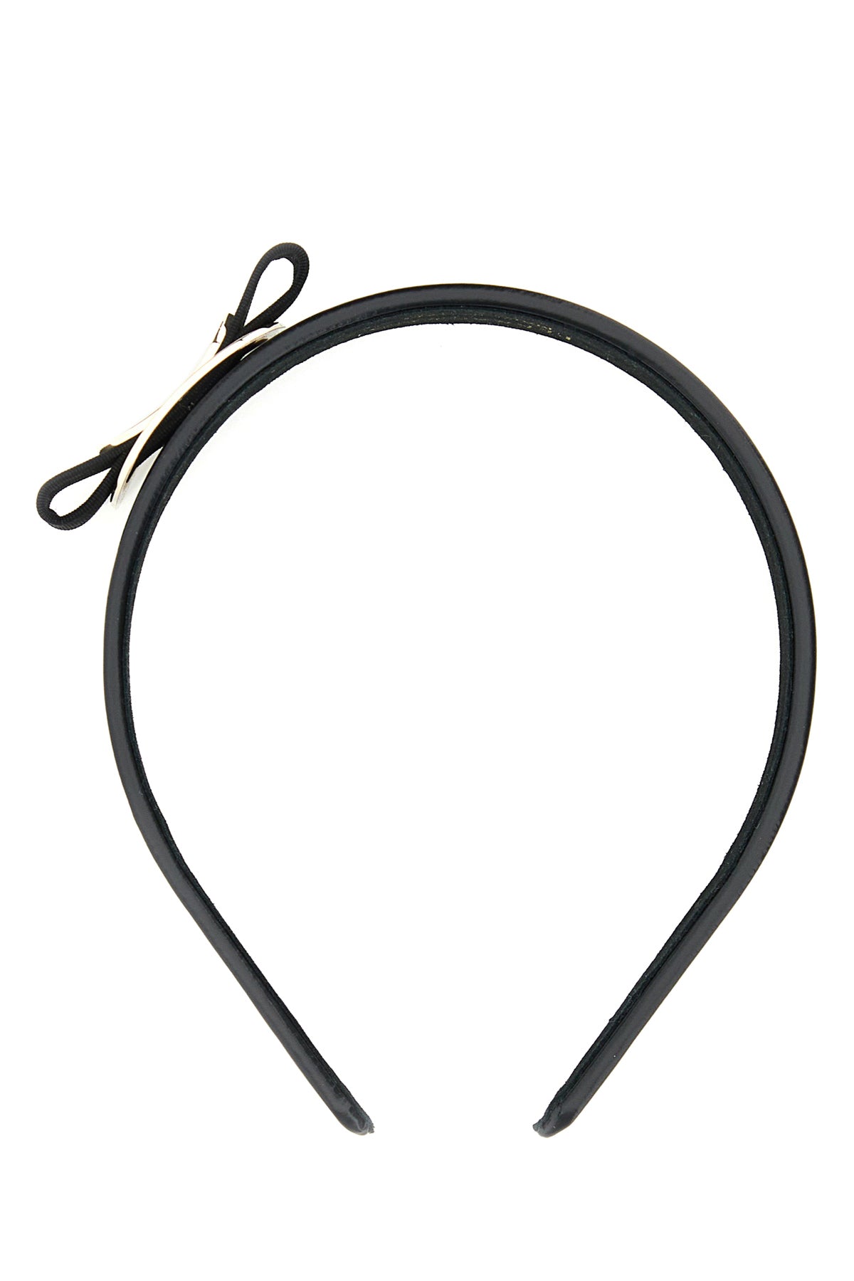Cerchietto realizzato in pelle liscia arricchito da fiocco Vara in tessuto tonale con dettaglio metallico.