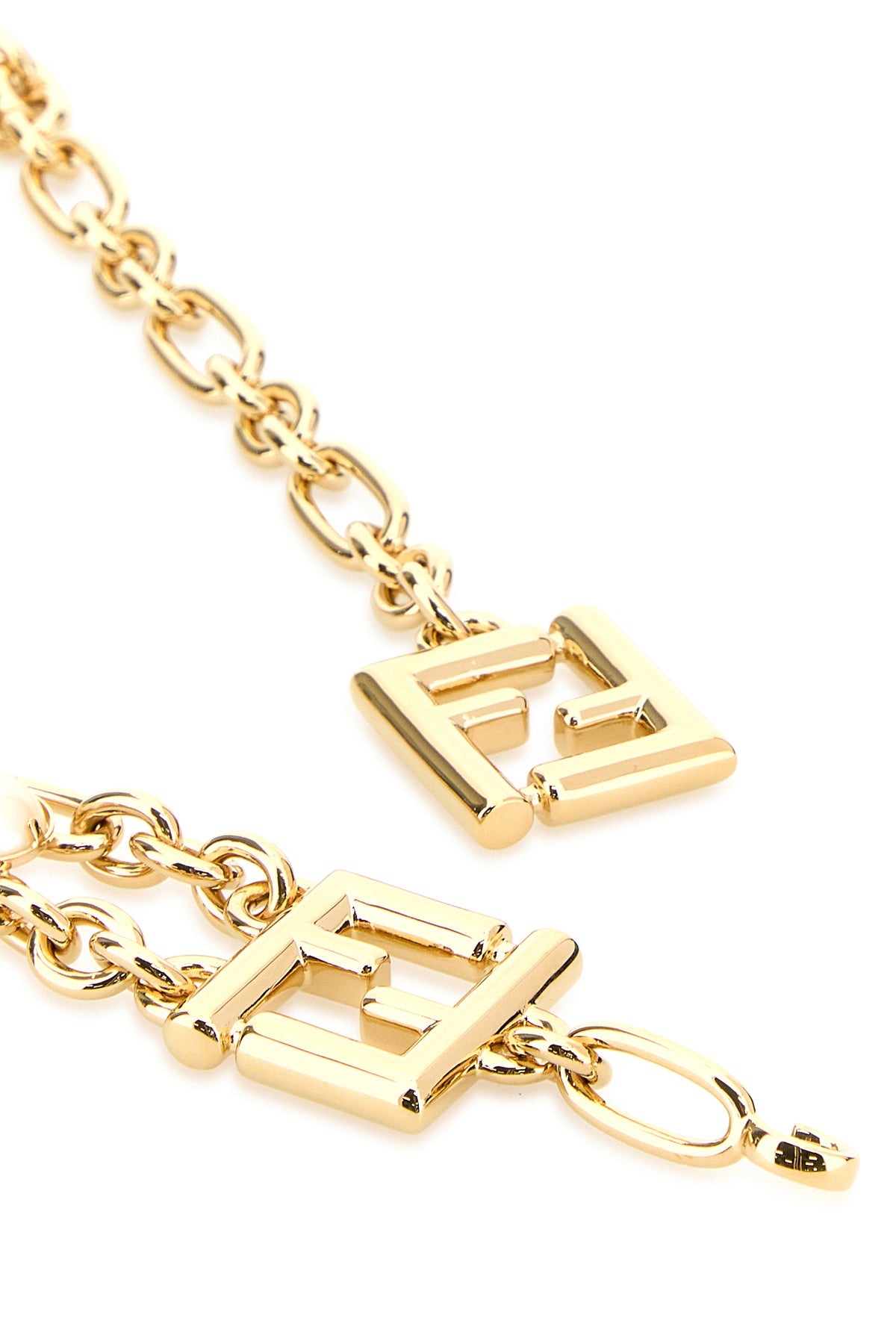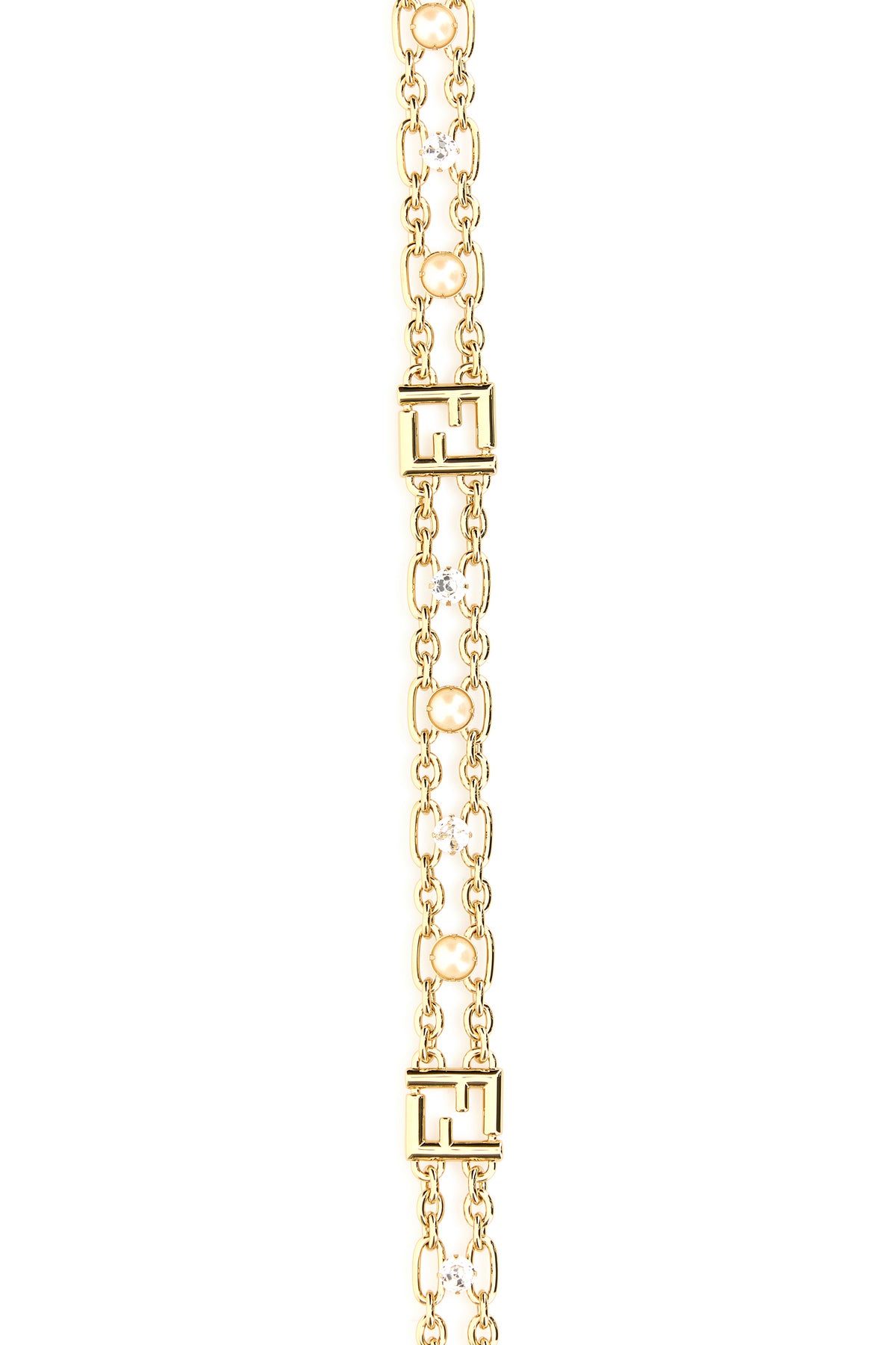 Cintura realizzata in metallo placcato color oro arricchita da charm FF, cristalli e perle.