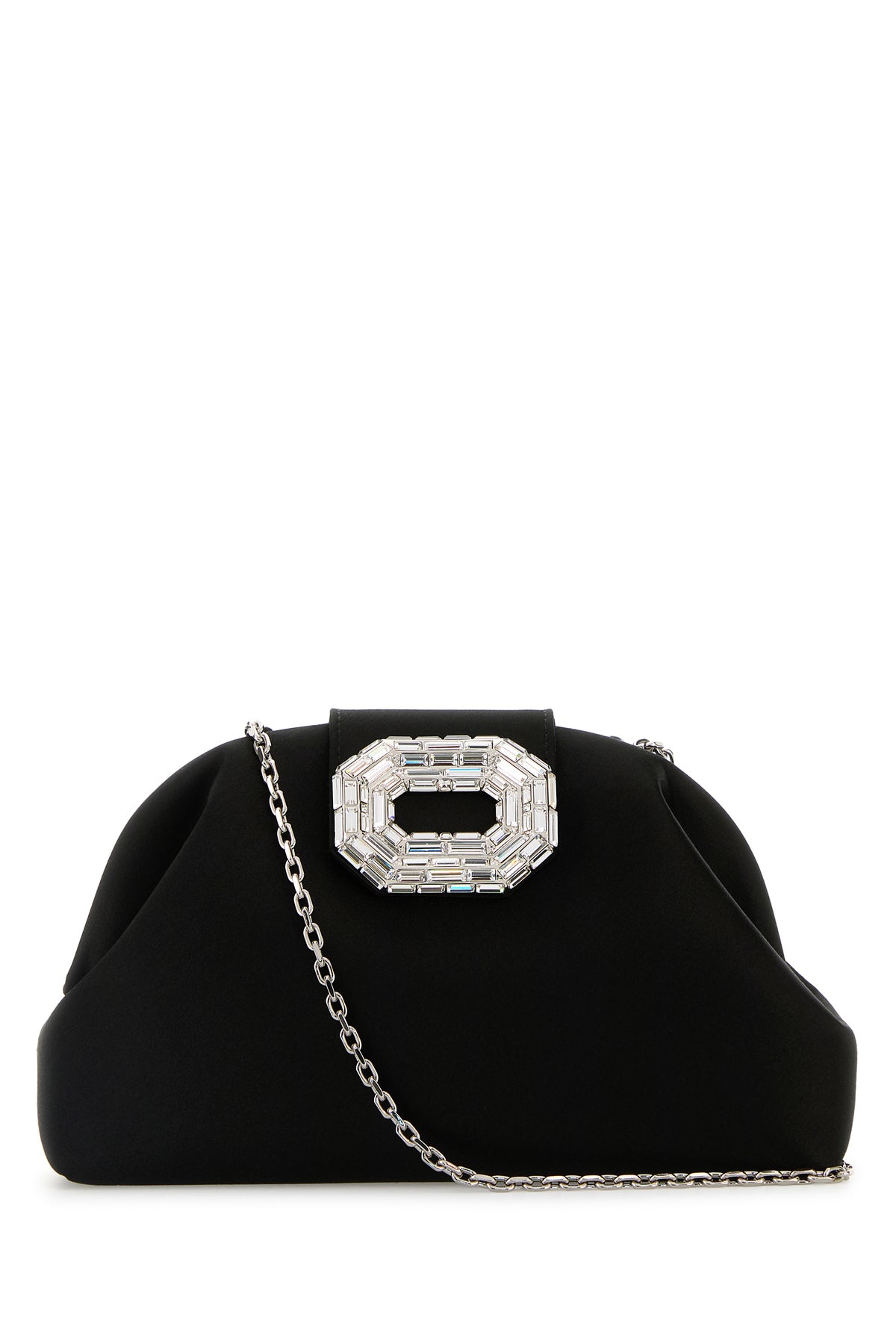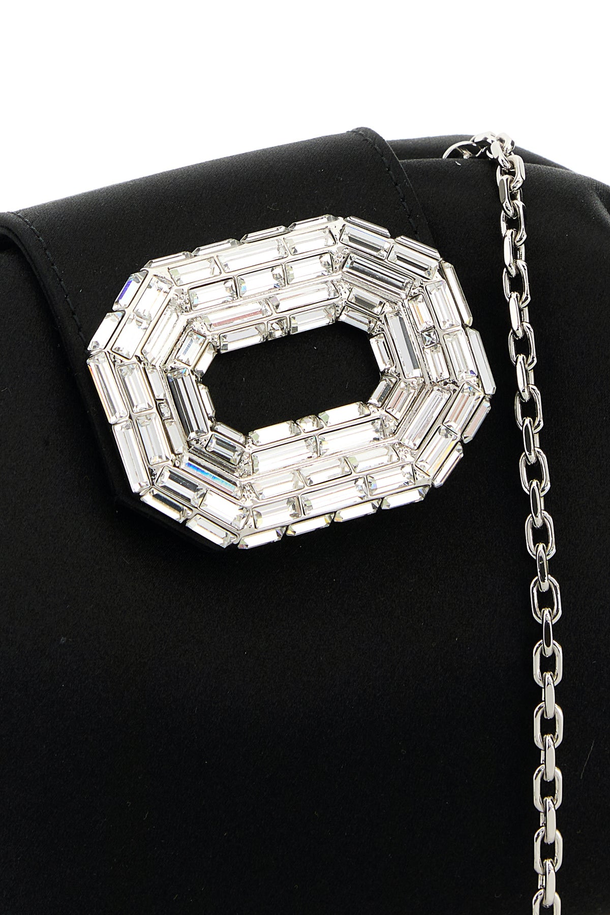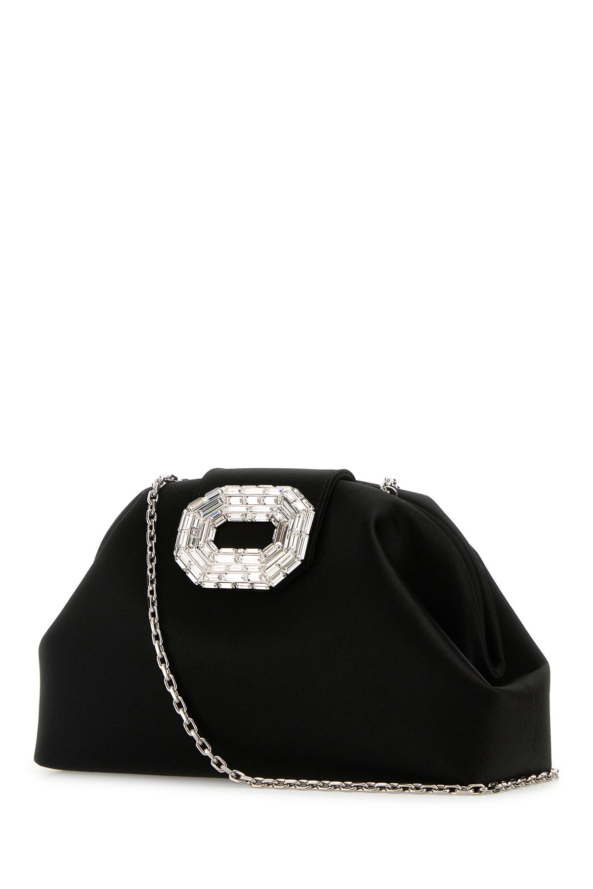 Clutch realizzata in raso arricchita da decorazione gioiello sulla parte frontale.
