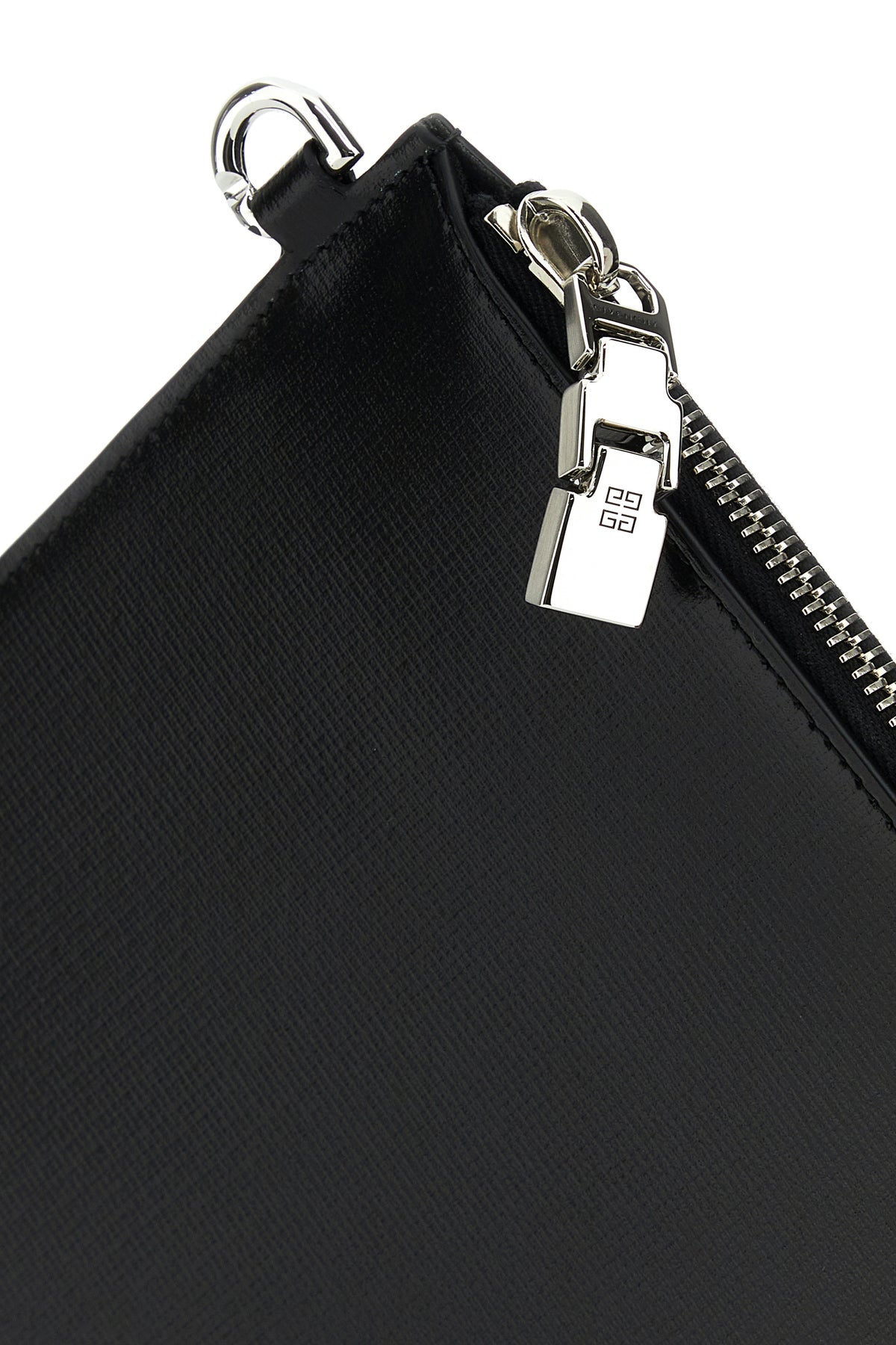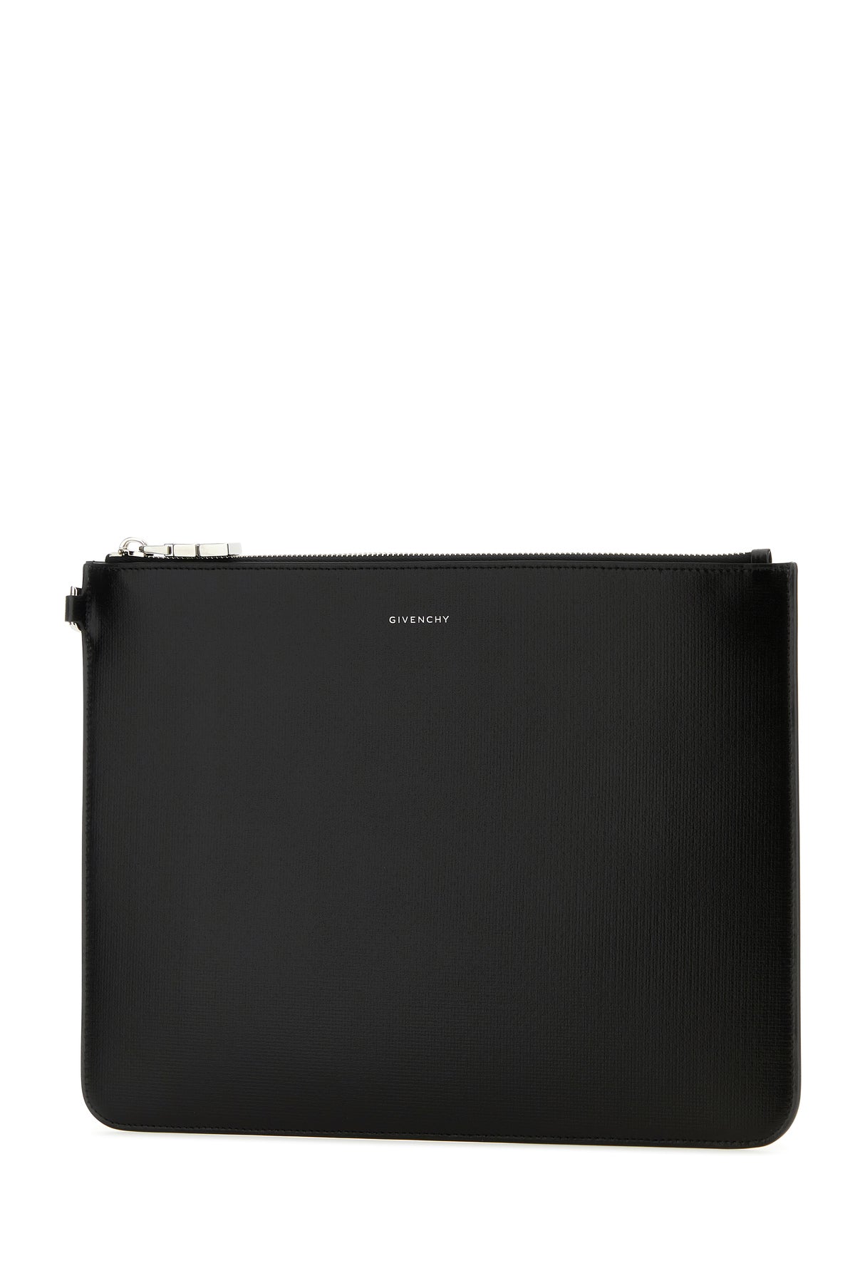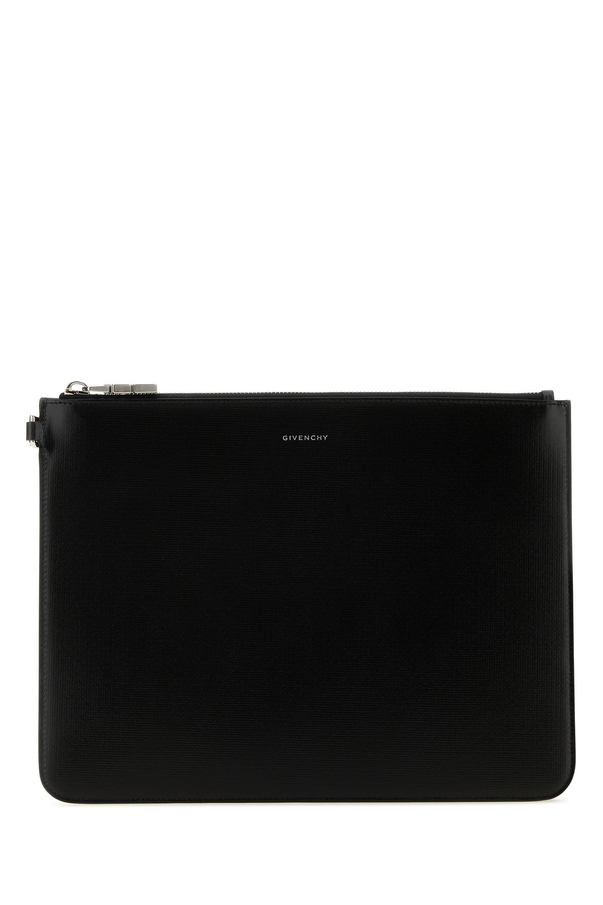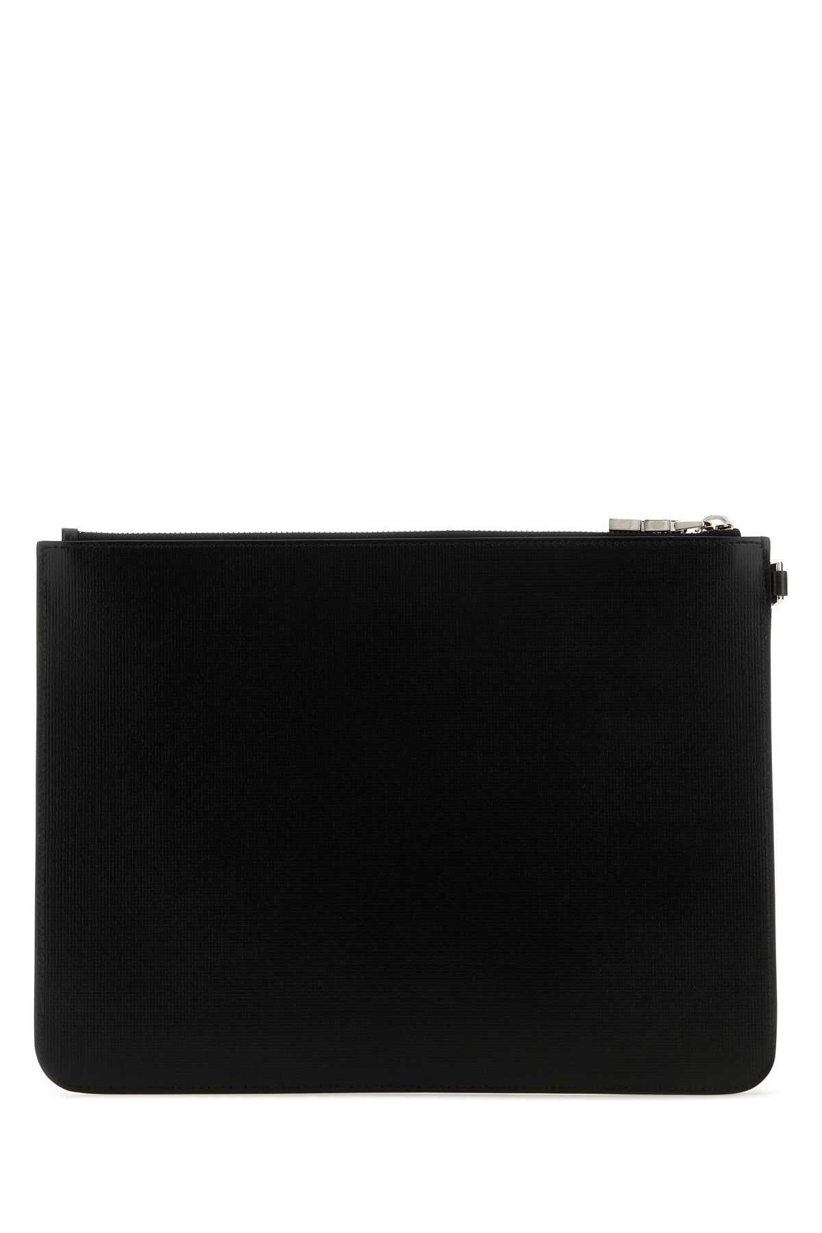 Clutch realizzata in pelle di vitello zigrinata caratterizzata da logo stampato laminato sulla parte frontale.