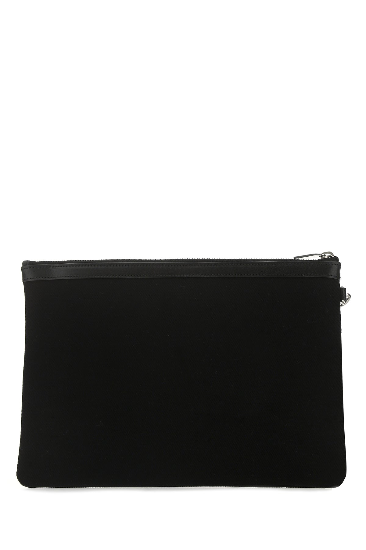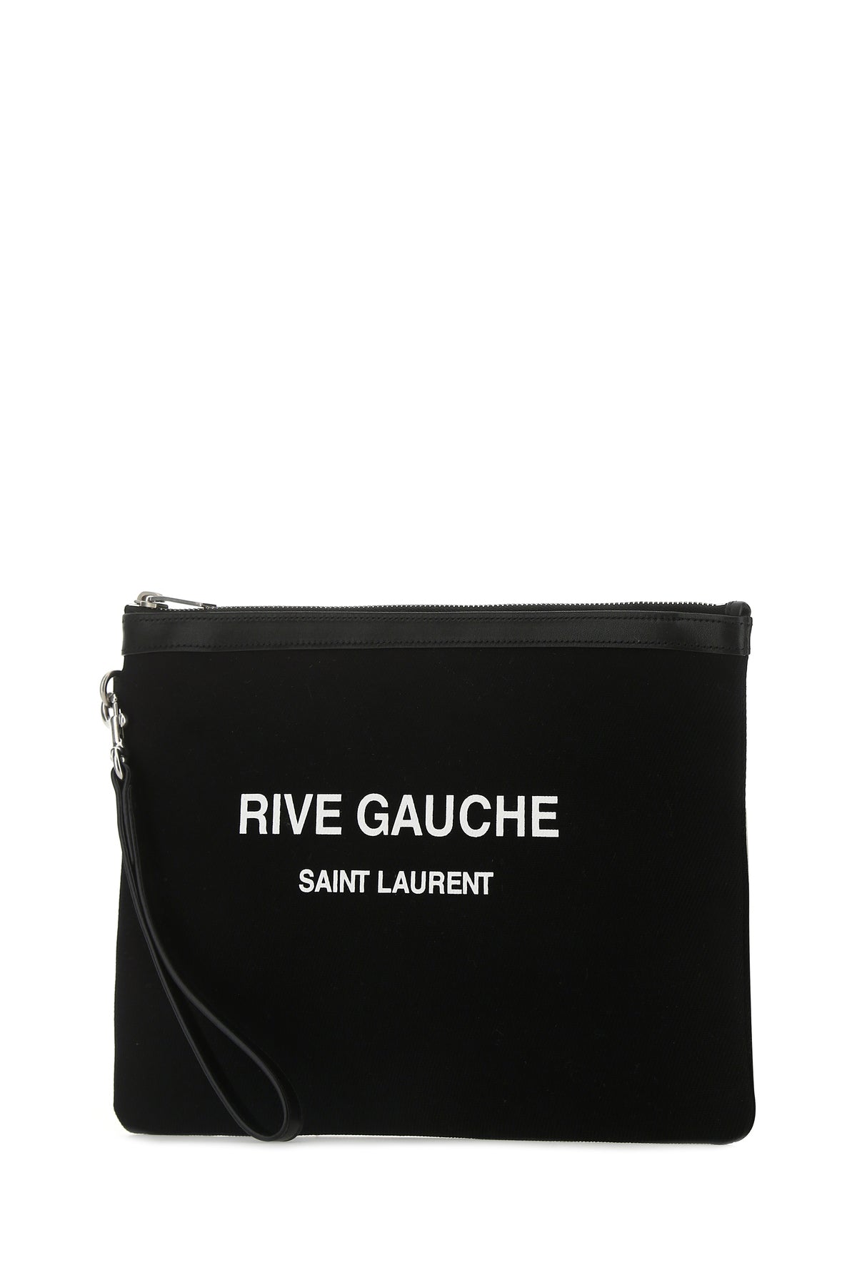 Clutch realizzata in tela di puro cotone con inserto in pelle tonale caratterizzata da stampa Rive Gauche a contrasto sulla parte frontale.