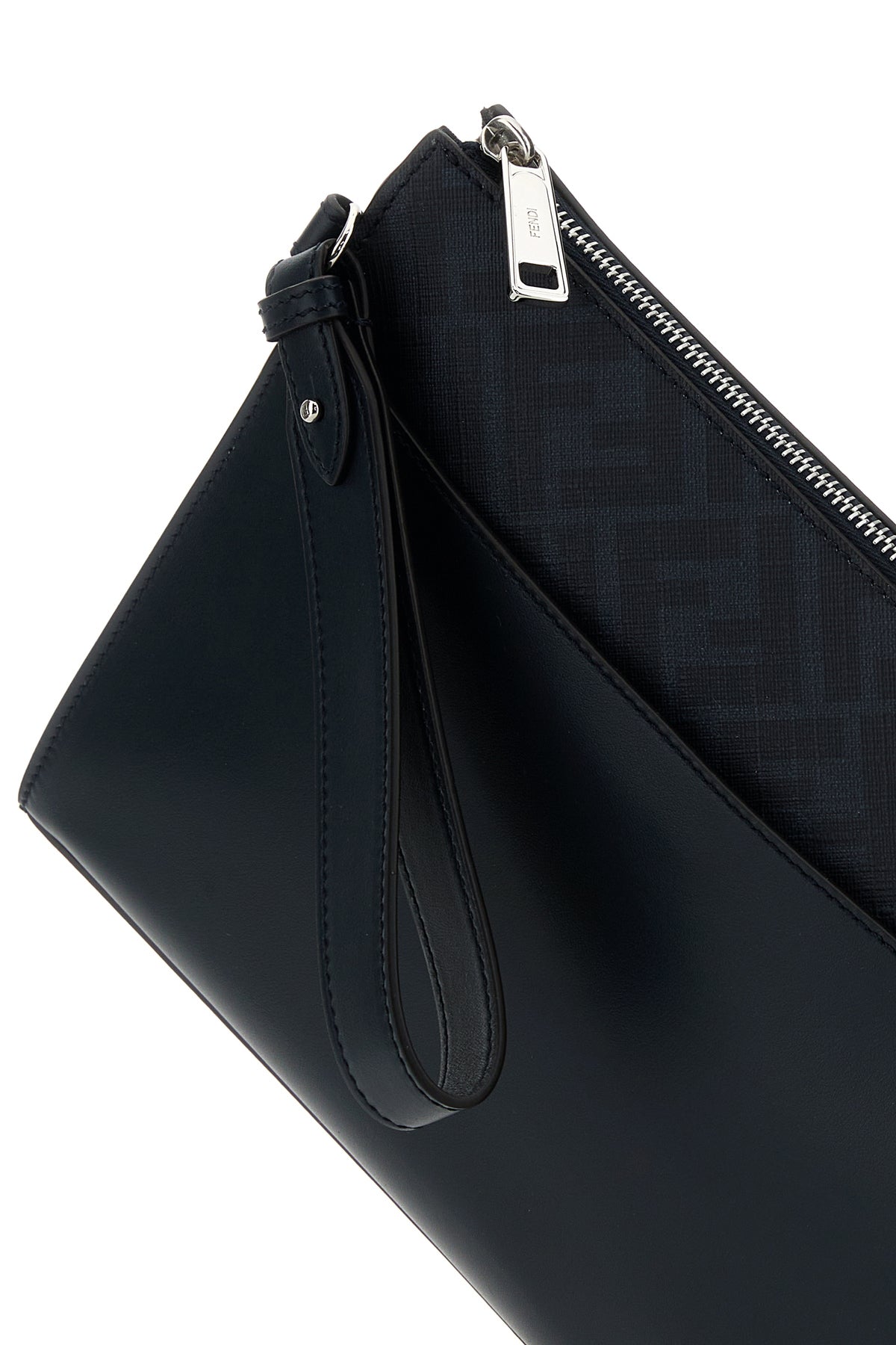 Clutch realizzata in pelle liscia con inserto in tela rivestita sulla parte superiore caratterizzata da stampa FF sulla parte superiore arricchita da dettaglio metallico FF sulla parte frontale.