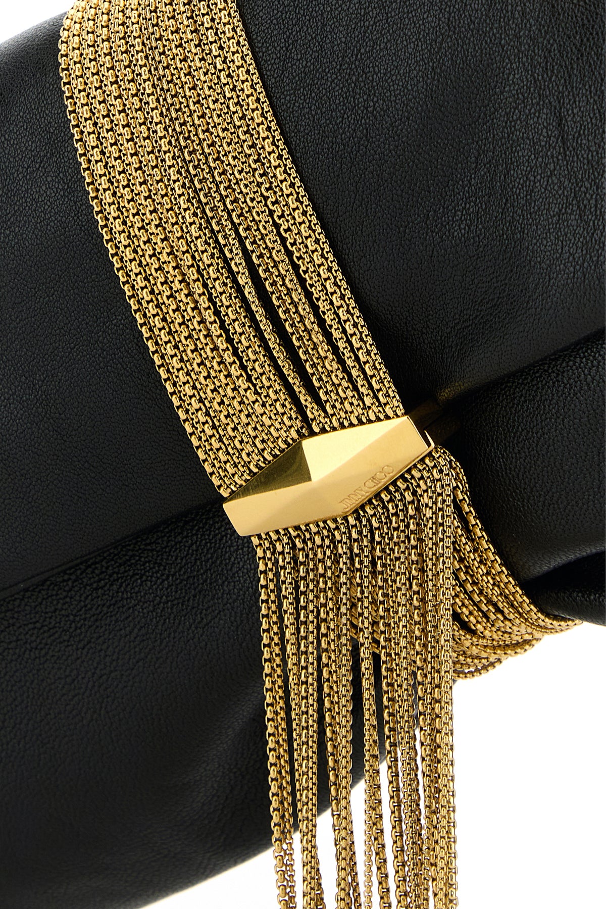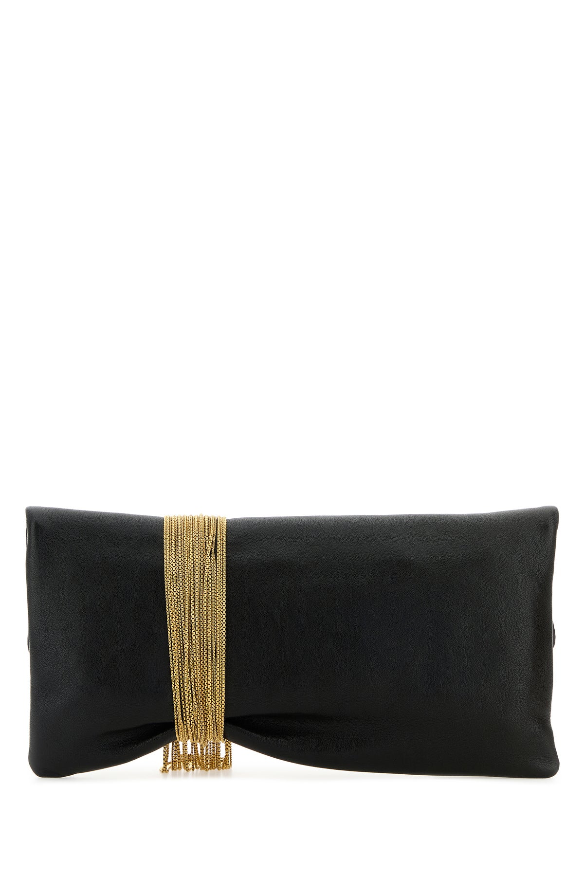 Clutch realizzata in pelle martellata arricchita da decorazione metallica logata con frange.