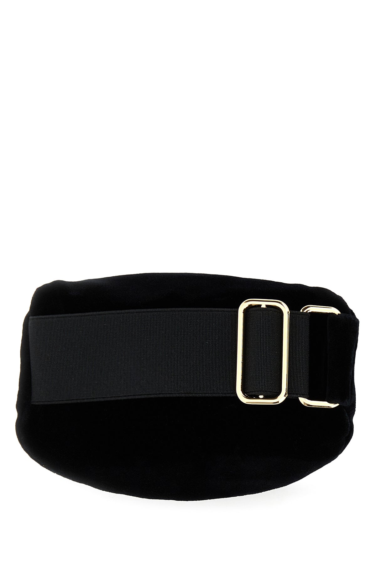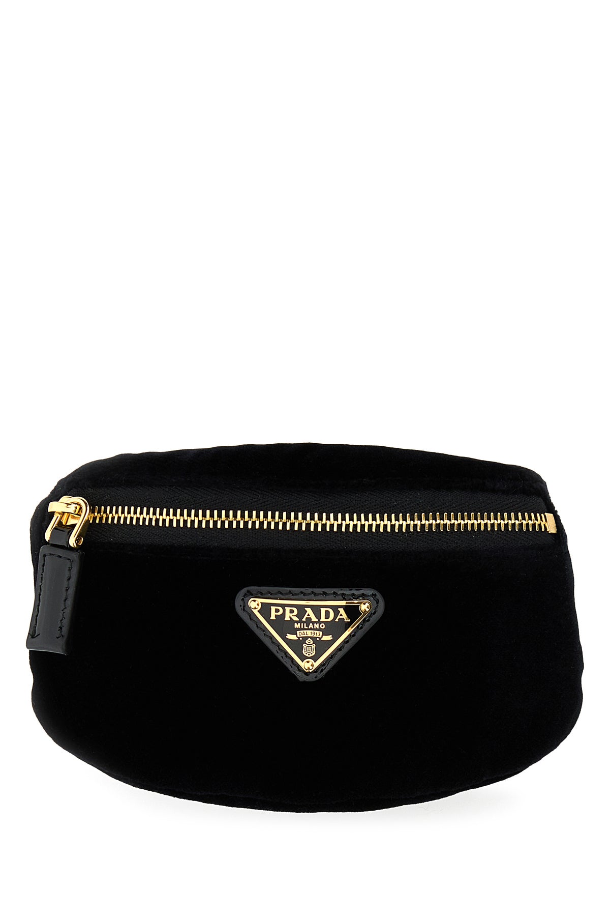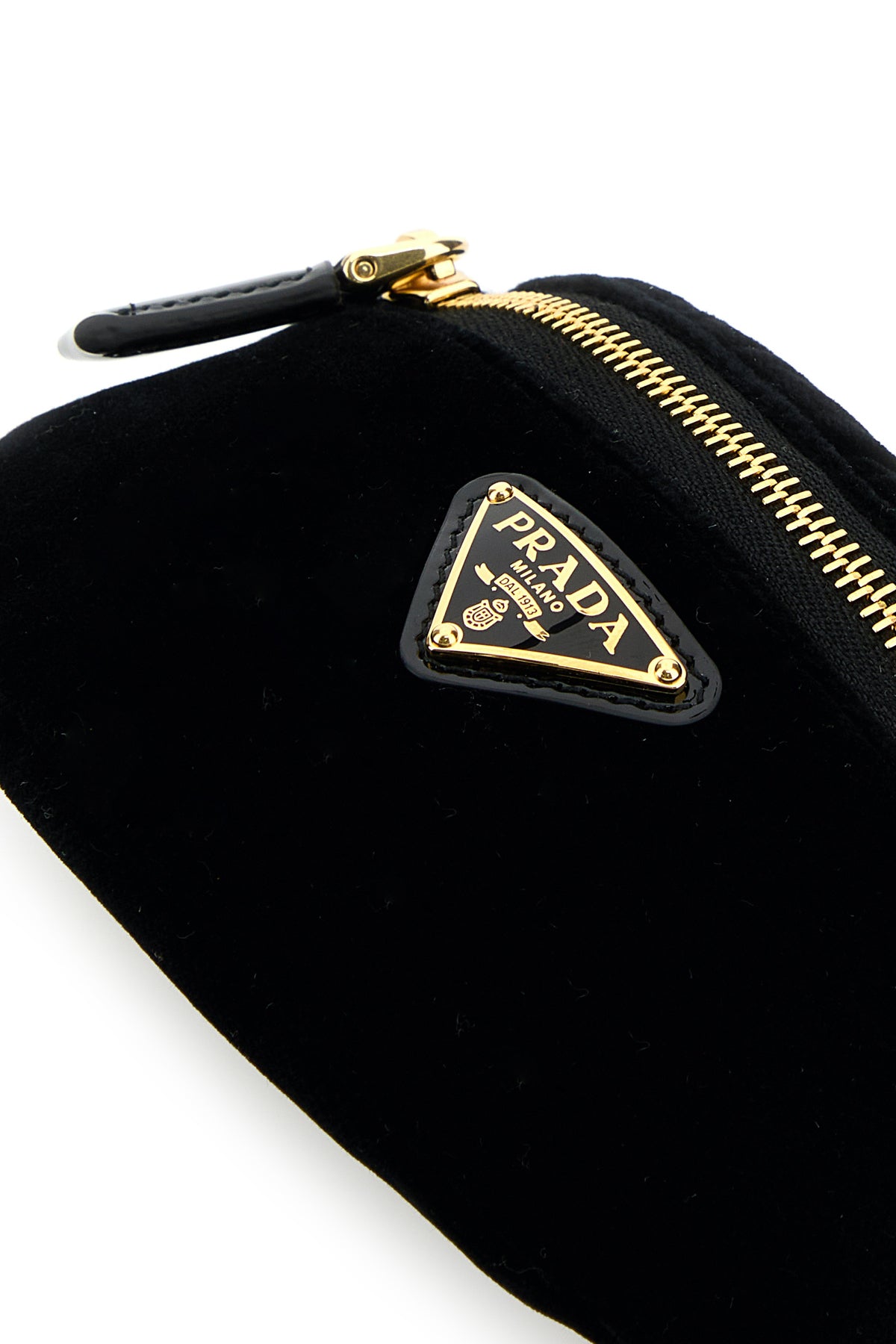 Contenitore da polso realizzato in velluto arricchito da iconico triangolo metallico logato sulla parte frontale.