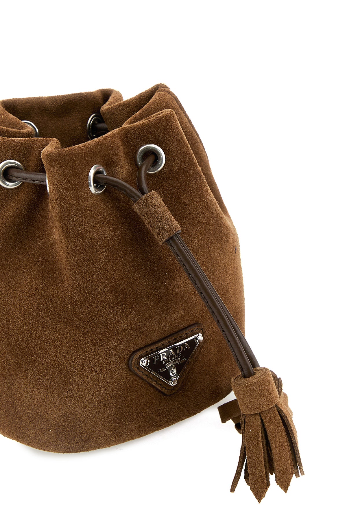 Contenitore realizzato in pelle scamosciata arricchito da iconico triangolo metallico logato sulla parte frontale.