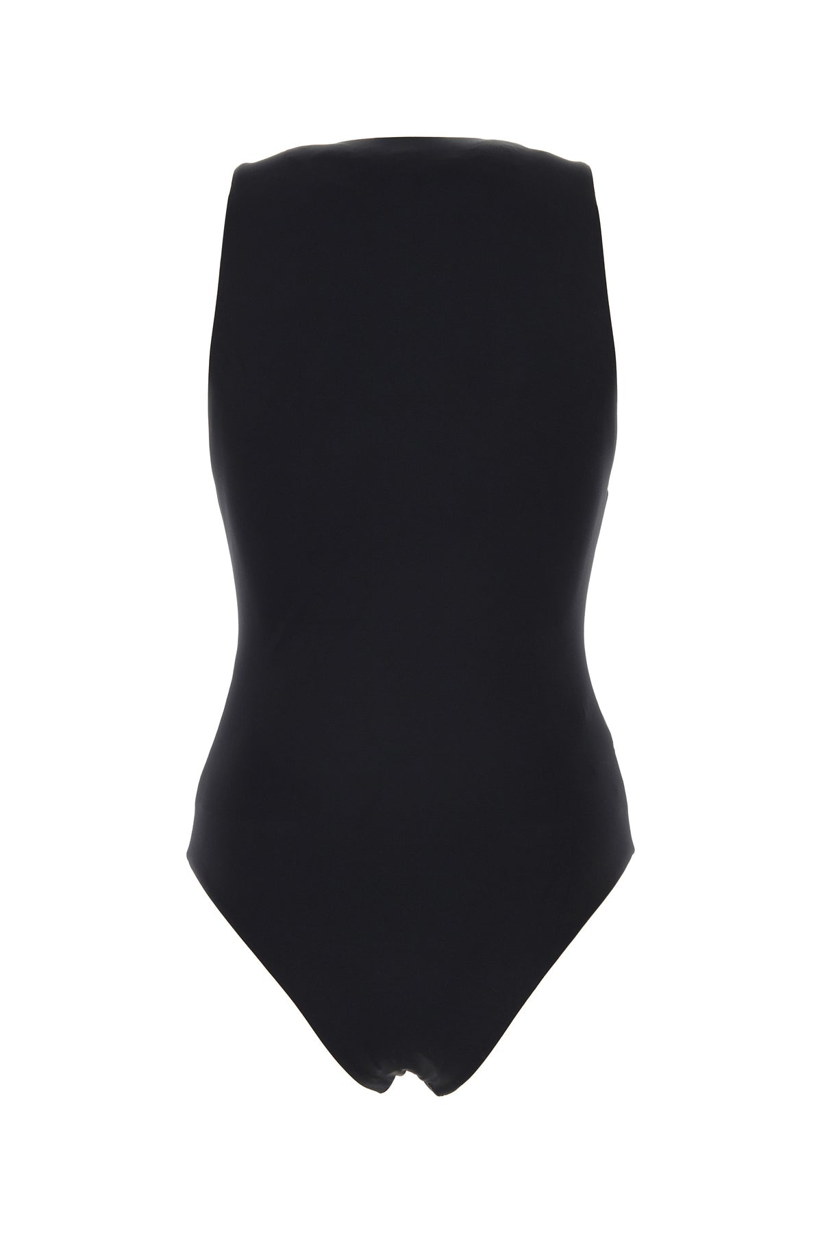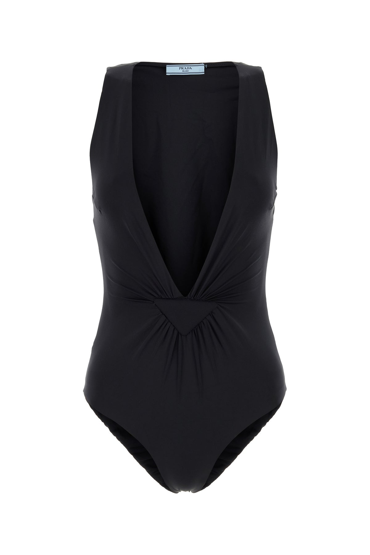 Costume intero realizzato in nylon stretch arricchito da iconico triangolo tonale in tessuto sulla parte frontale.