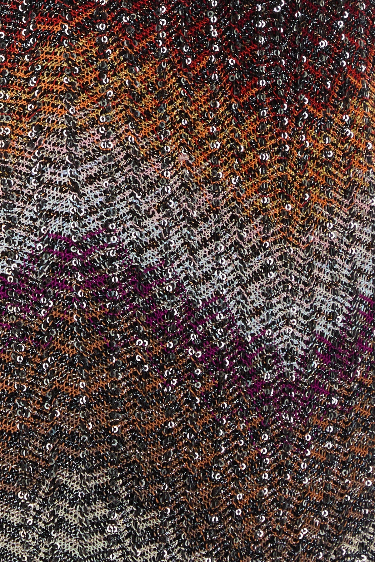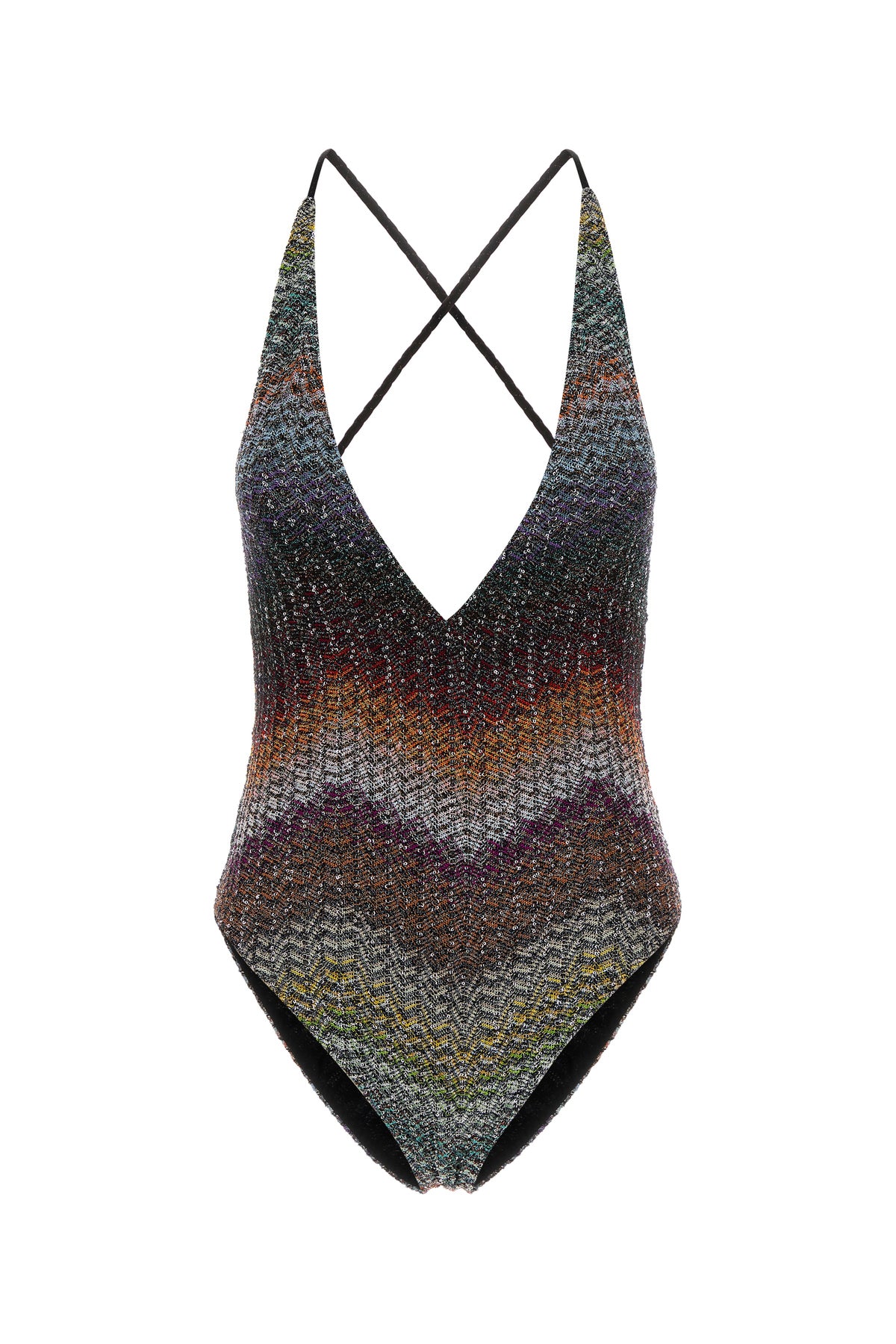 Costume intero realizzato in misto viscosa con fili in lurex caratterizzato da ricamo a motivo zig zag su tutta la superficie arricchito da paillettes.