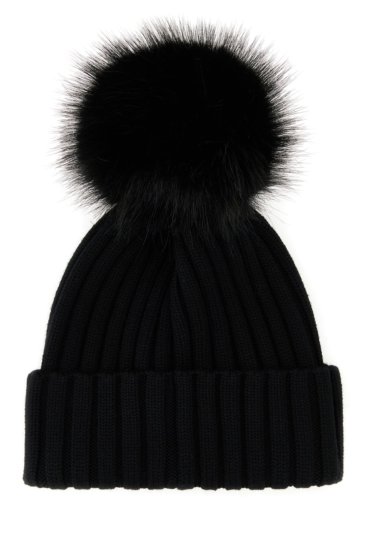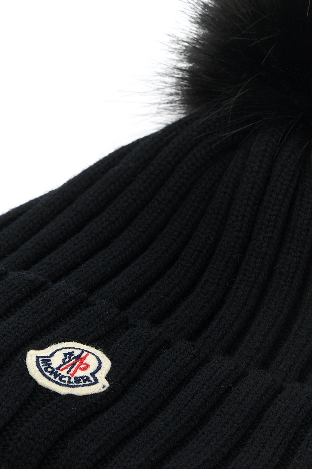 Cuffia realizzata in pura lana vergine a costine arricchita da applicazione logata a contrasto sulla parte frontale e ponpon in eco pelliccia tonale.