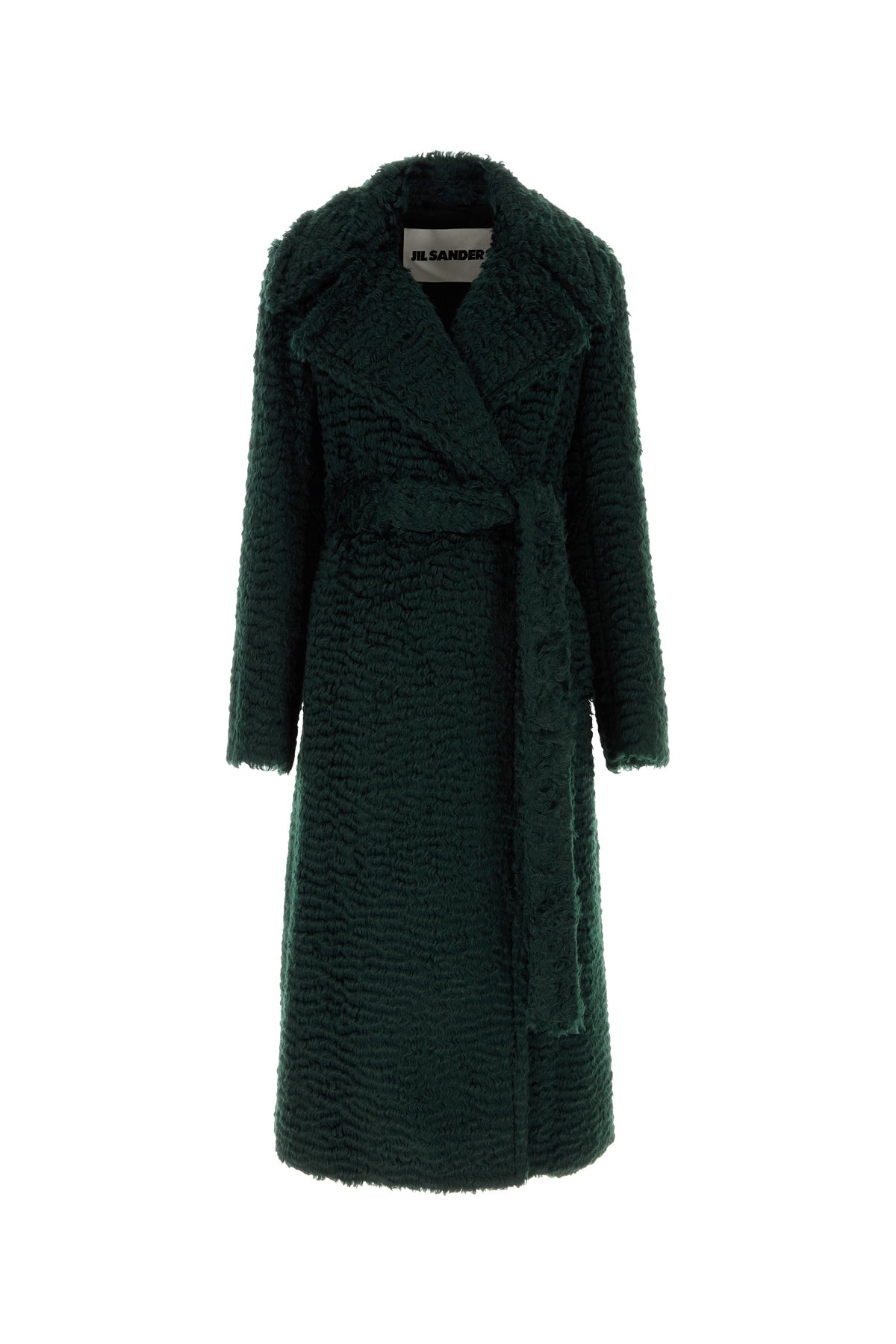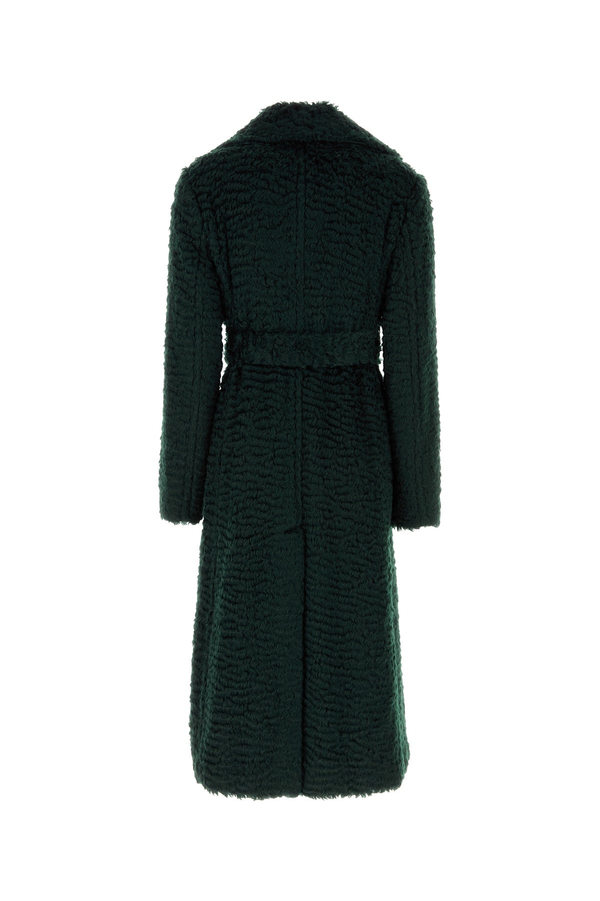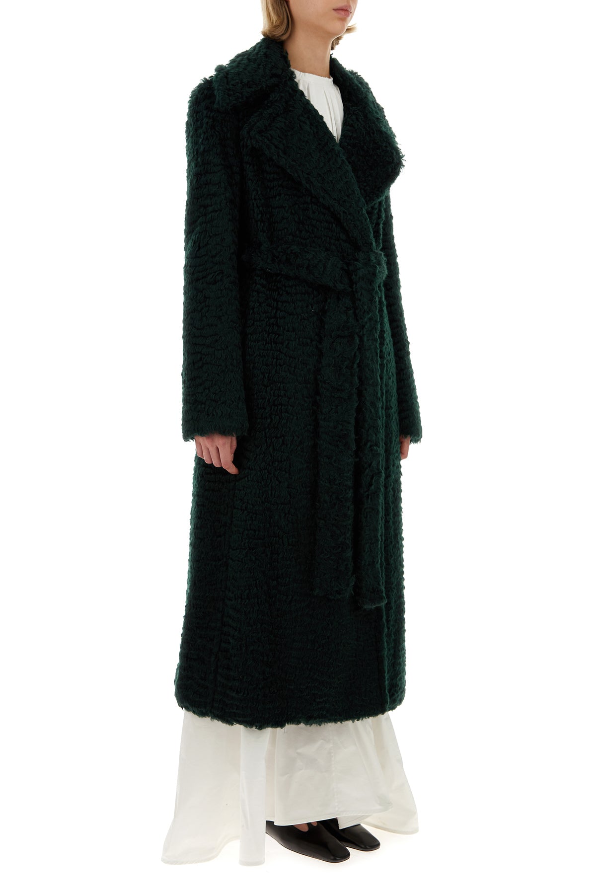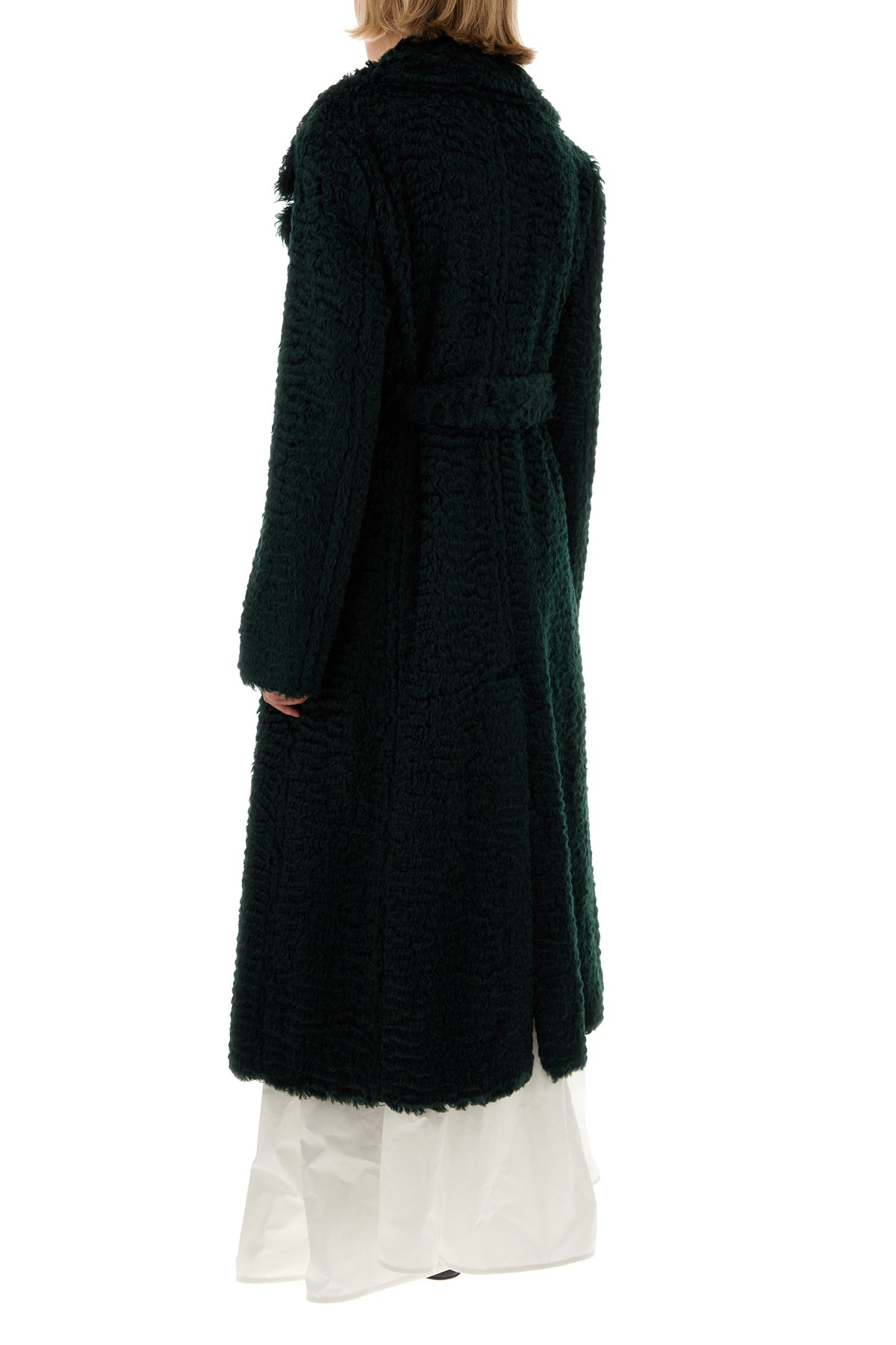 Eco pelliccia arricchita da cintura amovibile in tessuto tonale in vita.