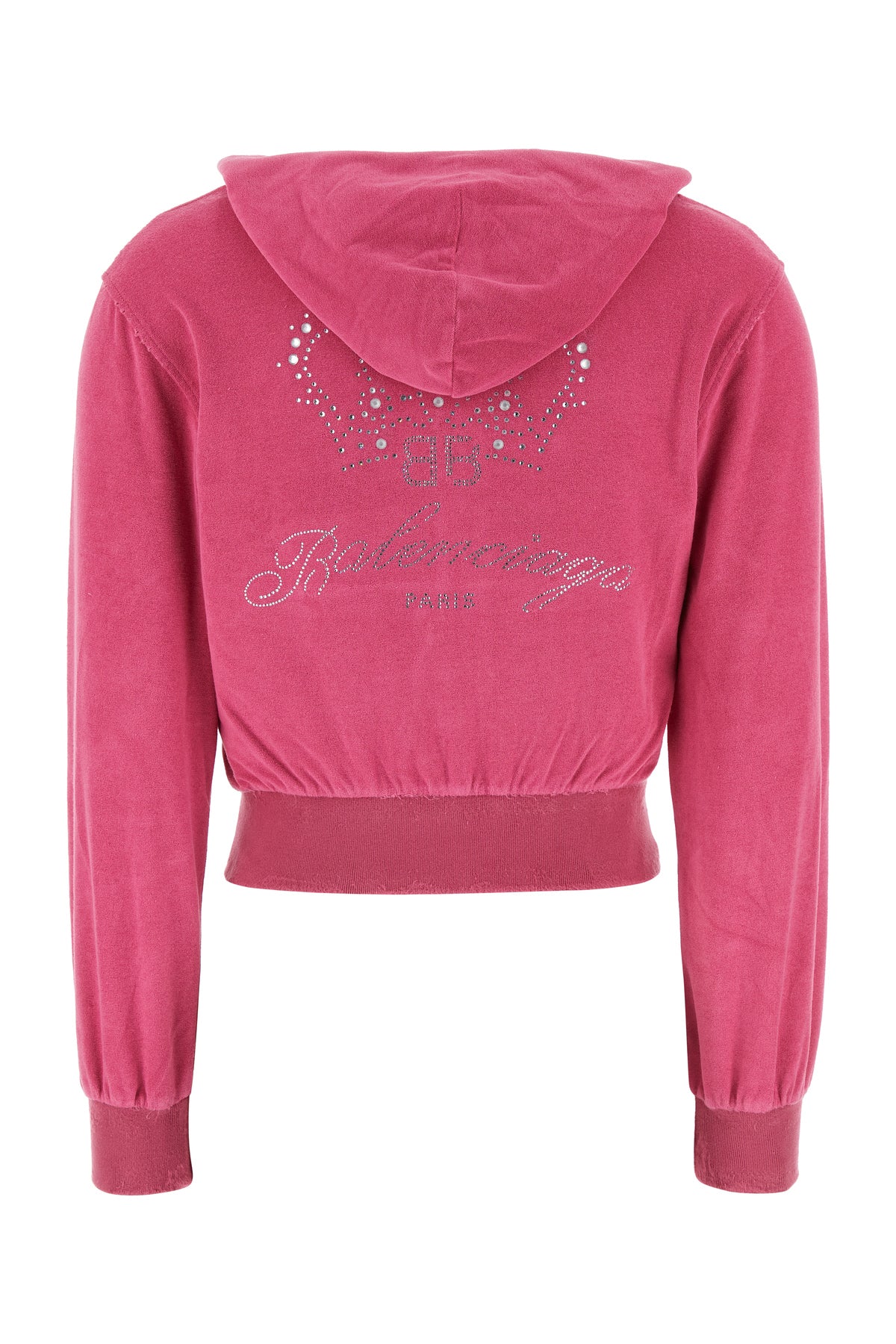 Felpa dal taglio corto realizzata in ciniglia di misto cotone effetto sdrucito caratterizzata da motivo BB Motel con cristalli sul retro.
