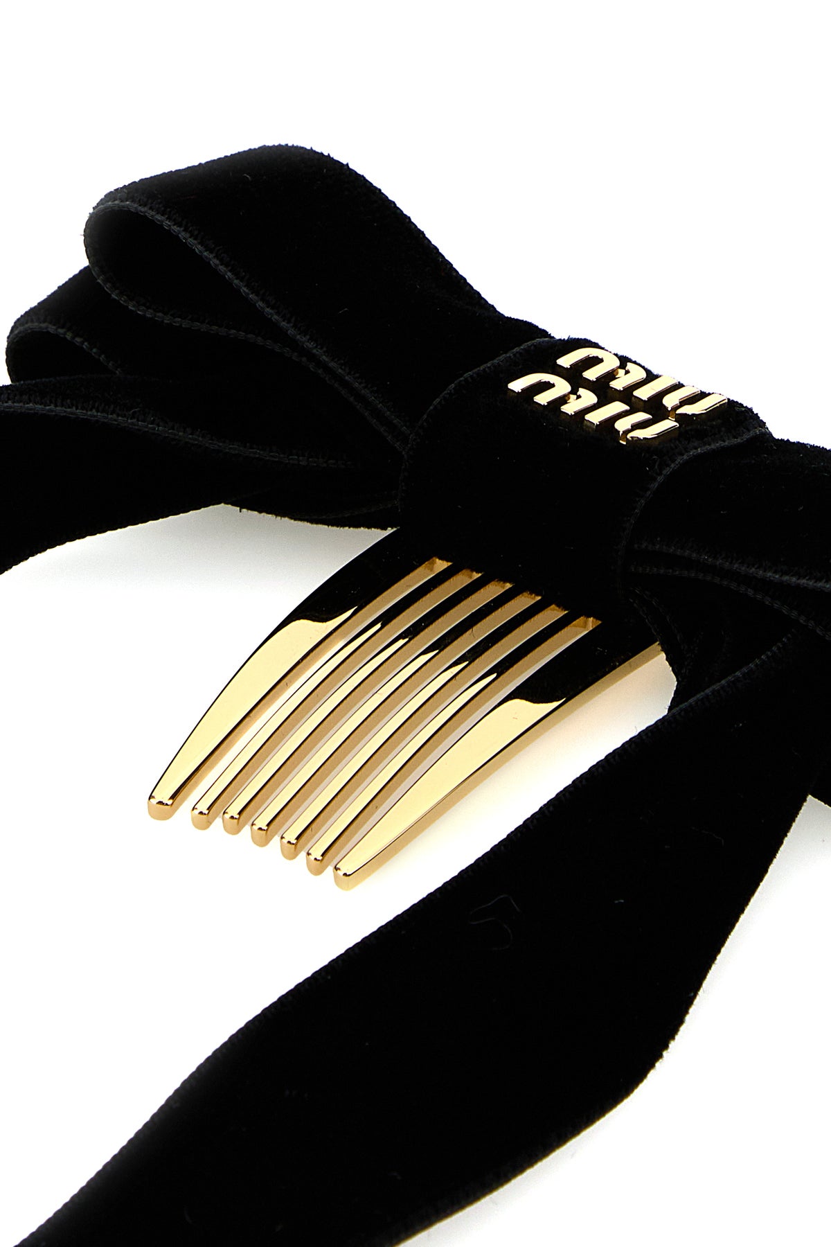 Fermaglio realizzato in velluto arricchito da logo in lettere metalliche sulla parte frontale.